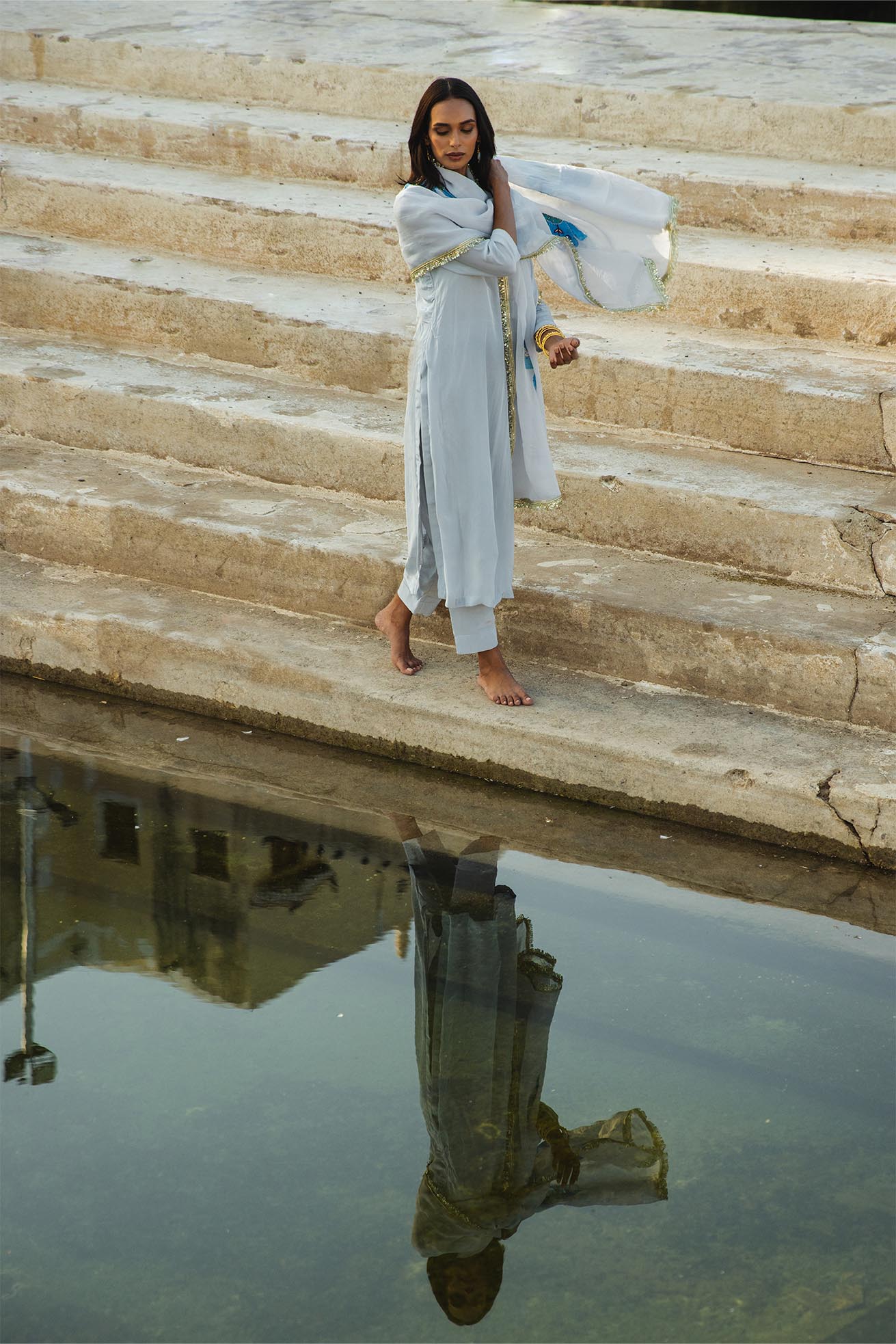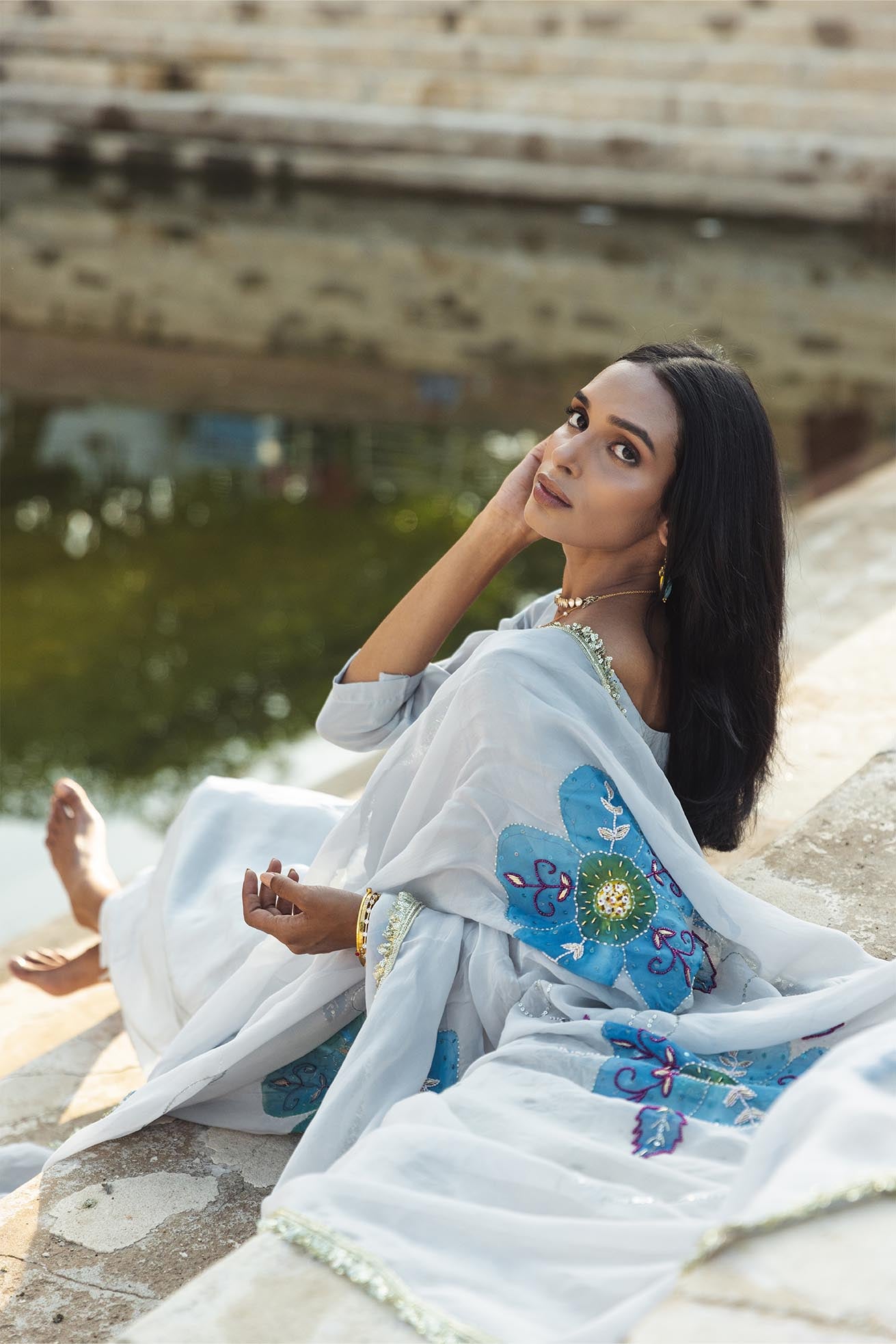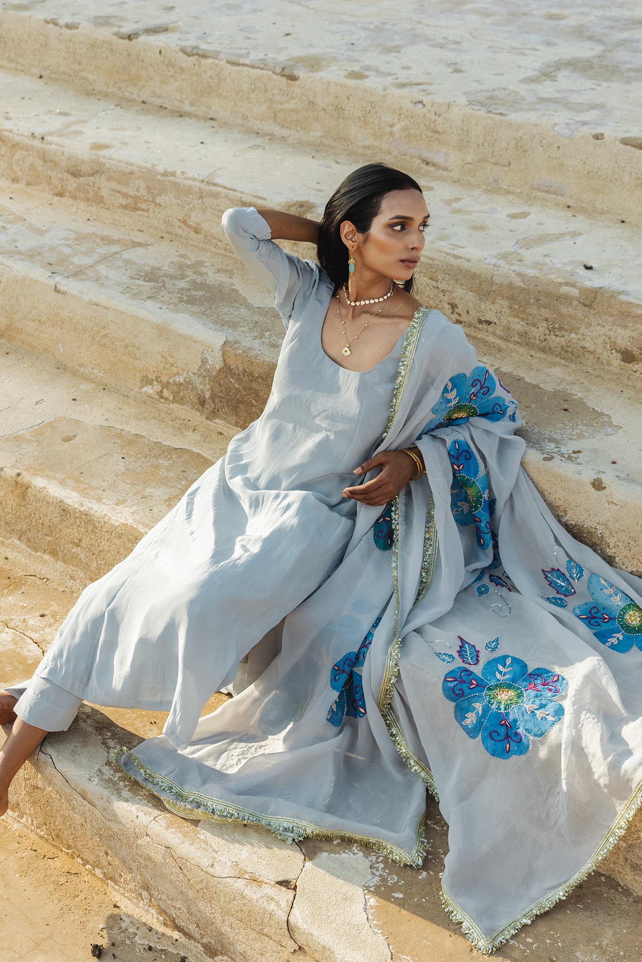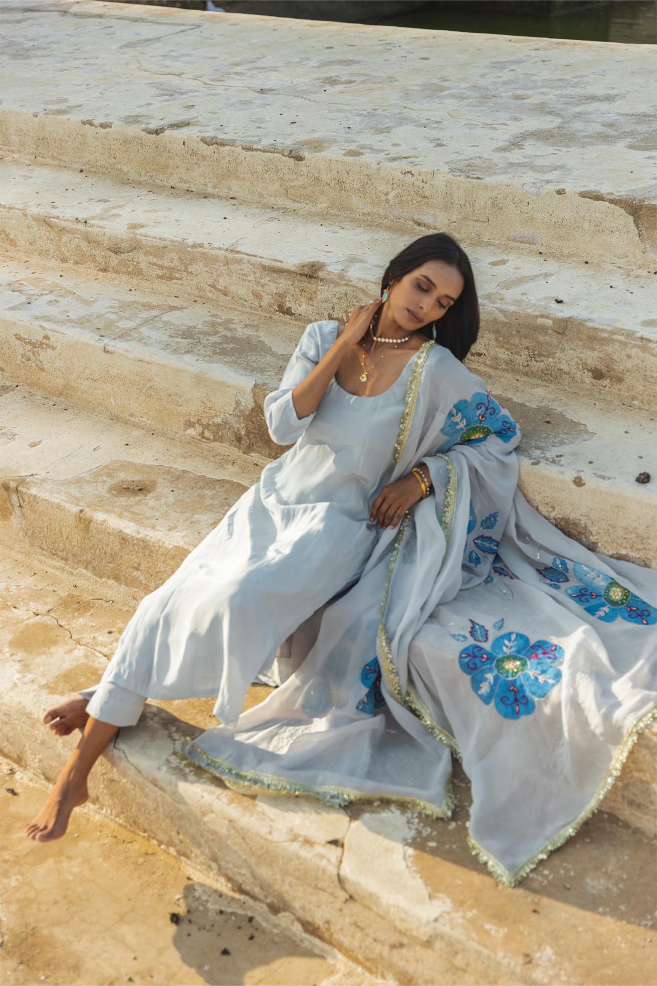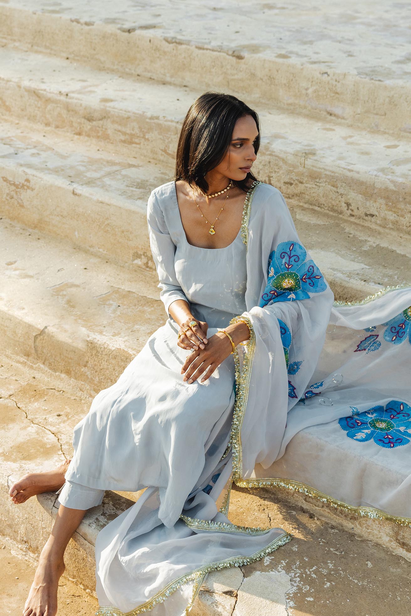 Gerade geschnittenes Anzugset aus hellgrauem Krepp von Damini mit handbemaltem und verziertem Duppatta-Set aus Organza