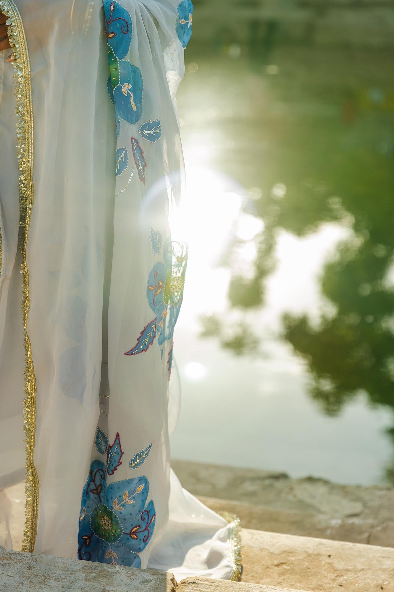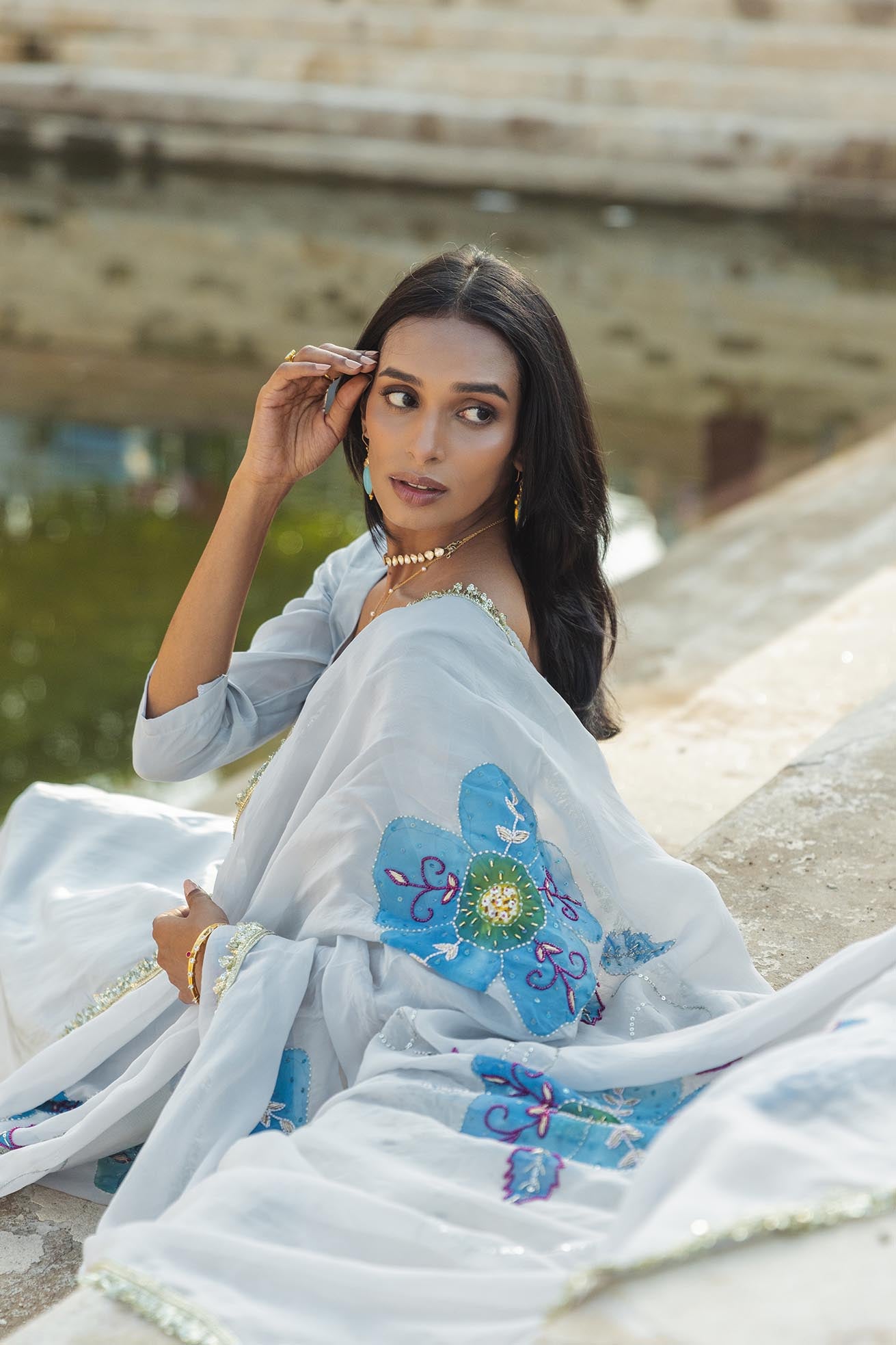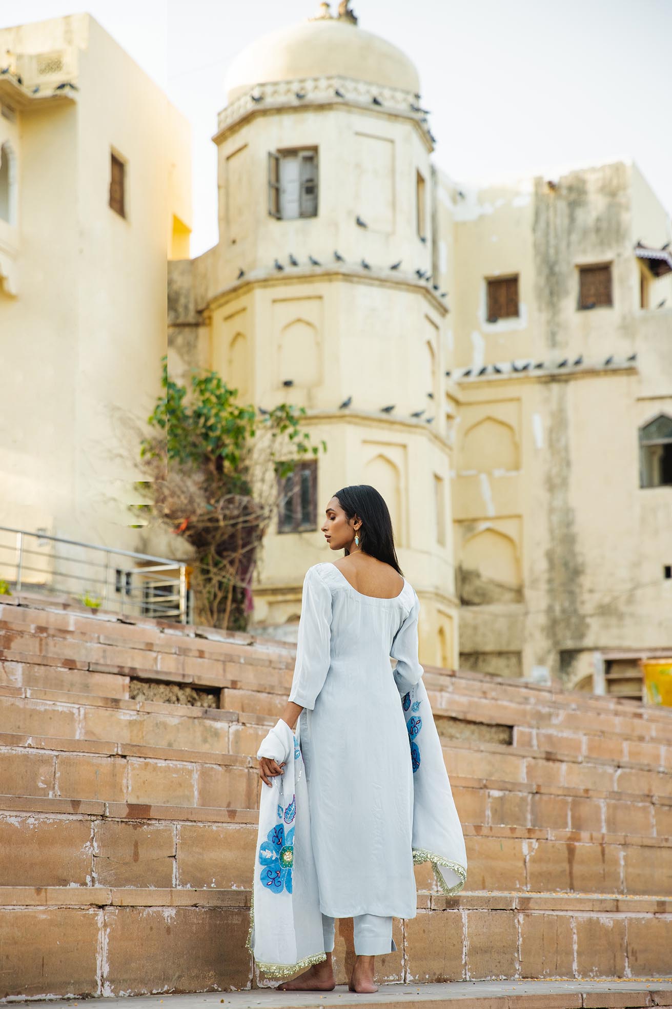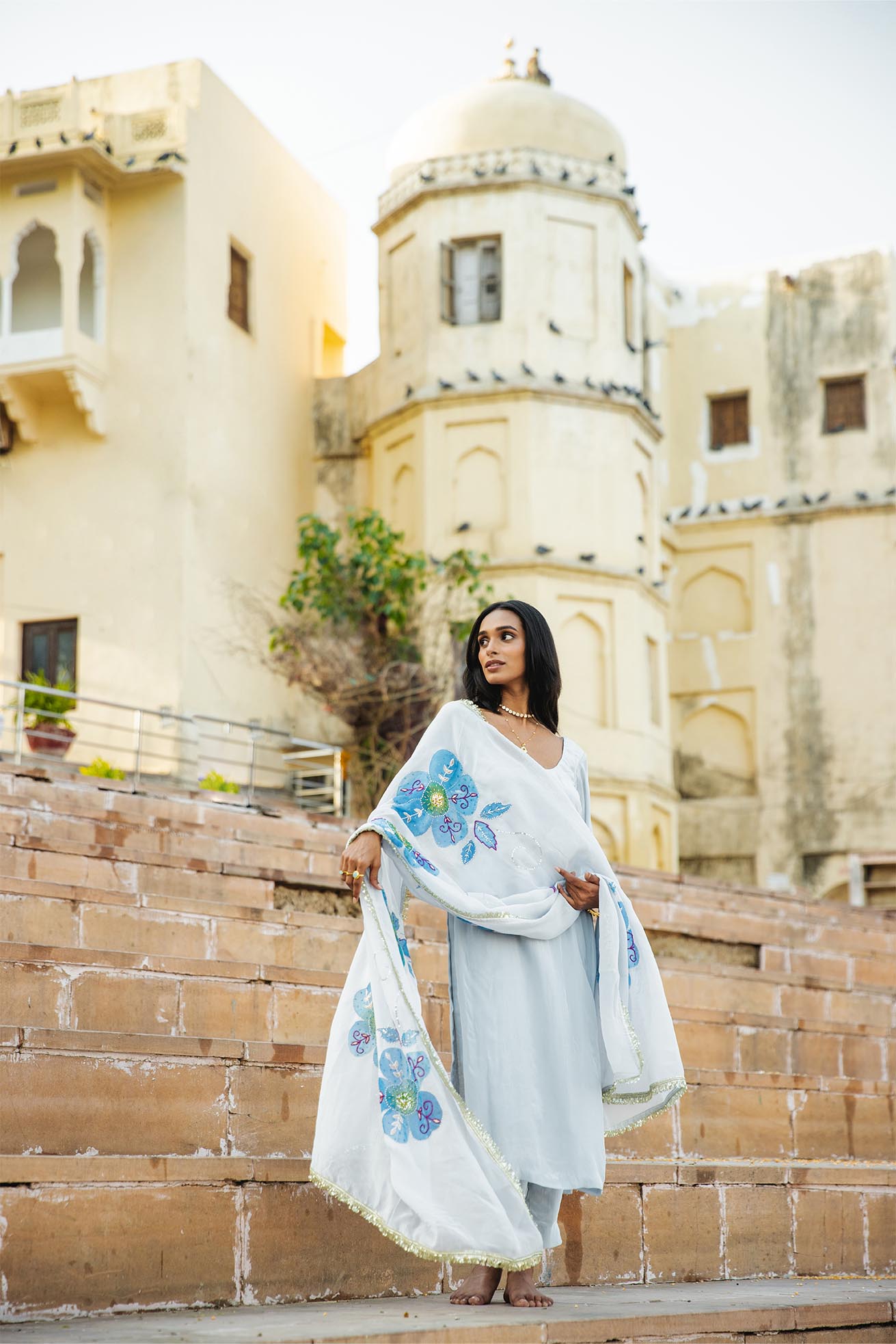 Gerade geschnittenes Anzugset aus hellgrauem Krepp von Damini mit handbemaltem und verziertem Duppatta-Set aus Organza