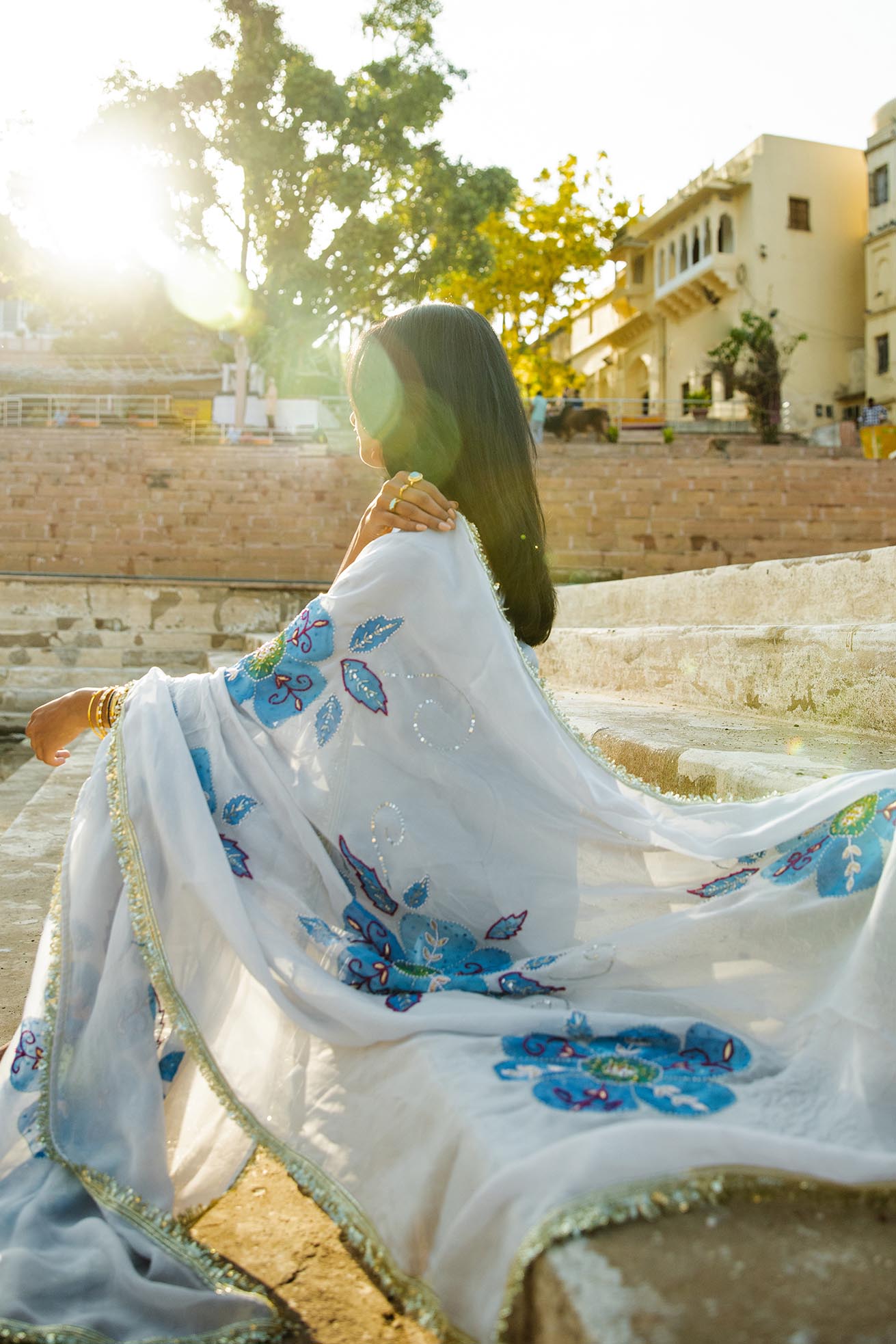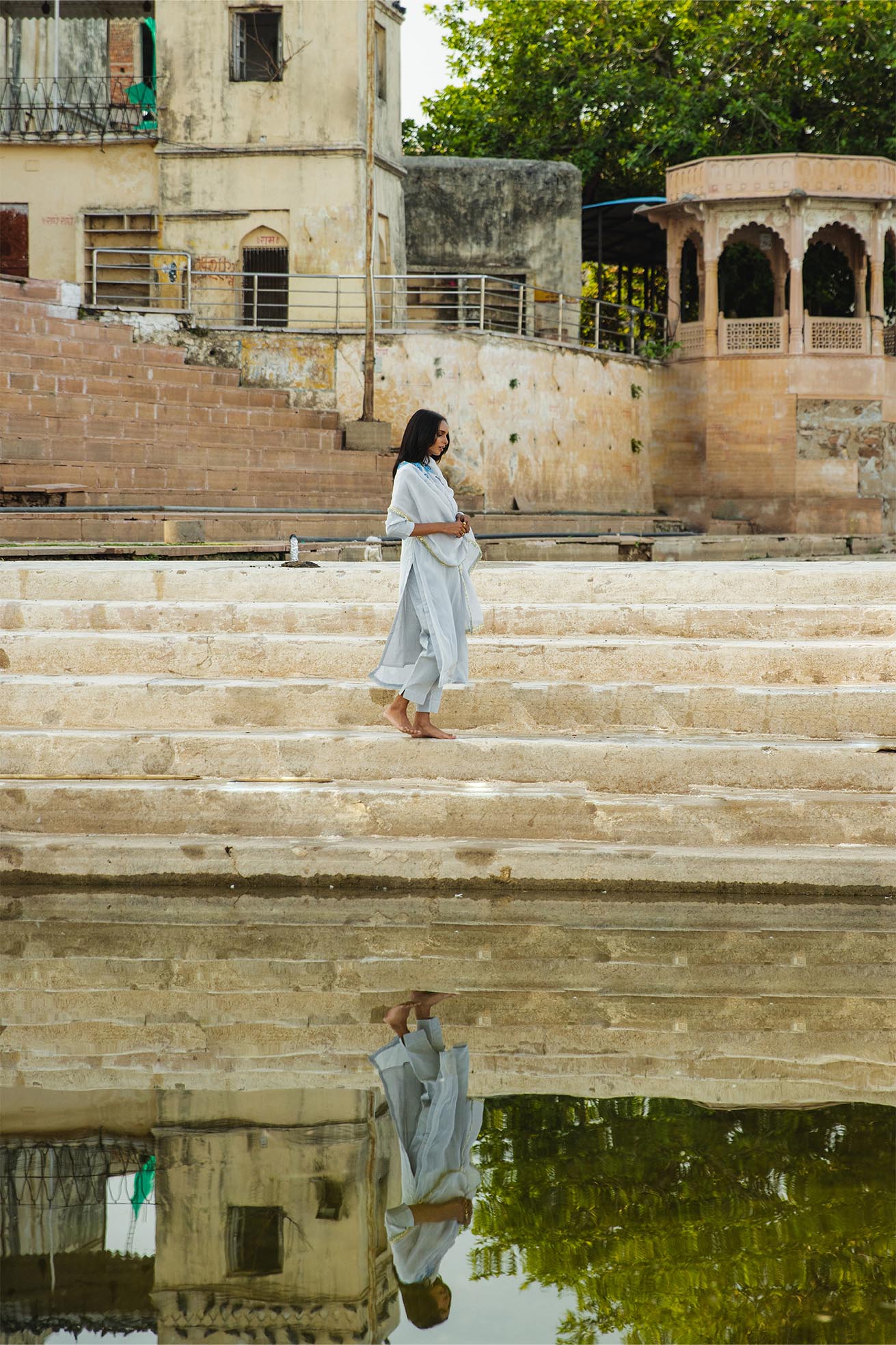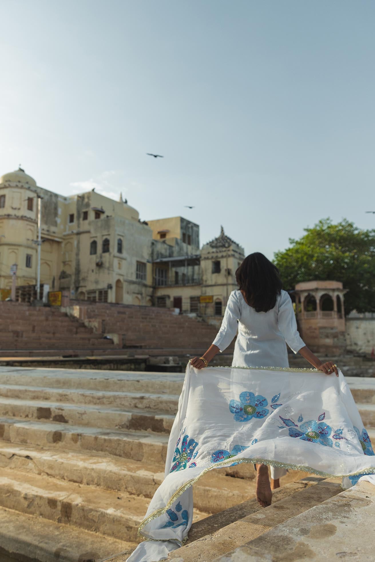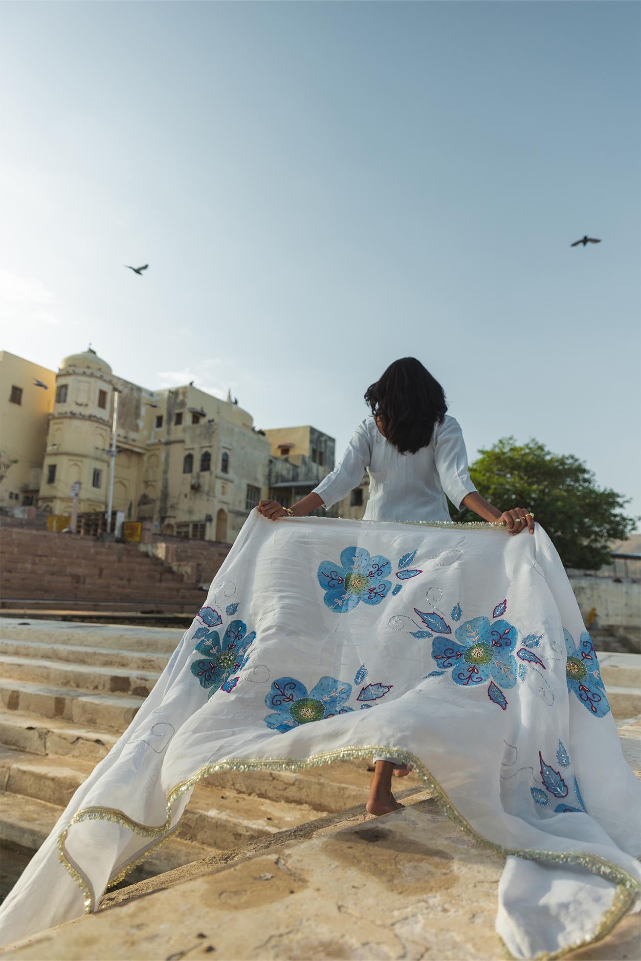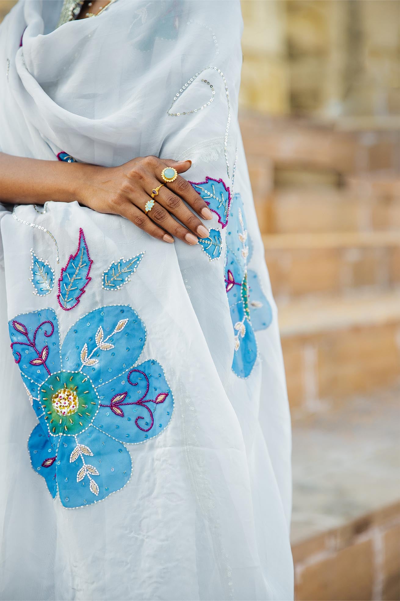 Gerade geschnittenes Anzugset aus hellgrauem Krepp von Damini mit handbemaltem und verziertem Duppatta-Set aus Organza