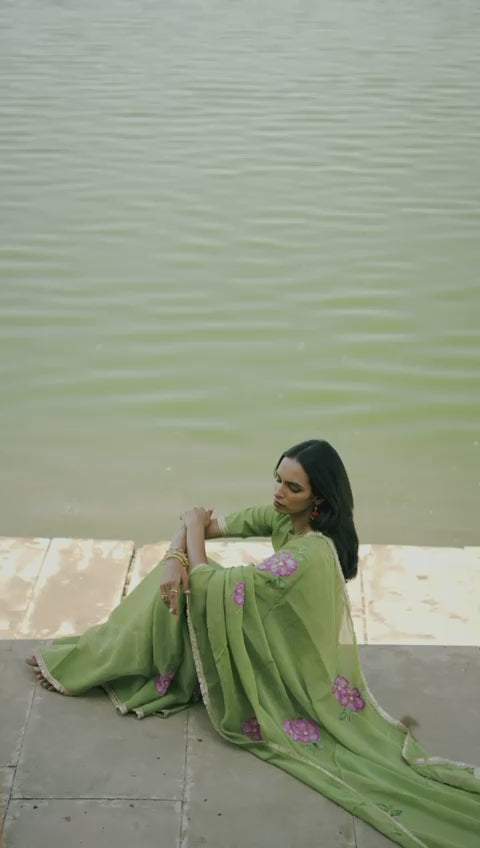 Leela Olive Green Handpainted & Hand-Embellished Organza Saree – Nirvana Collection
