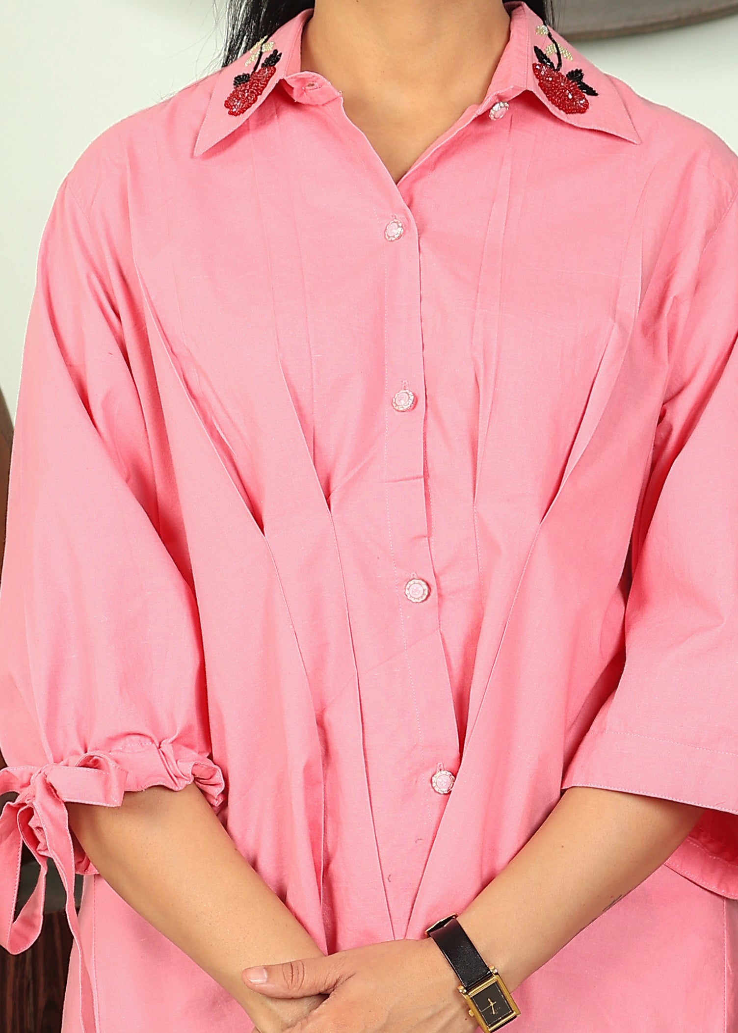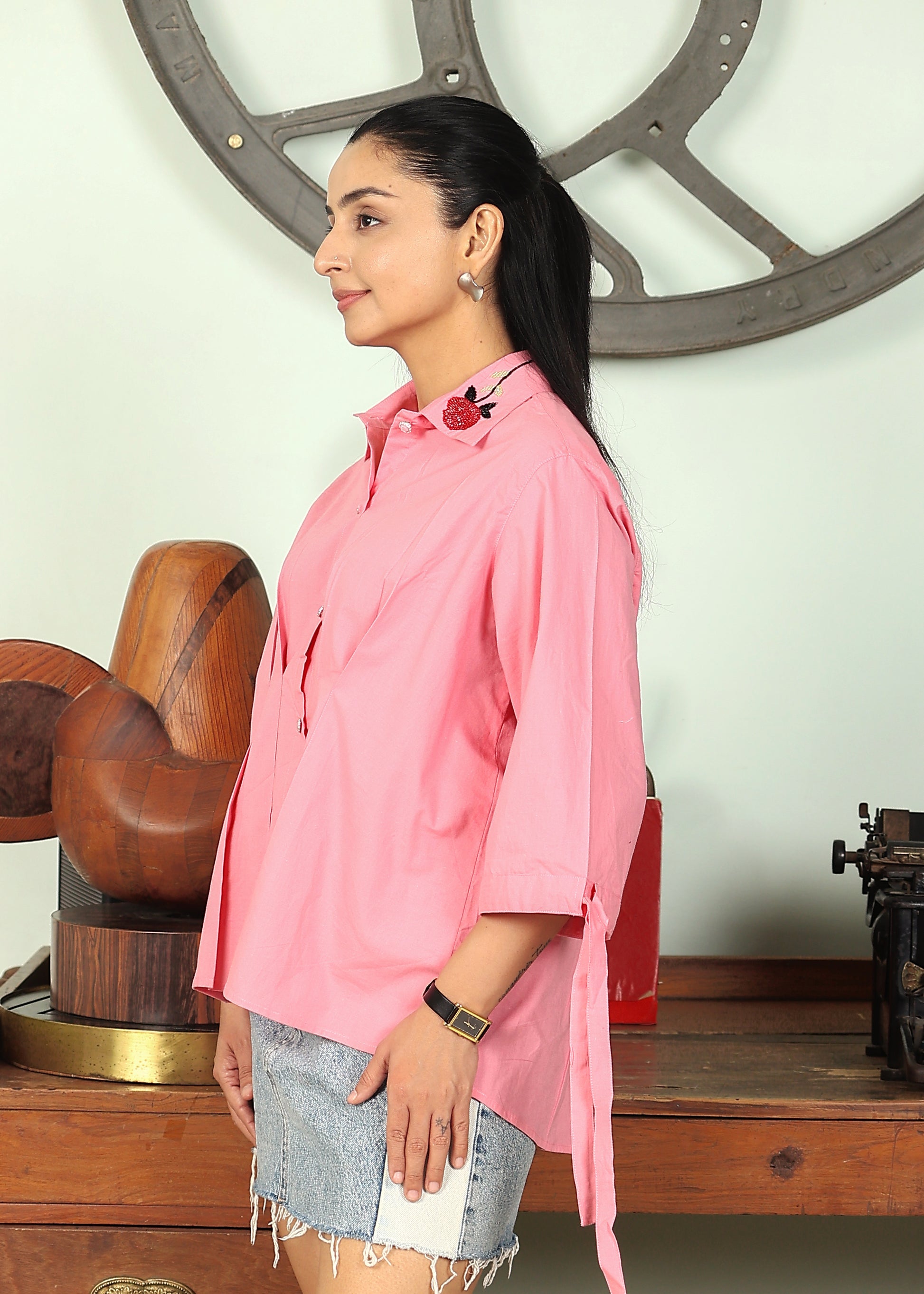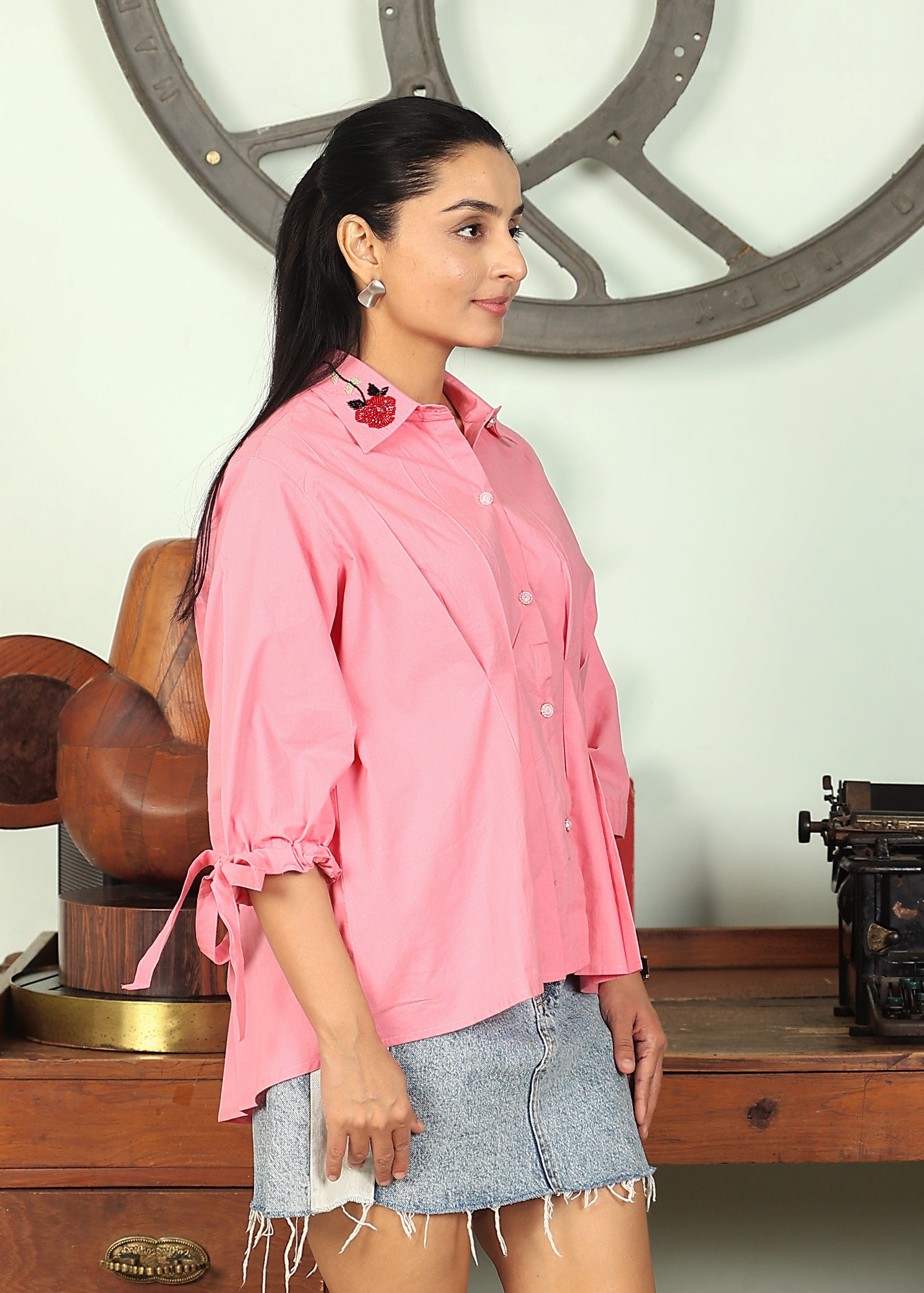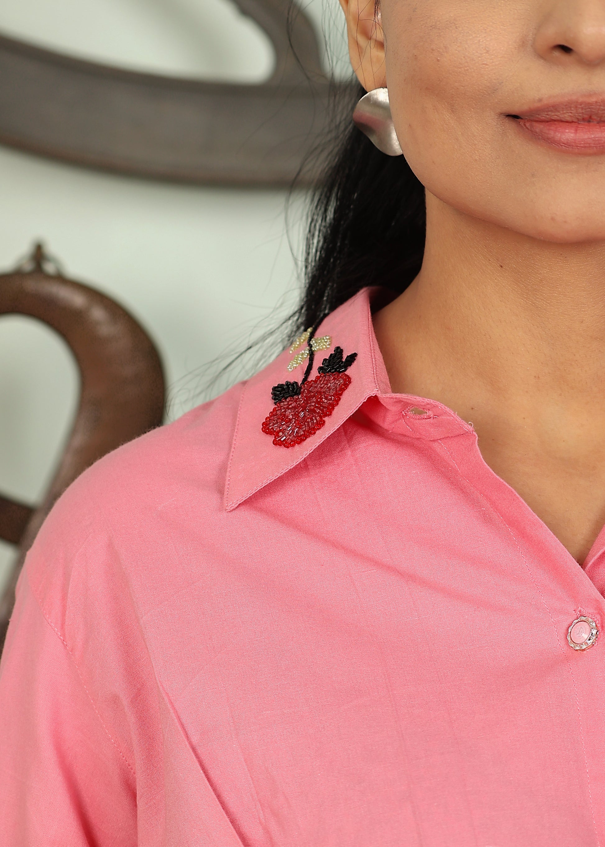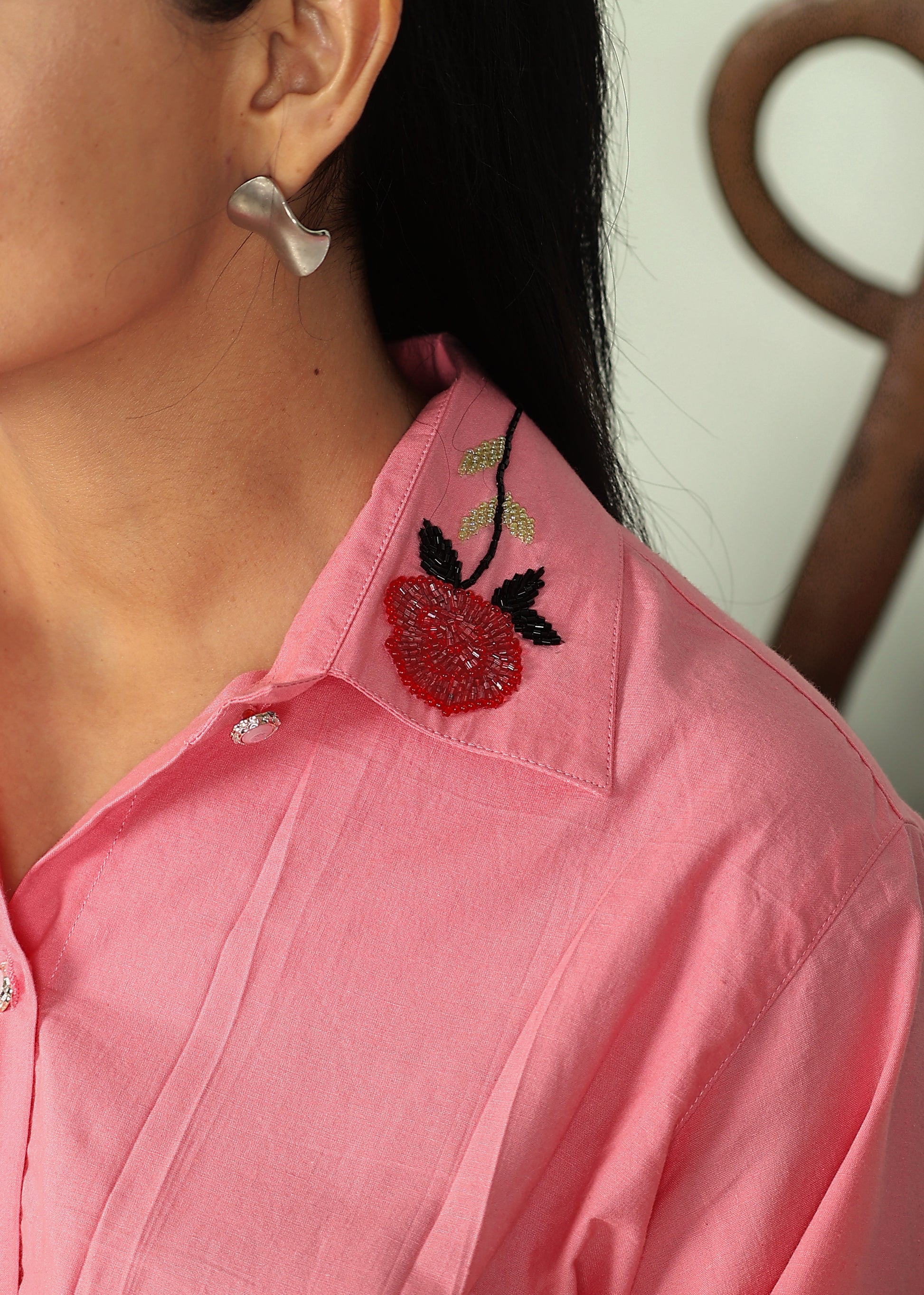 This elegant pink poplin shirt features intricate handwork on the collar, showcasing fine craftsmanship and attention to detail. The smooth, breathable fabric ensures comfort, while the delicate embroidery adds a refined touch, making it ideal for both formal and semi-formal occasions. Perfect for those who appreciate subtle yet sophisticated design elements.