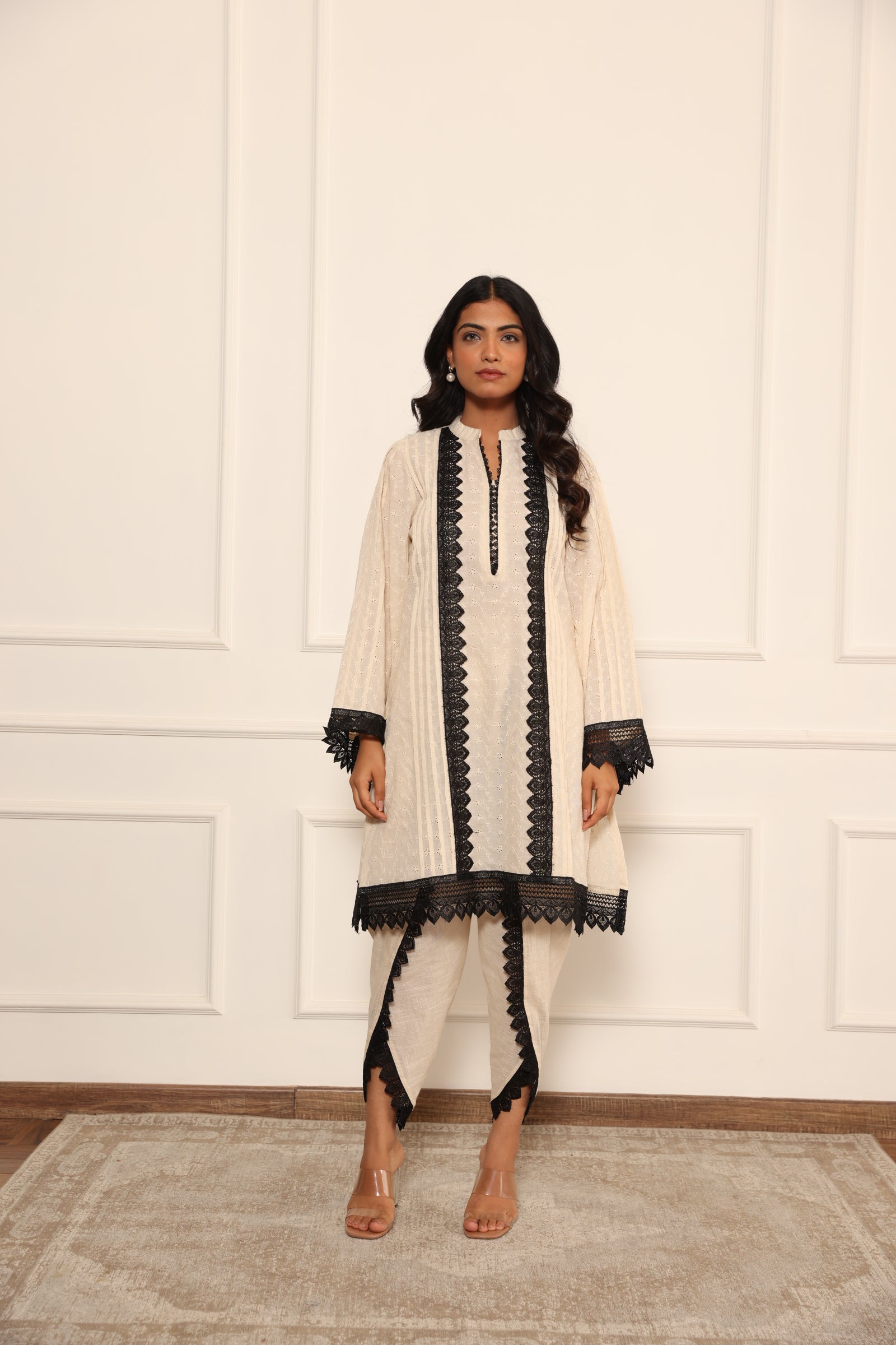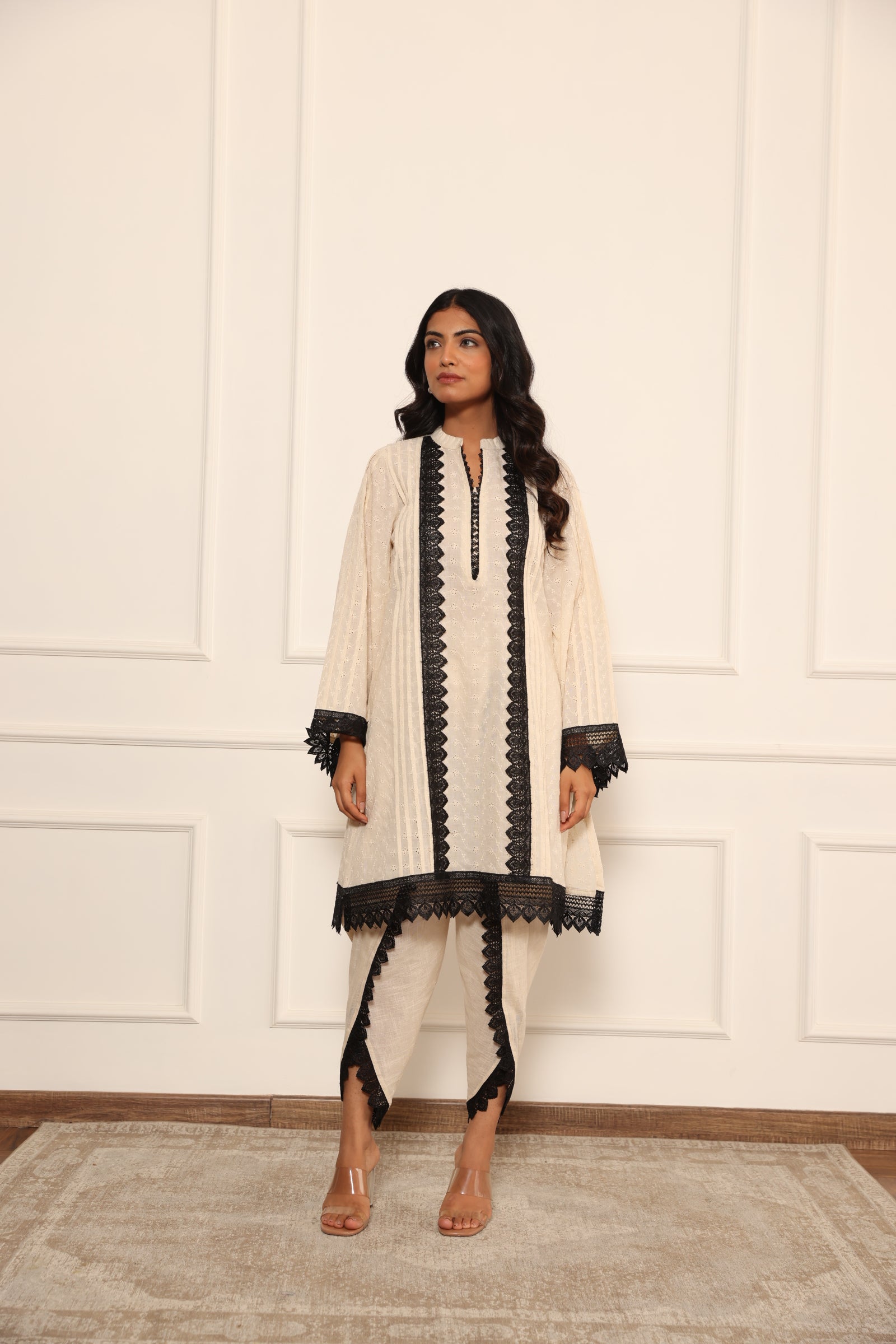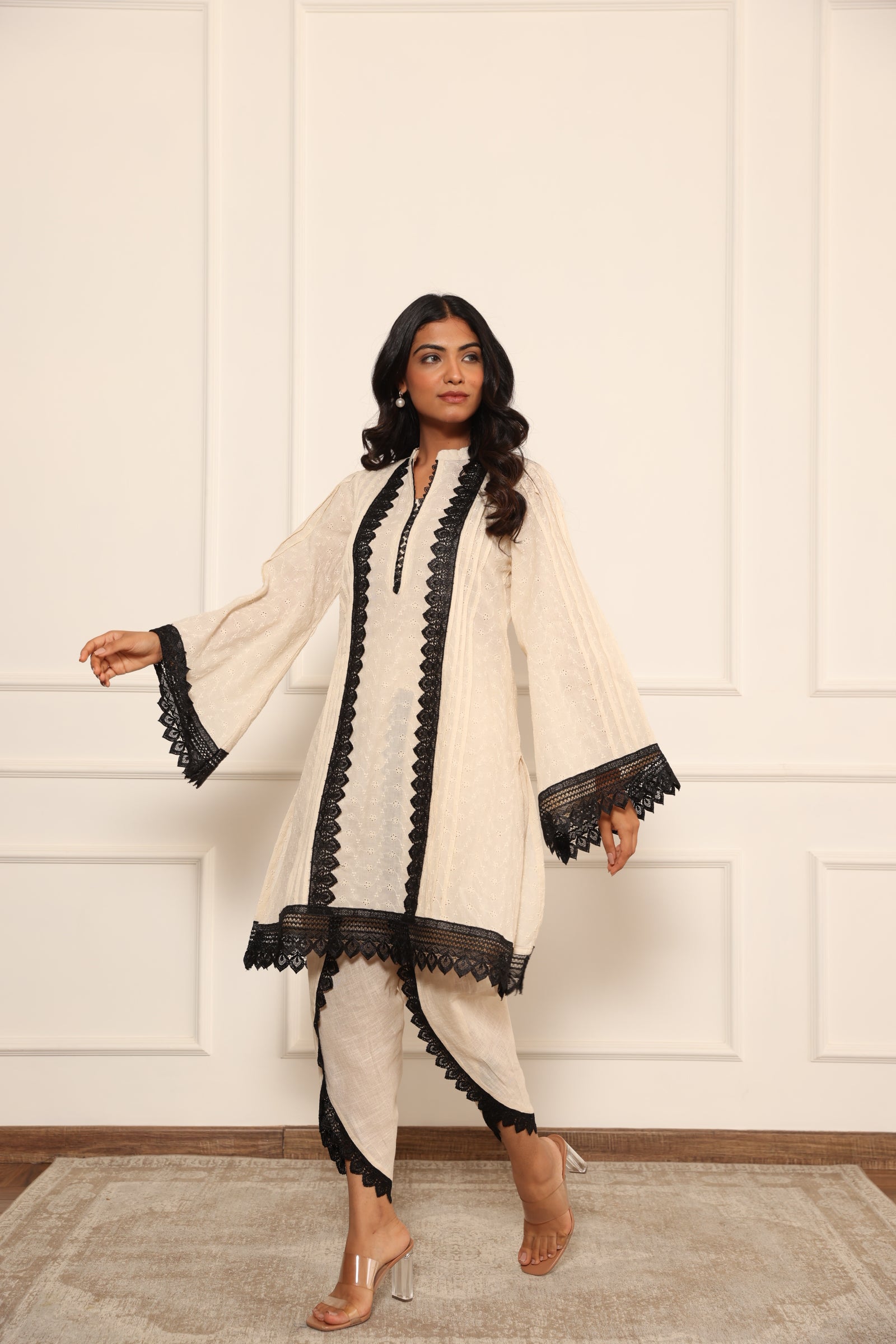 Riya – Kurzes, beiges pakistanisches Schiffli-Baumwoll-Kurta mit Baumwoll-Dhoti-Hose
