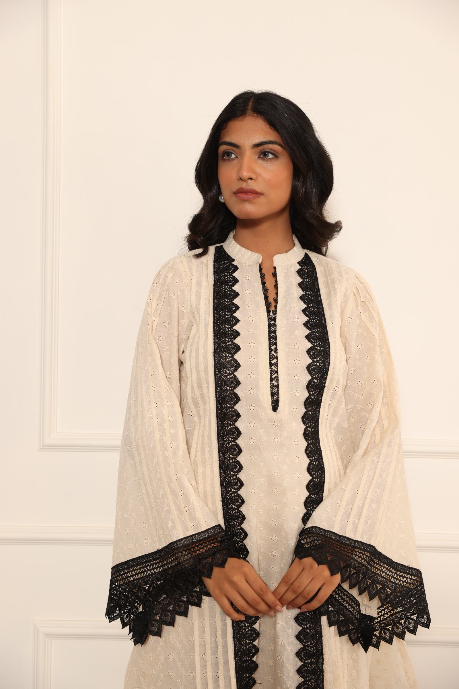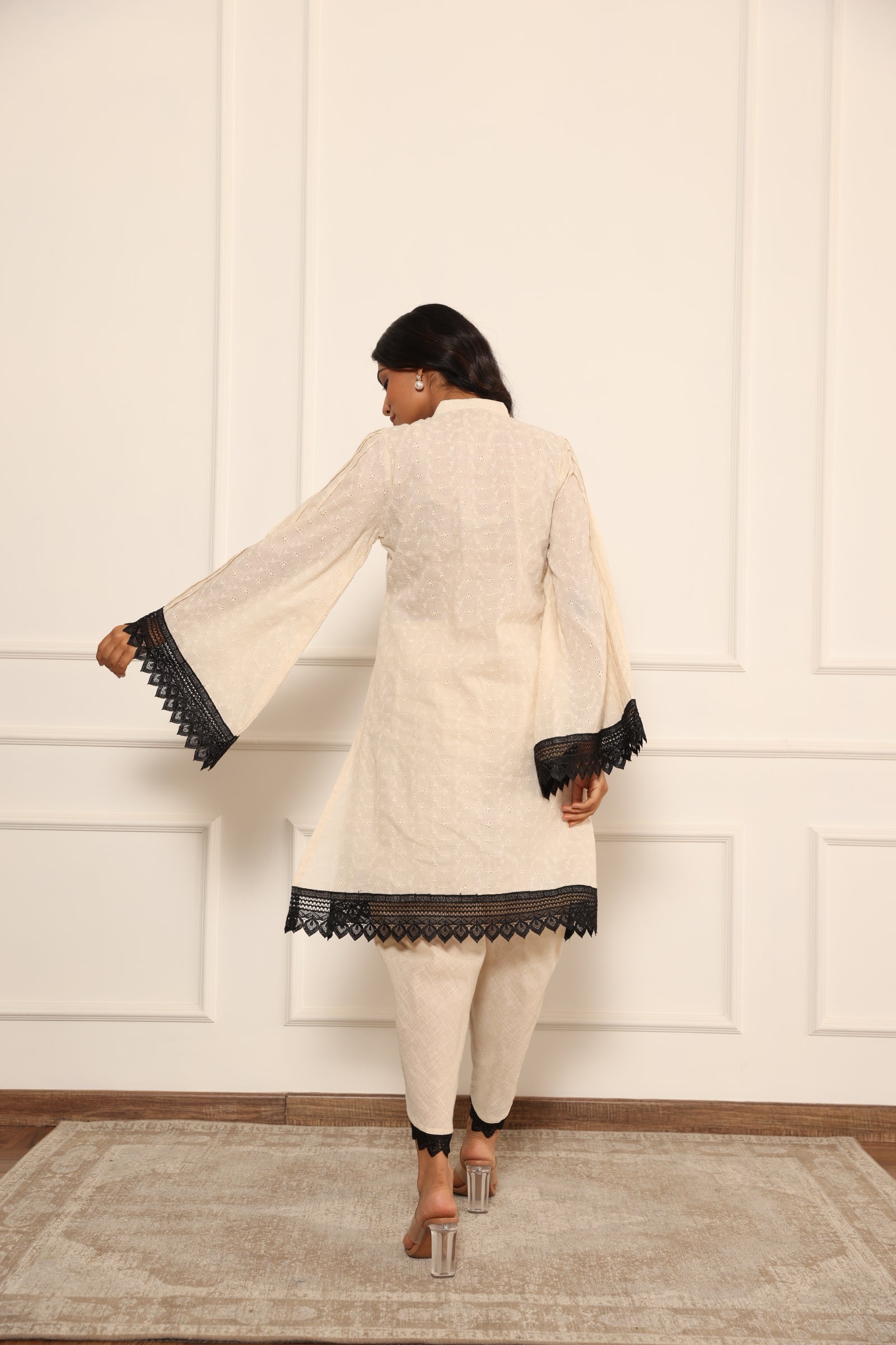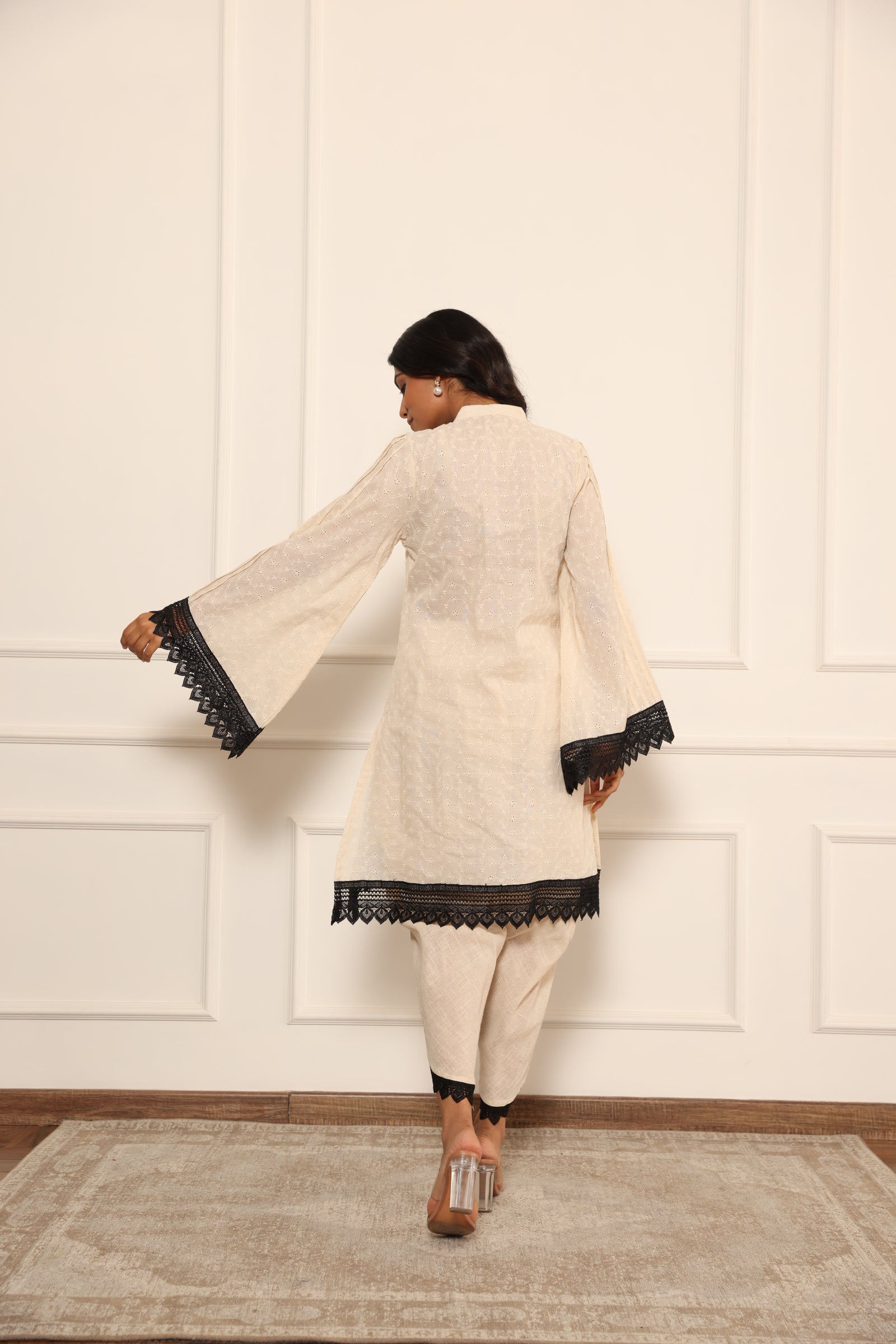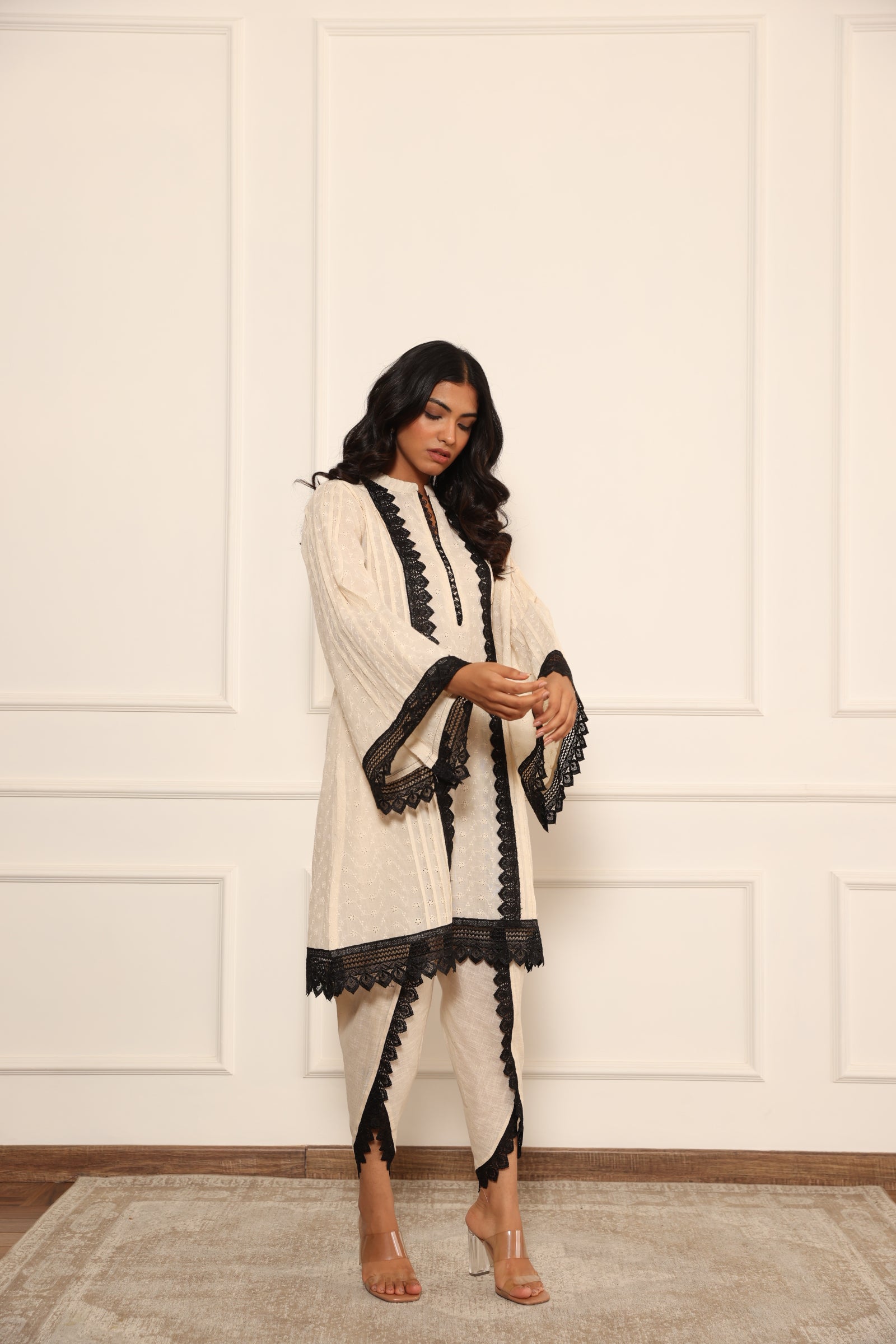 Riya – Kurzes, beiges pakistanisches Schiffli-Baumwoll-Kurta mit Baumwoll-Dhoti-Hose