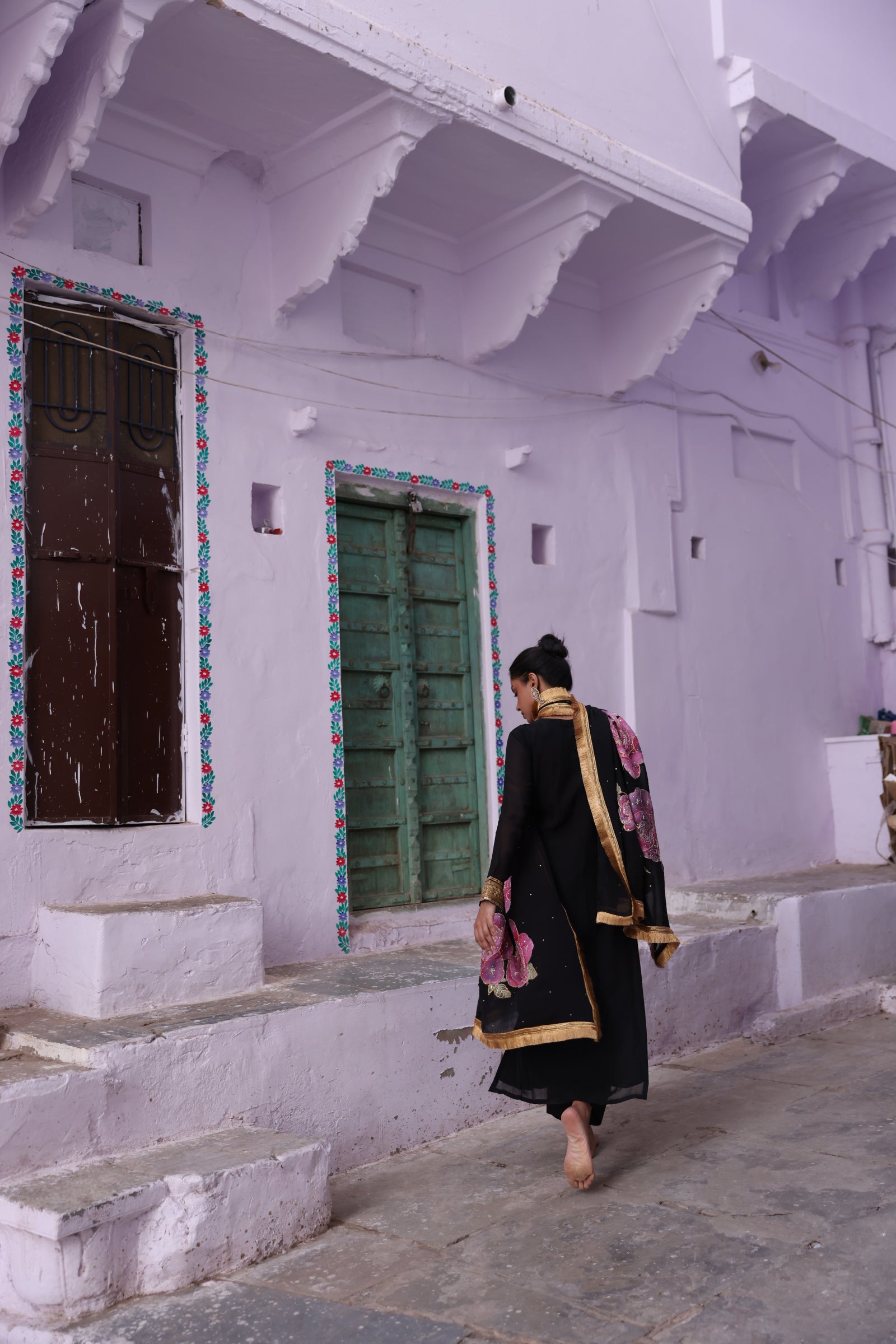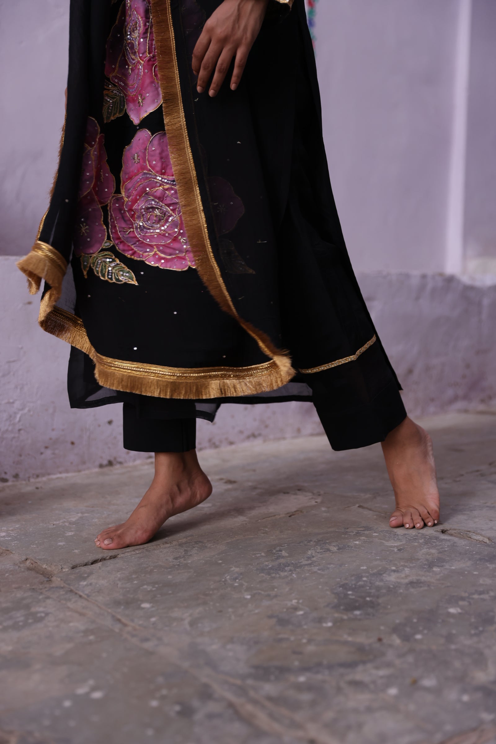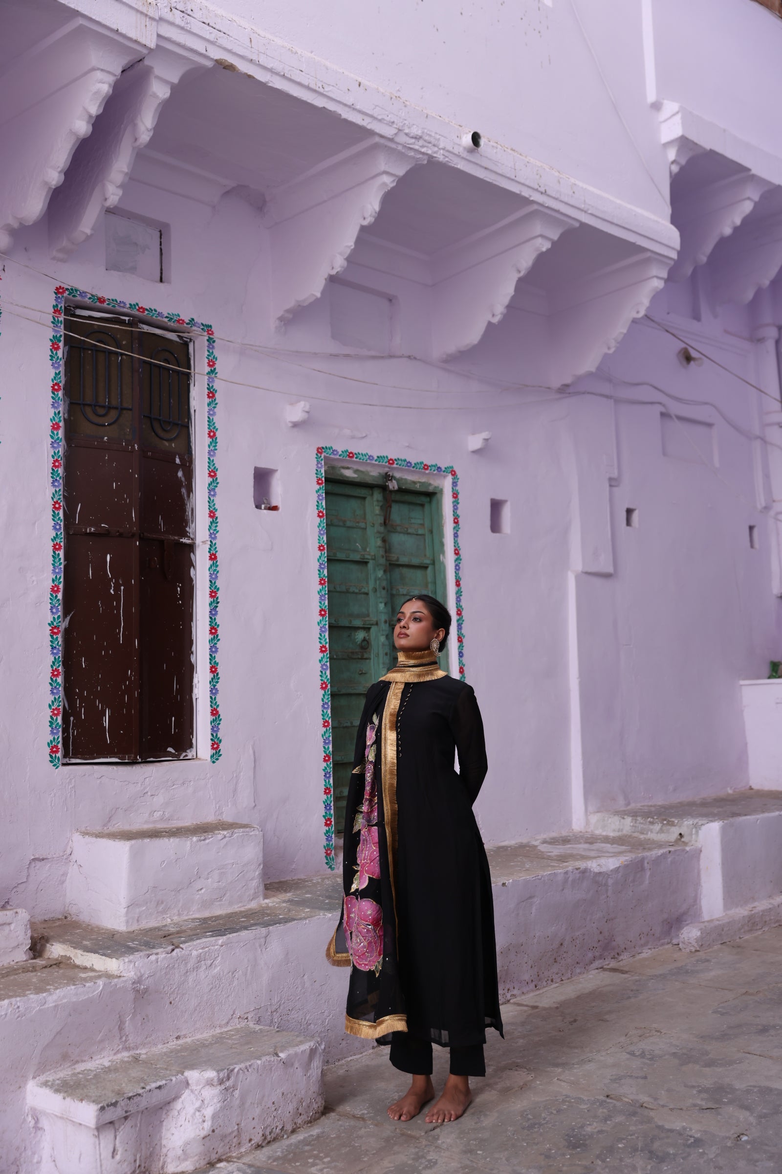 Riya – handbemaltes und verziertes Kurta-Set aus schwarzem Organza