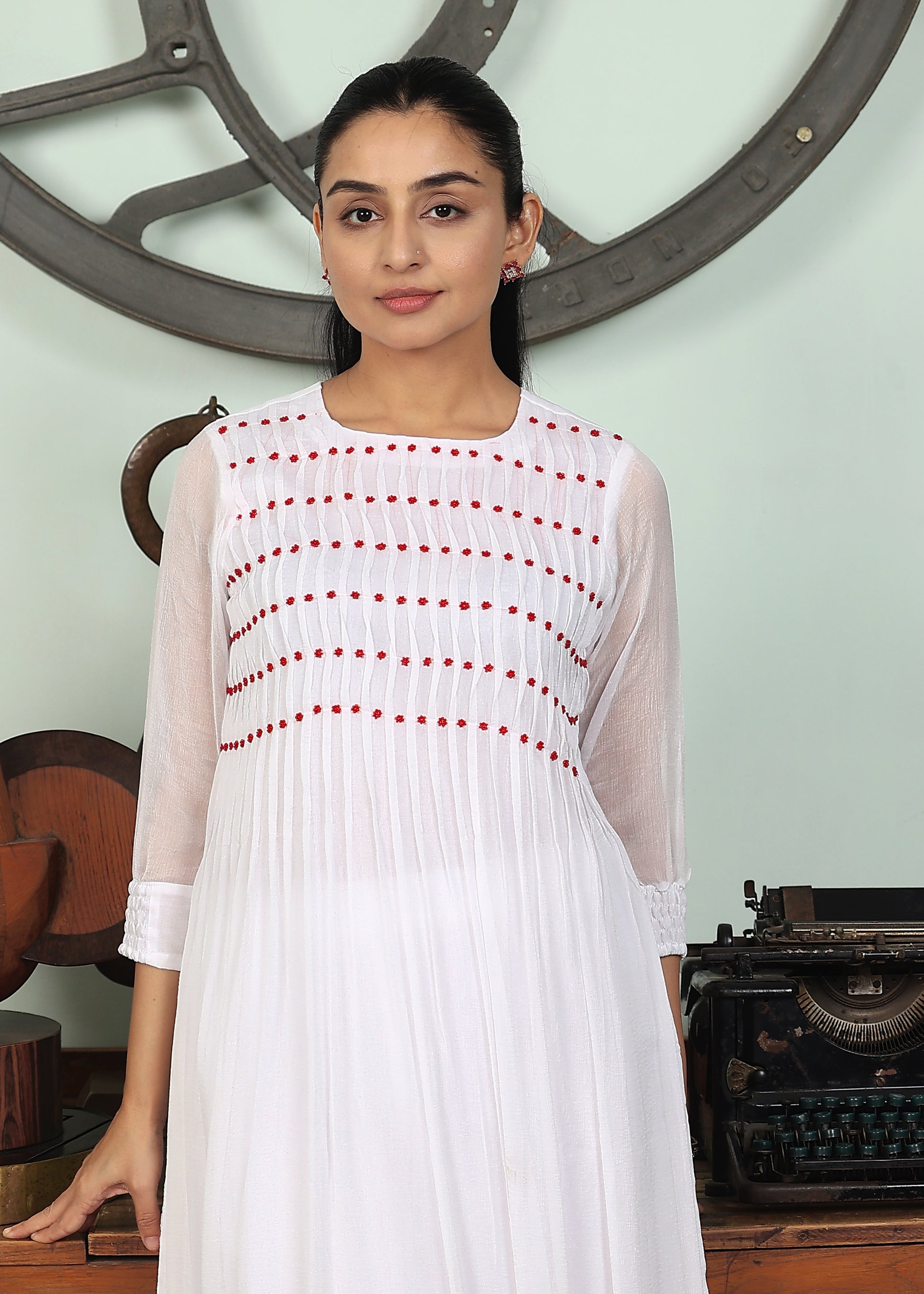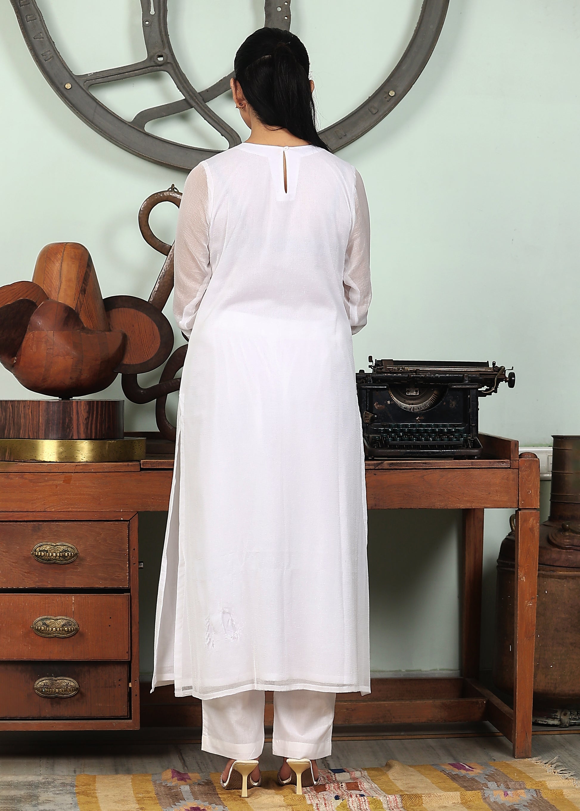 Elevate your wardrobe with this elegant set of two white chiffon kurtas, featuring delicate pintuck handwork. Crafted from lightweight chiffon, these kurtas offer a graceful drape and breathable comfort, perfect for both formal occasions and casual wear. The intricate pintuck detailing adds subtle texture and sophistication, making each piece a timeless addition to your collection. Ideal for layering or standalone styling, this set combines traditional craftsmanship with contemporary ease.