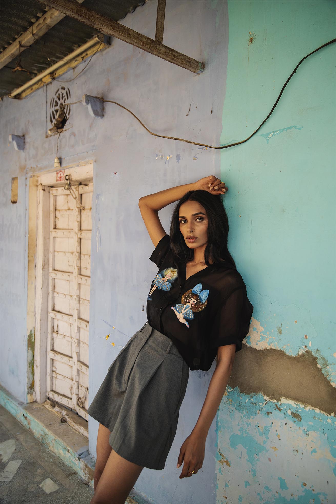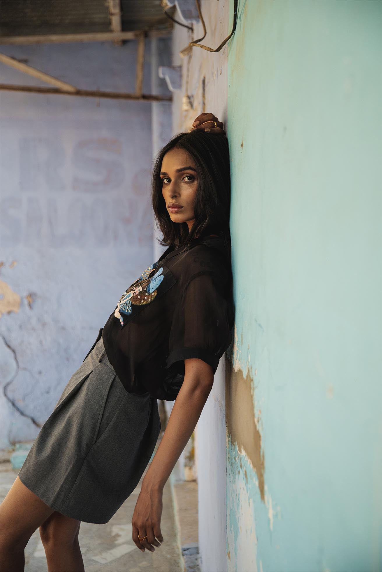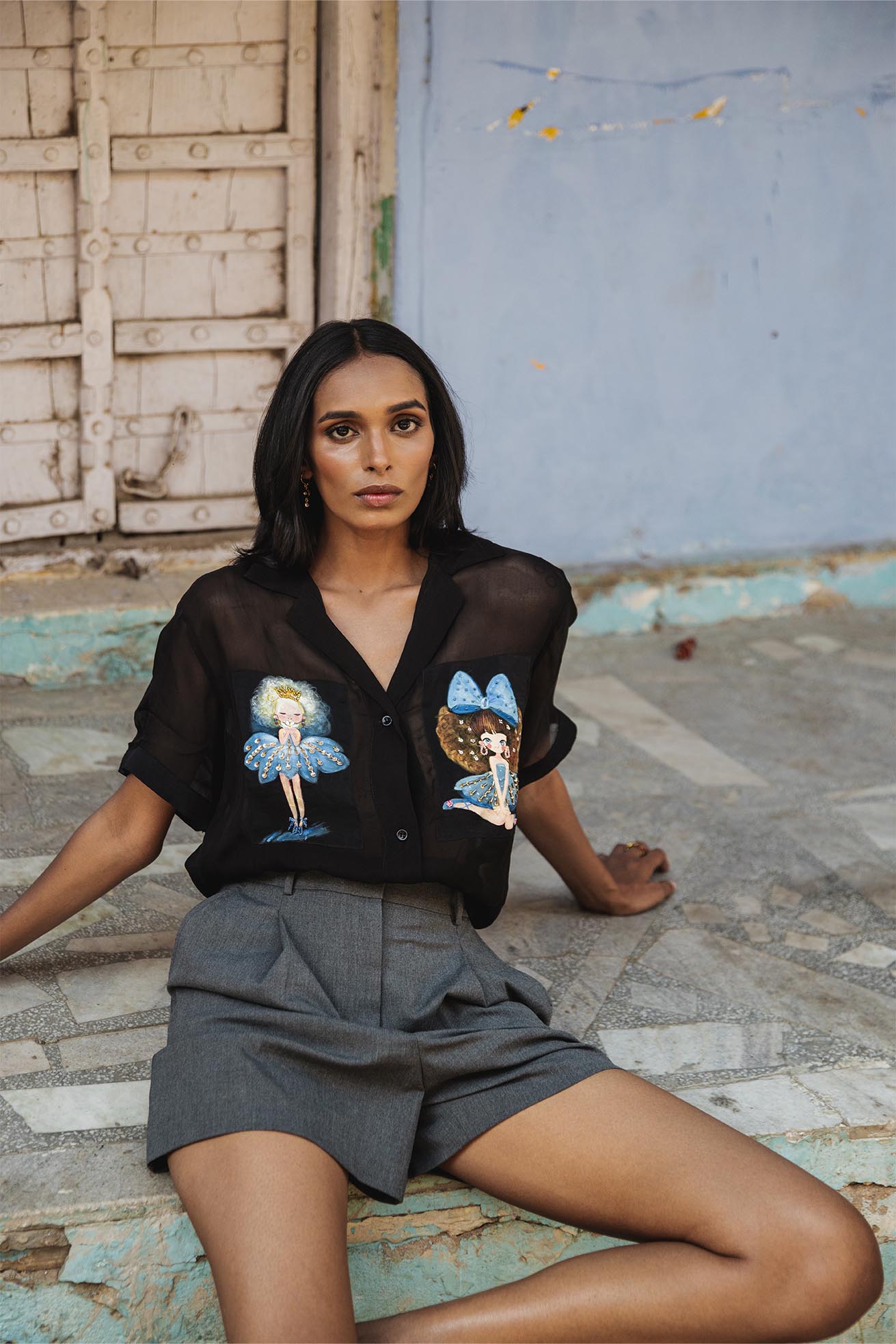 black organza shirt with handpainted dolls in the front and hand ebroidered.with front button closure and half sleeves