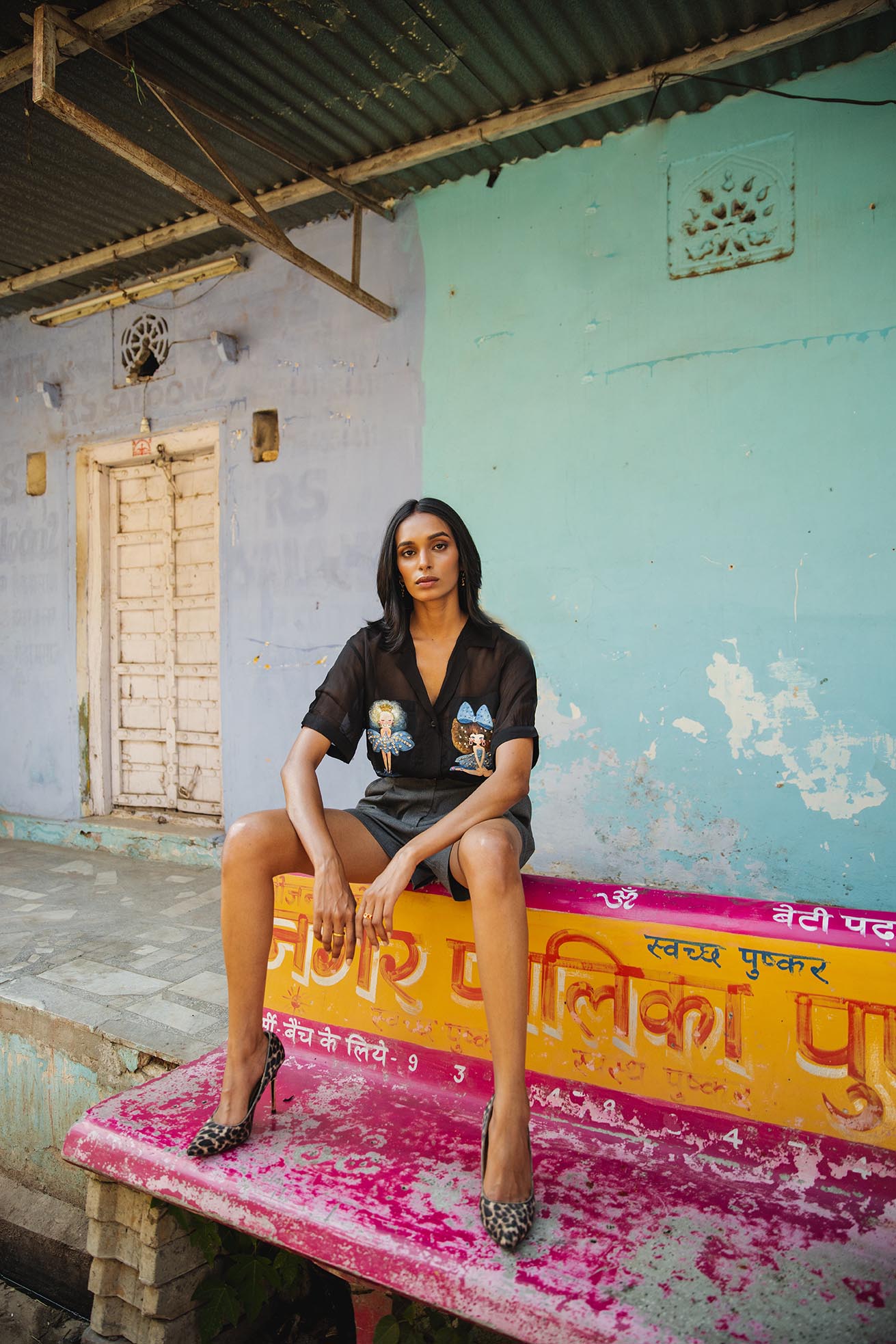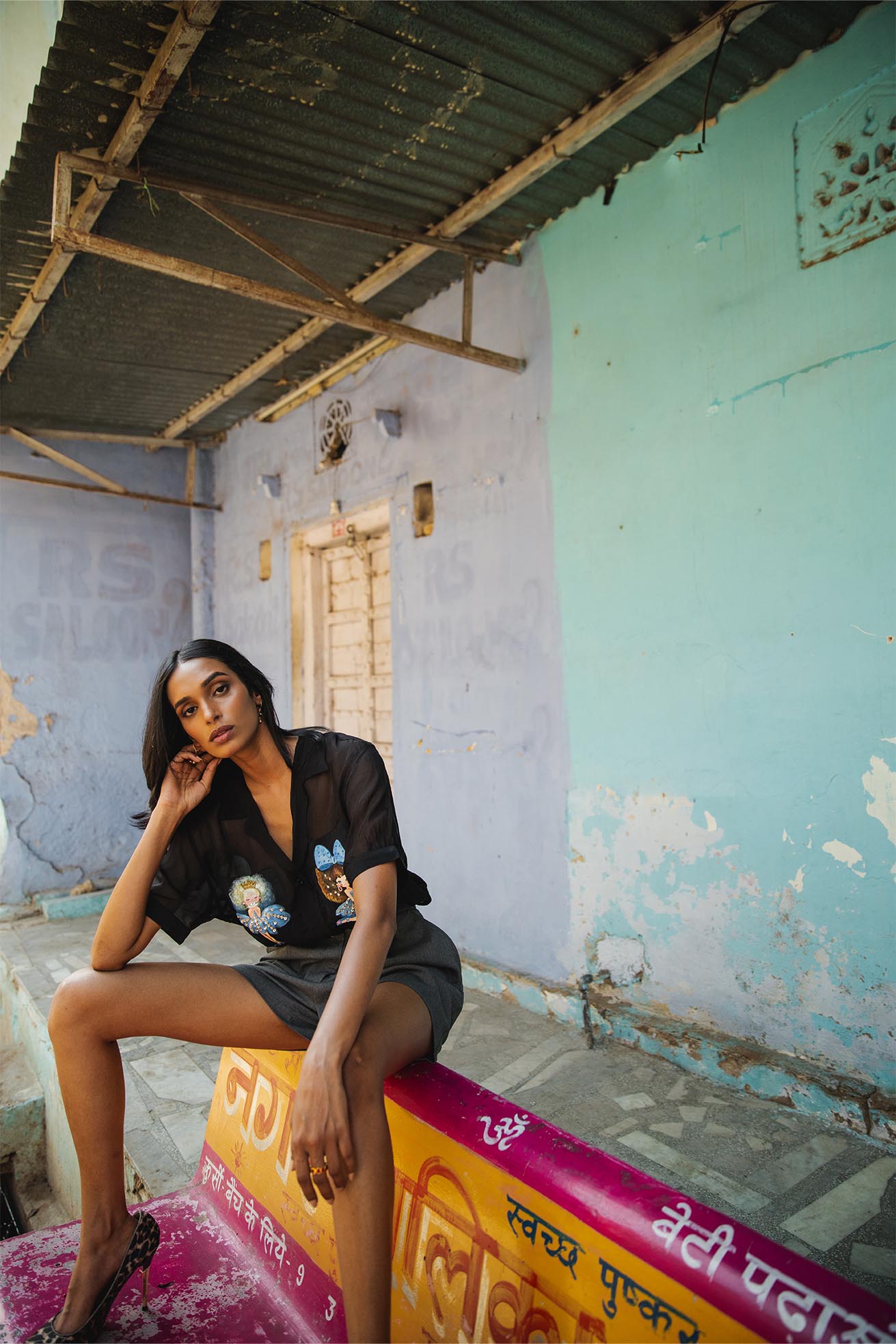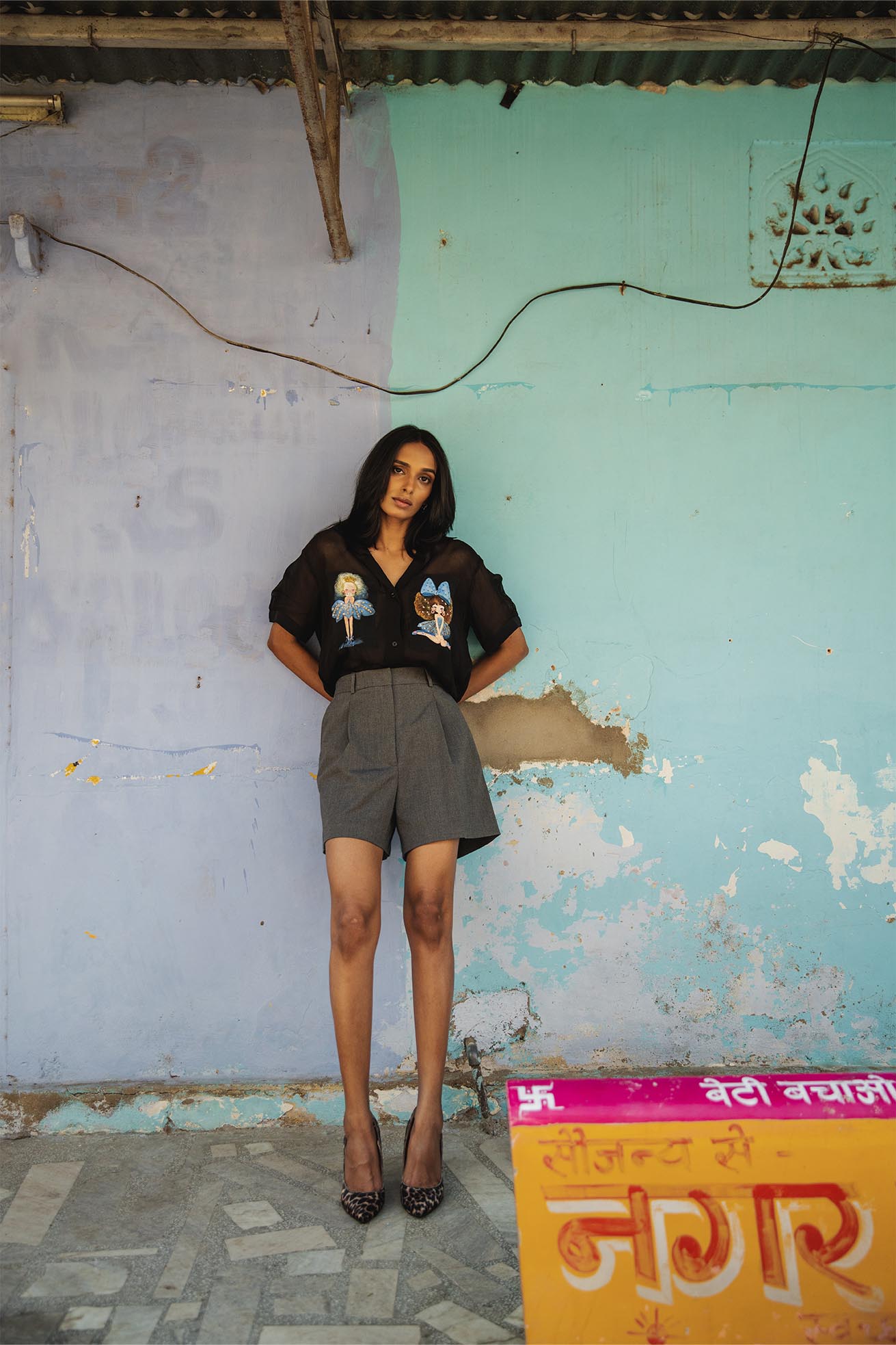 black organza shirt with handpainted dolls in the front and hand ebroidered.with front button closure and half sleeves