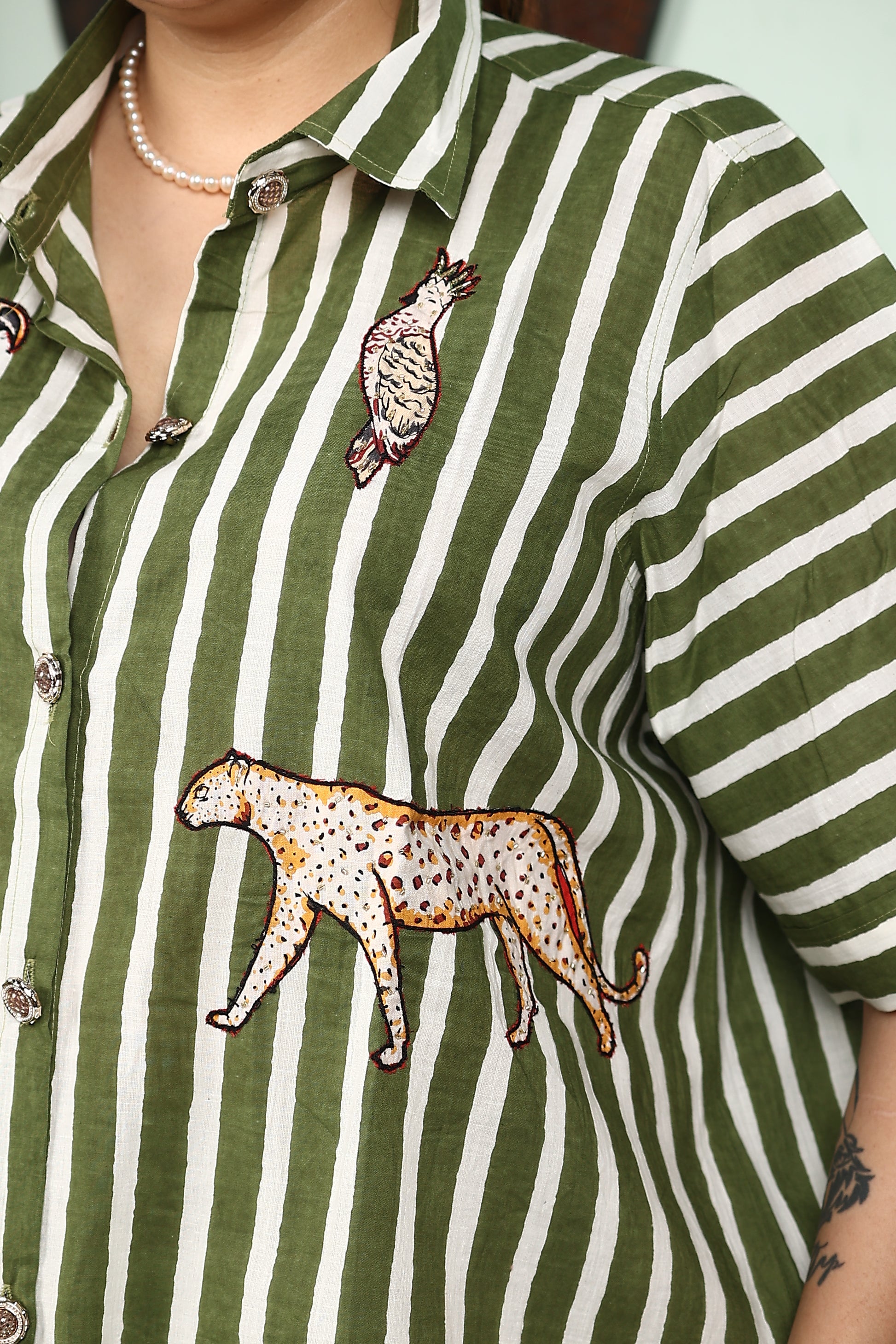 This green animal shirt combines vibrant color with a nature-inspired design, offering both style and comfort. Crafted from breathable fabric, it ensures all-day wearability while showcasing a unique animal motif that adds character to your wardrobe. Ideal for casual outings or layering, this shirt brings a subtle yet distinctive touch to your everyday look.