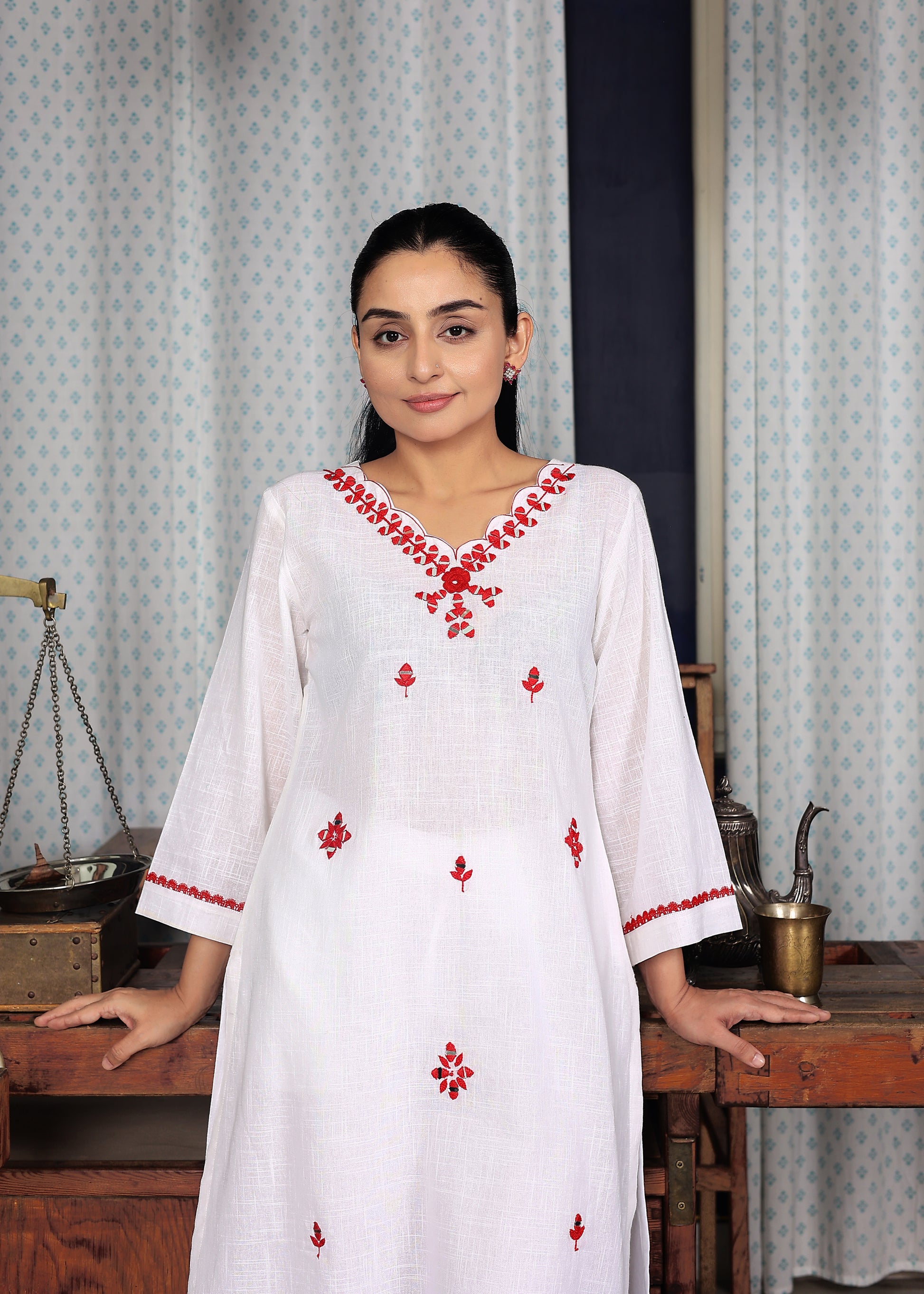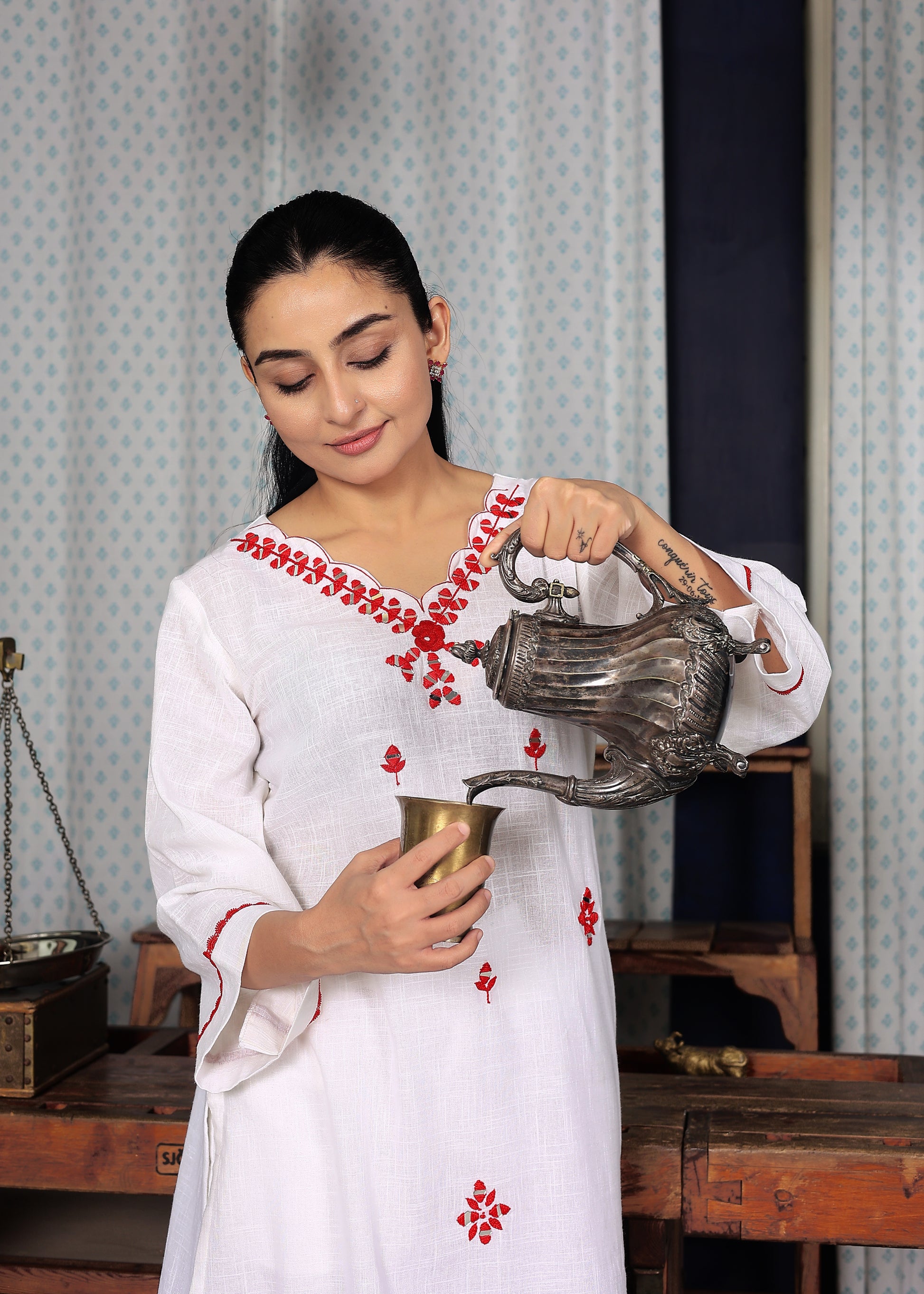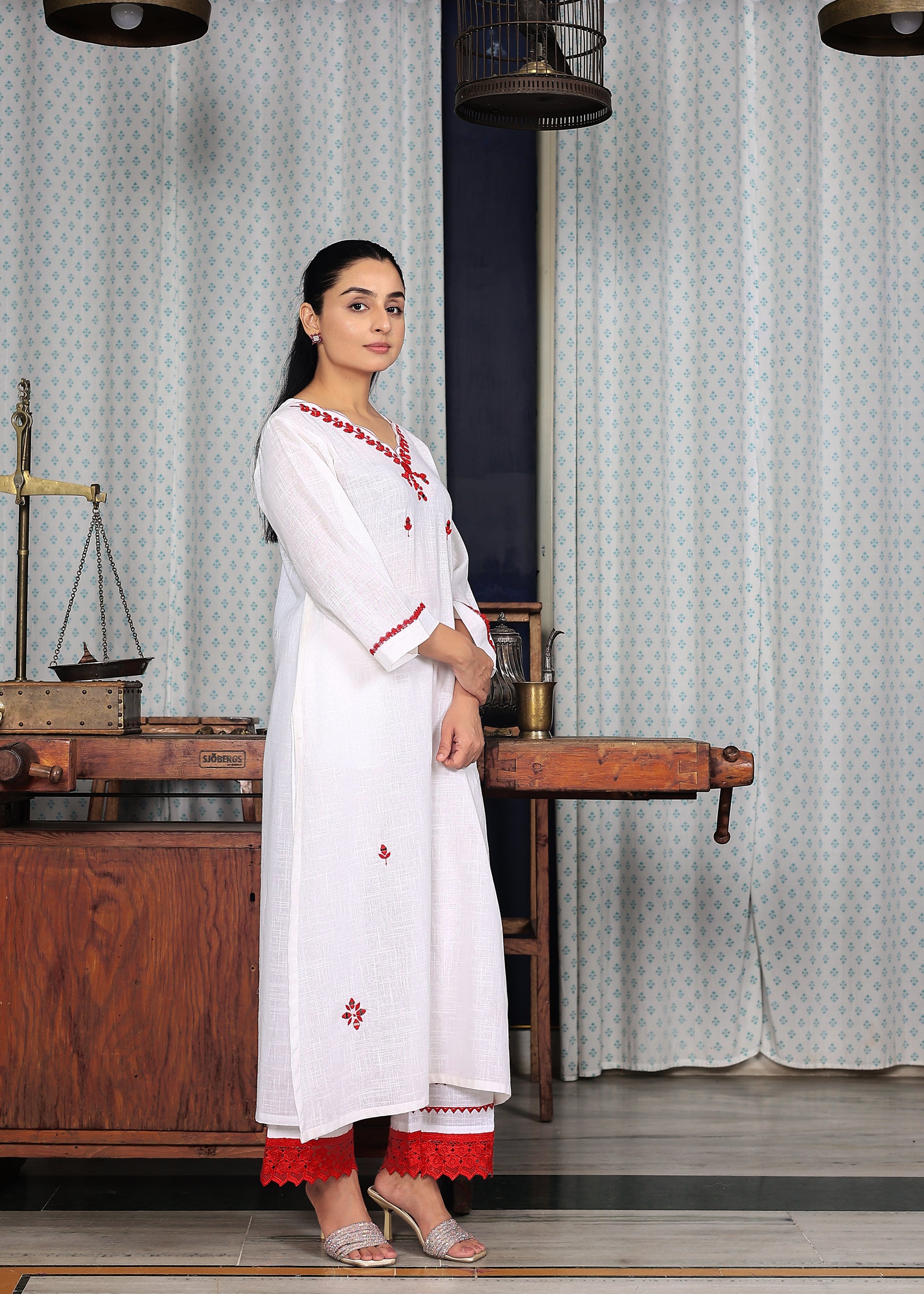 "Meet Jhalak — a striking red kurta set where tradition meets timelessness. Handcrafted in soft cotton, detailed with intricate hand embroidery and delicate handwork that catches the light, just like a fleeting glimpse of grace."