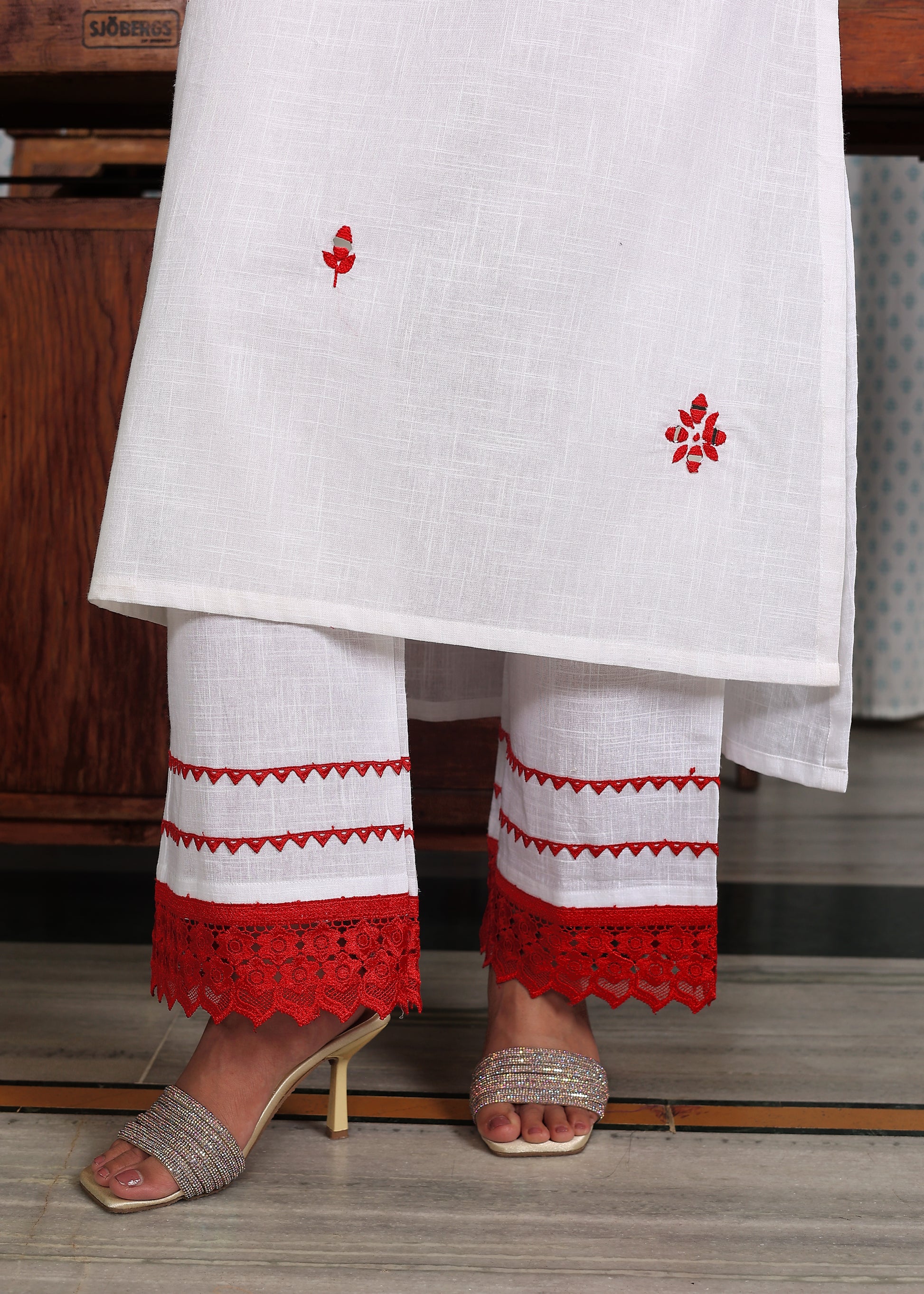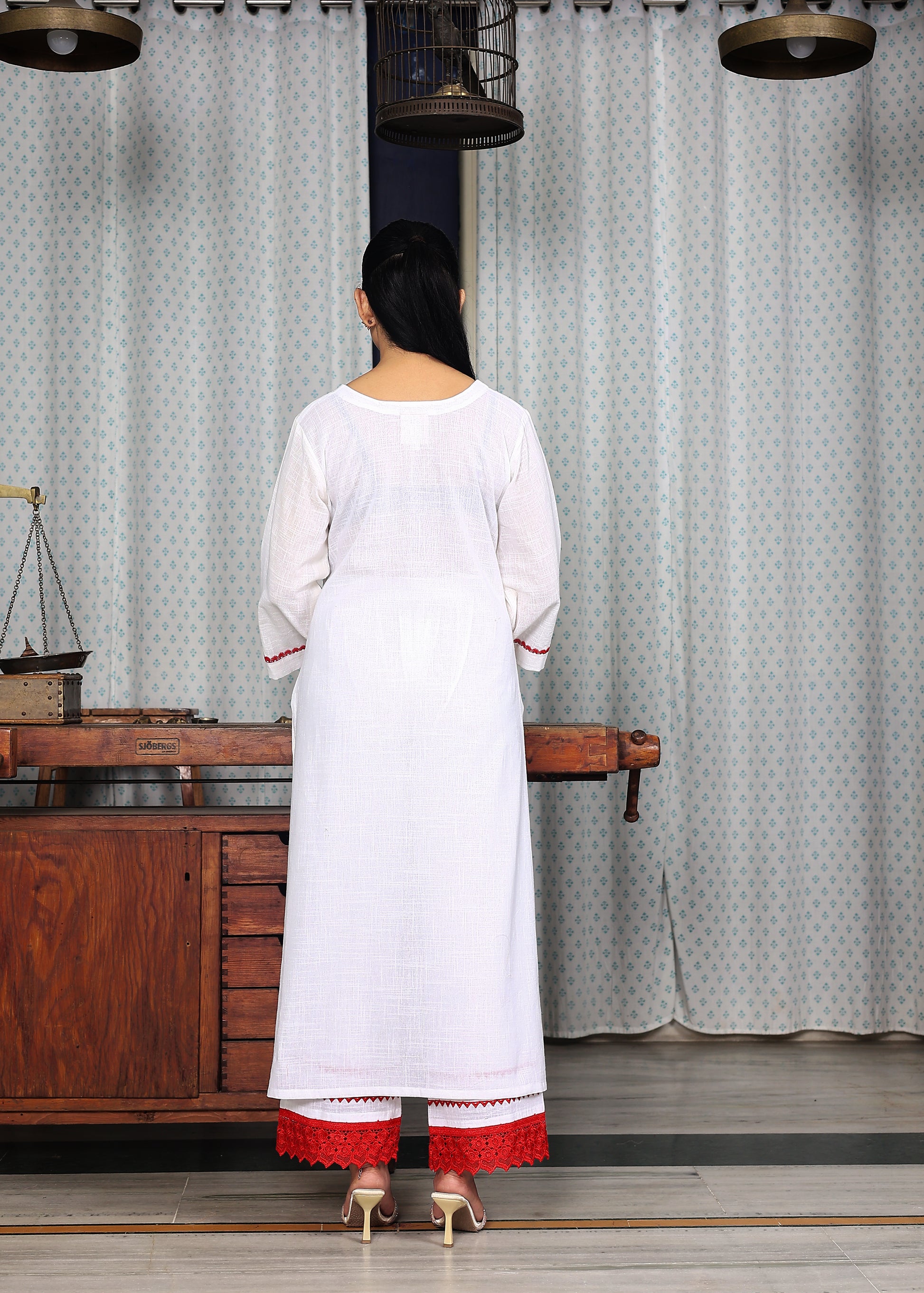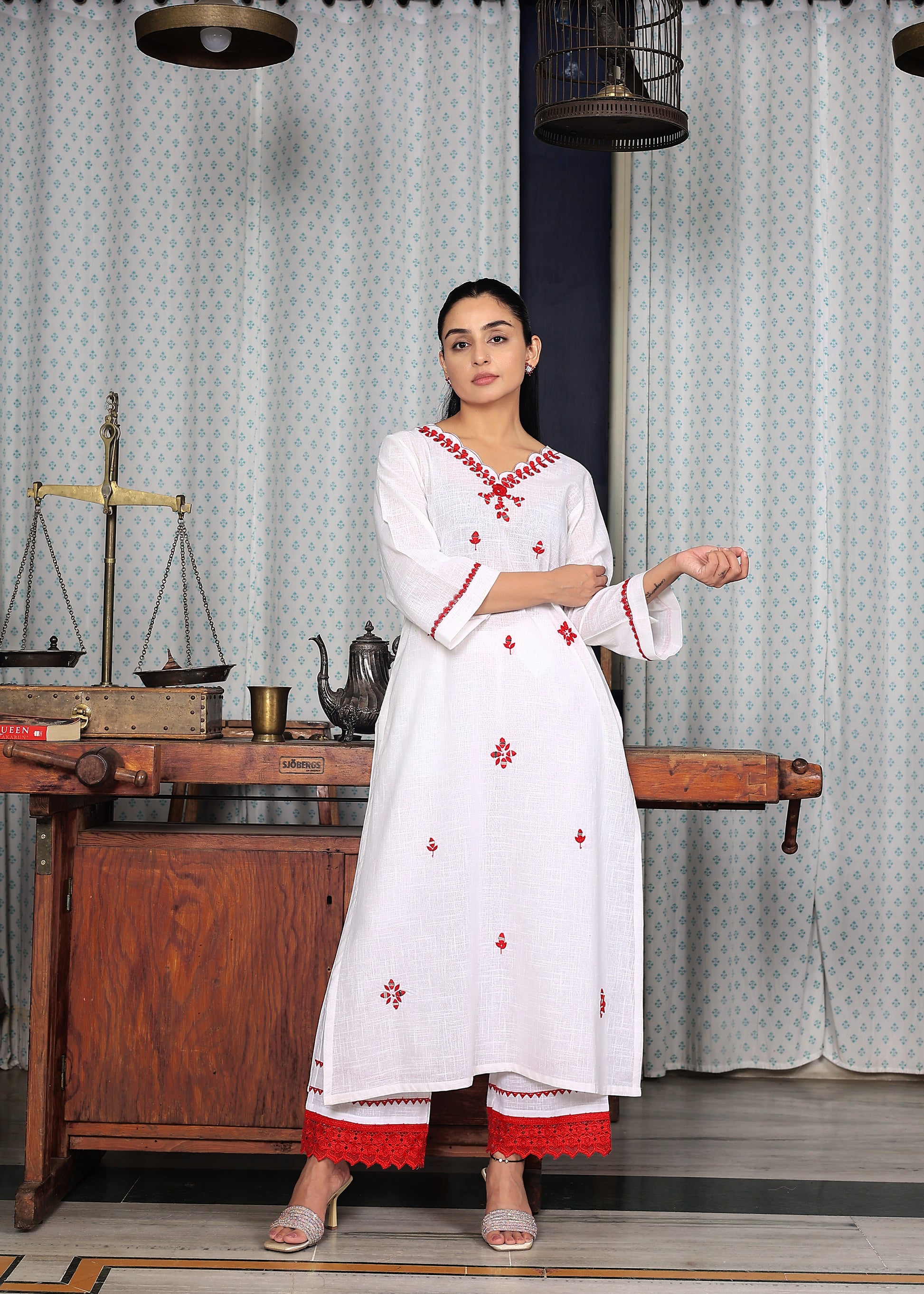 "Meet Jhalak — a striking red kurta set where tradition meets timelessness. Handcrafted in soft cotton, detailed with intricate hand embroidery and delicate handwork that catches the light, just like a fleeting glimpse of grace."