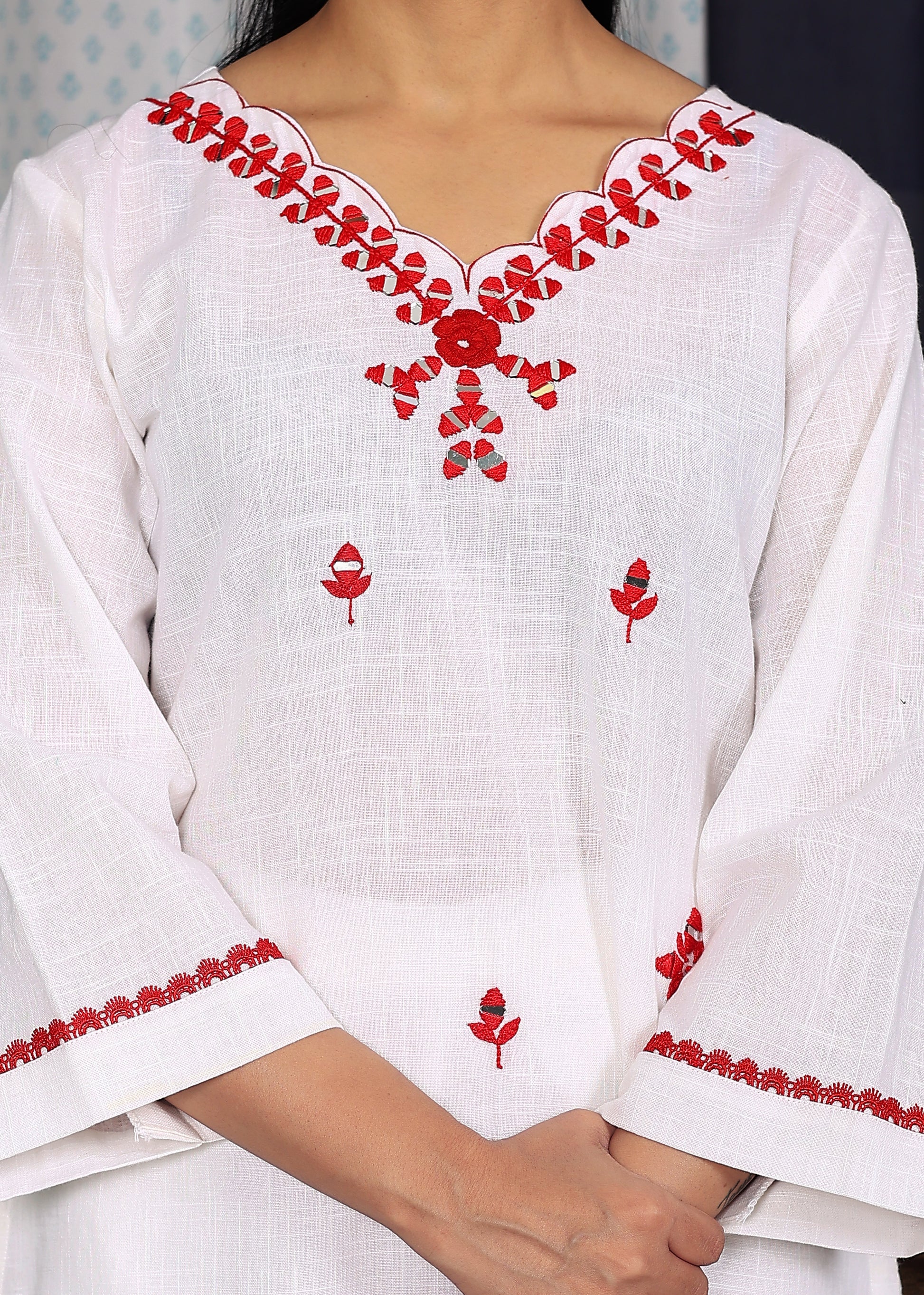 #JhalakByImroz #ImrozHouse #HandEmbroidered #MadeByHand #CottonElegance #RedKurtaLove #CraftedWithCare #SustainableStyle #ArtOnFabric
