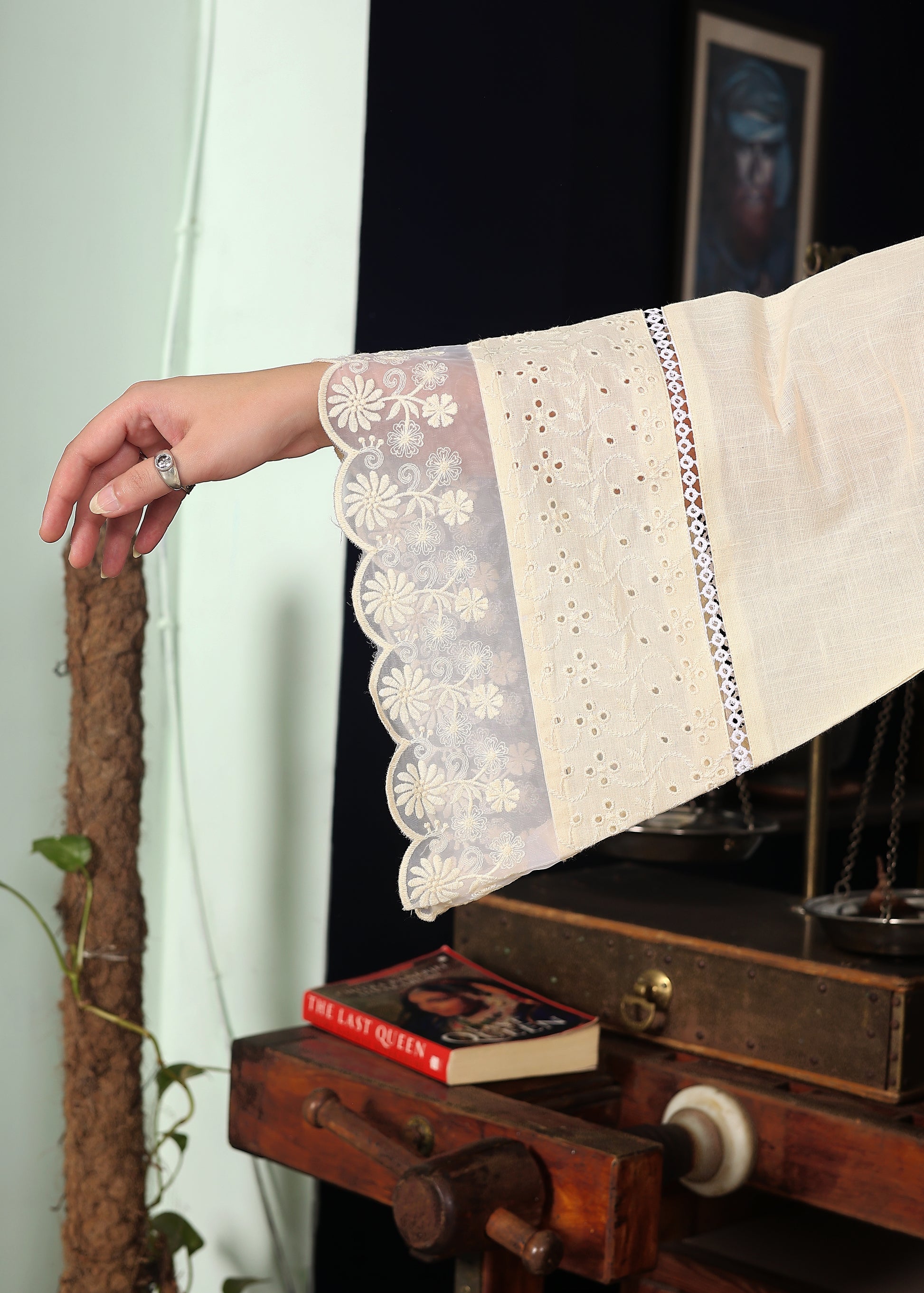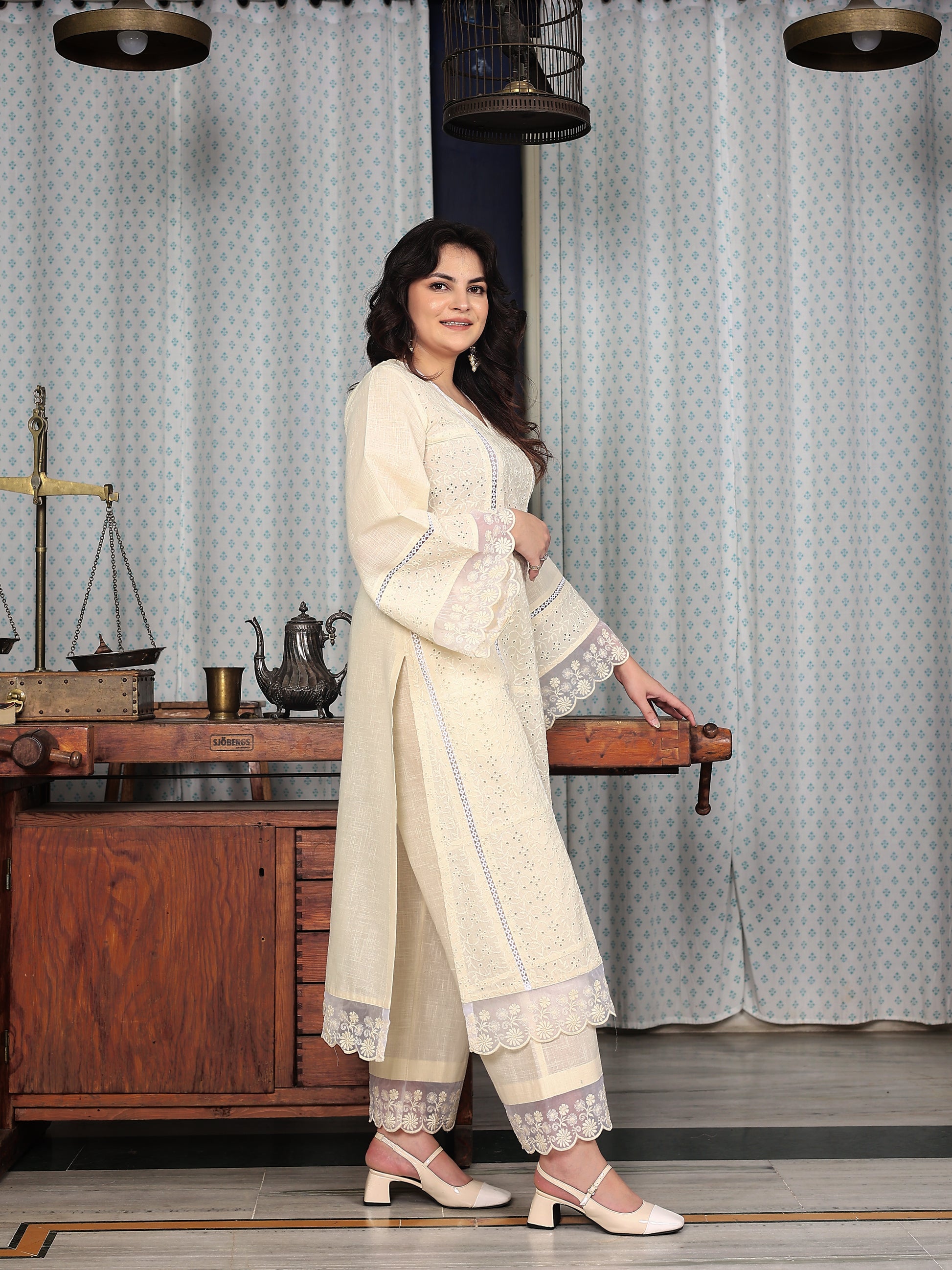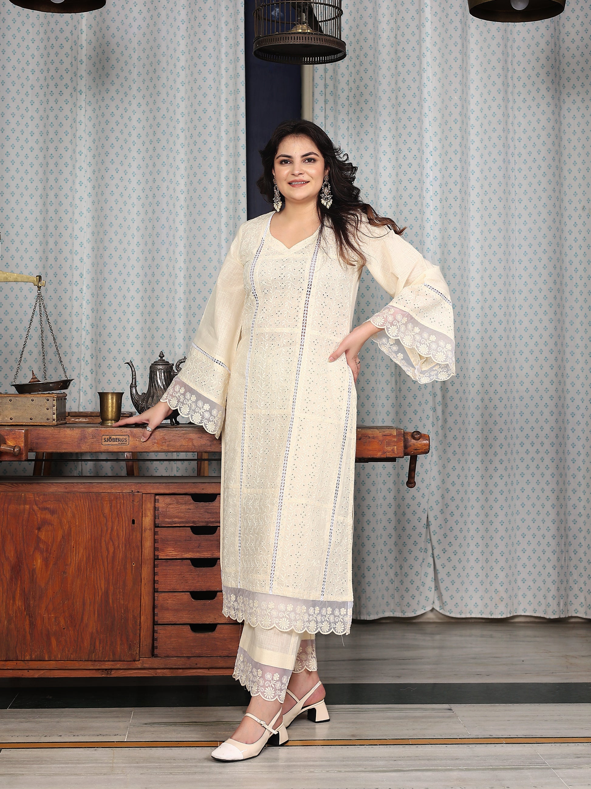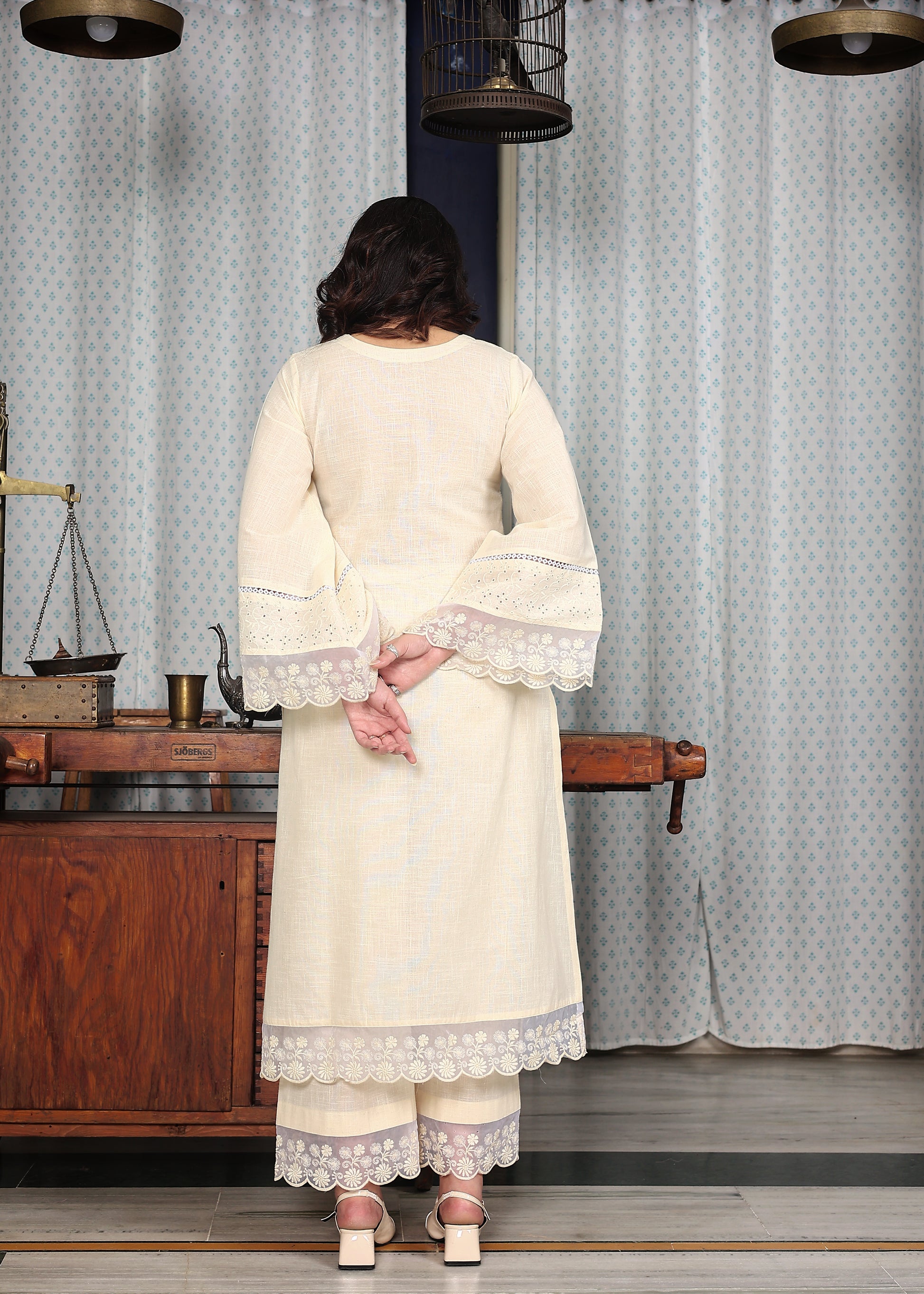 Delicate lace detailing adorns the kurta and complements the tailored pants, adding a touch of grace to its structured, flowing form. Each piece is one-of-a-kind, reflecting the soul of zero-waste design — where nothing is discarded and everything finds new purpose.