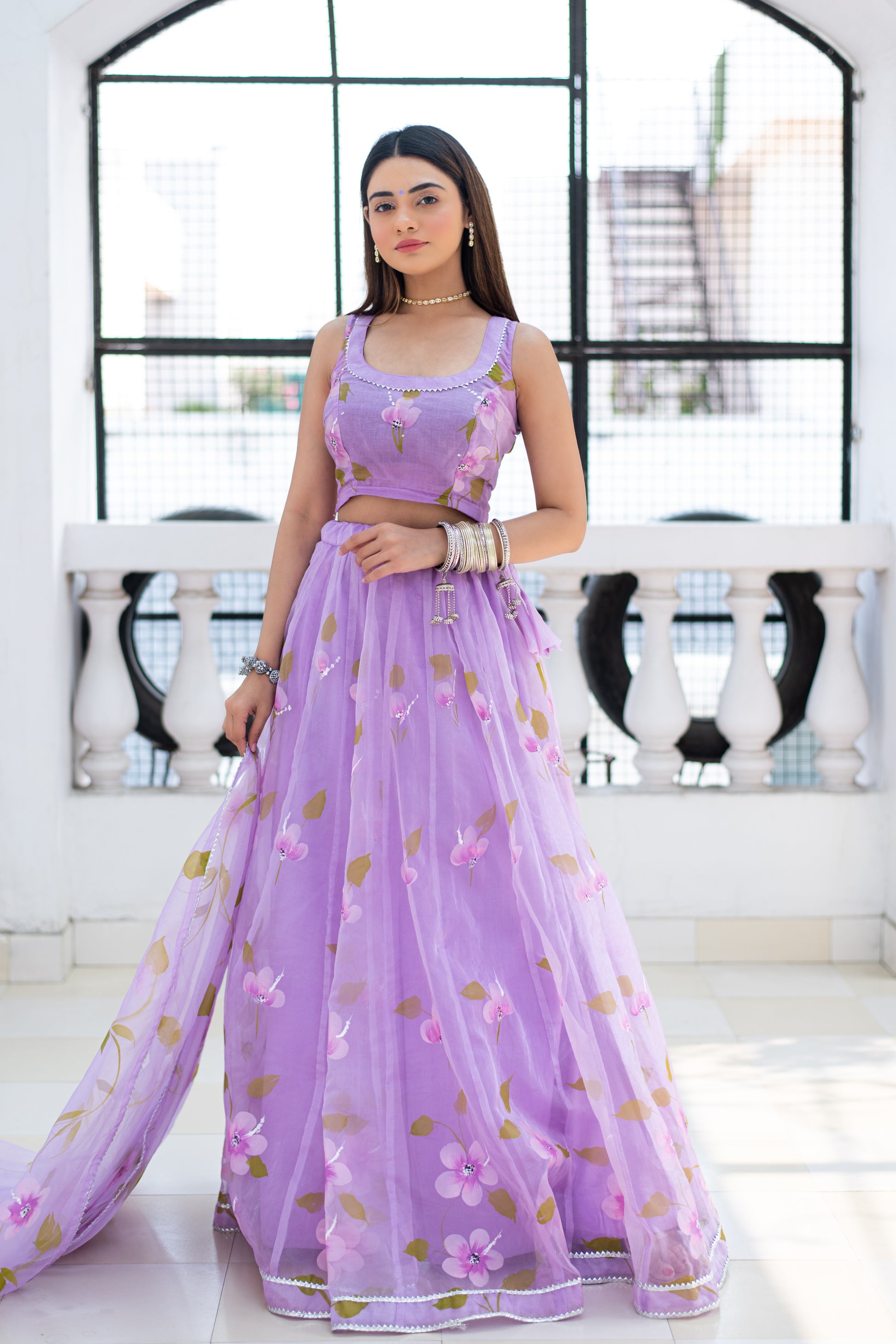 Lavender Organza Handpainted Lehenga Set – Saadgi Collection