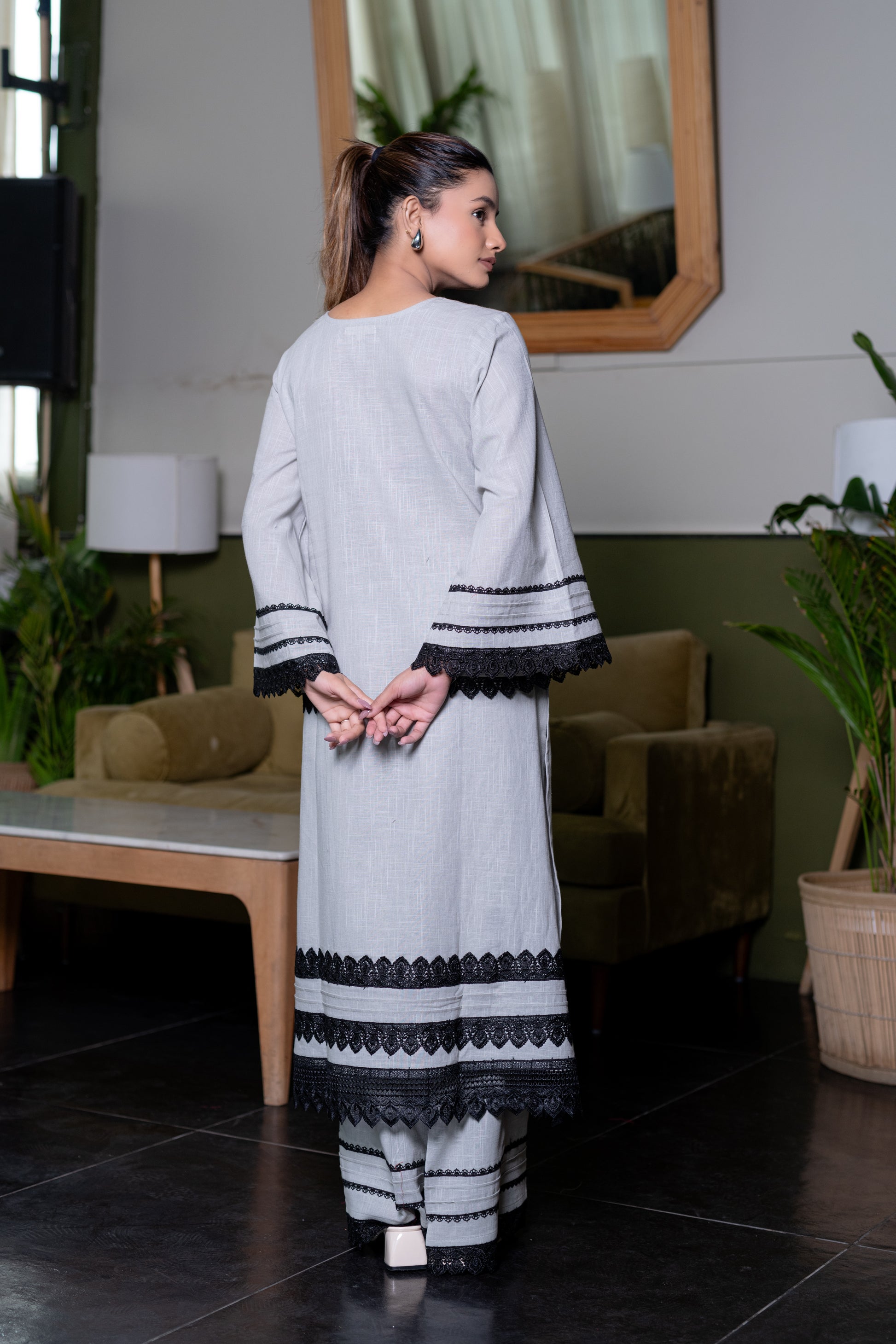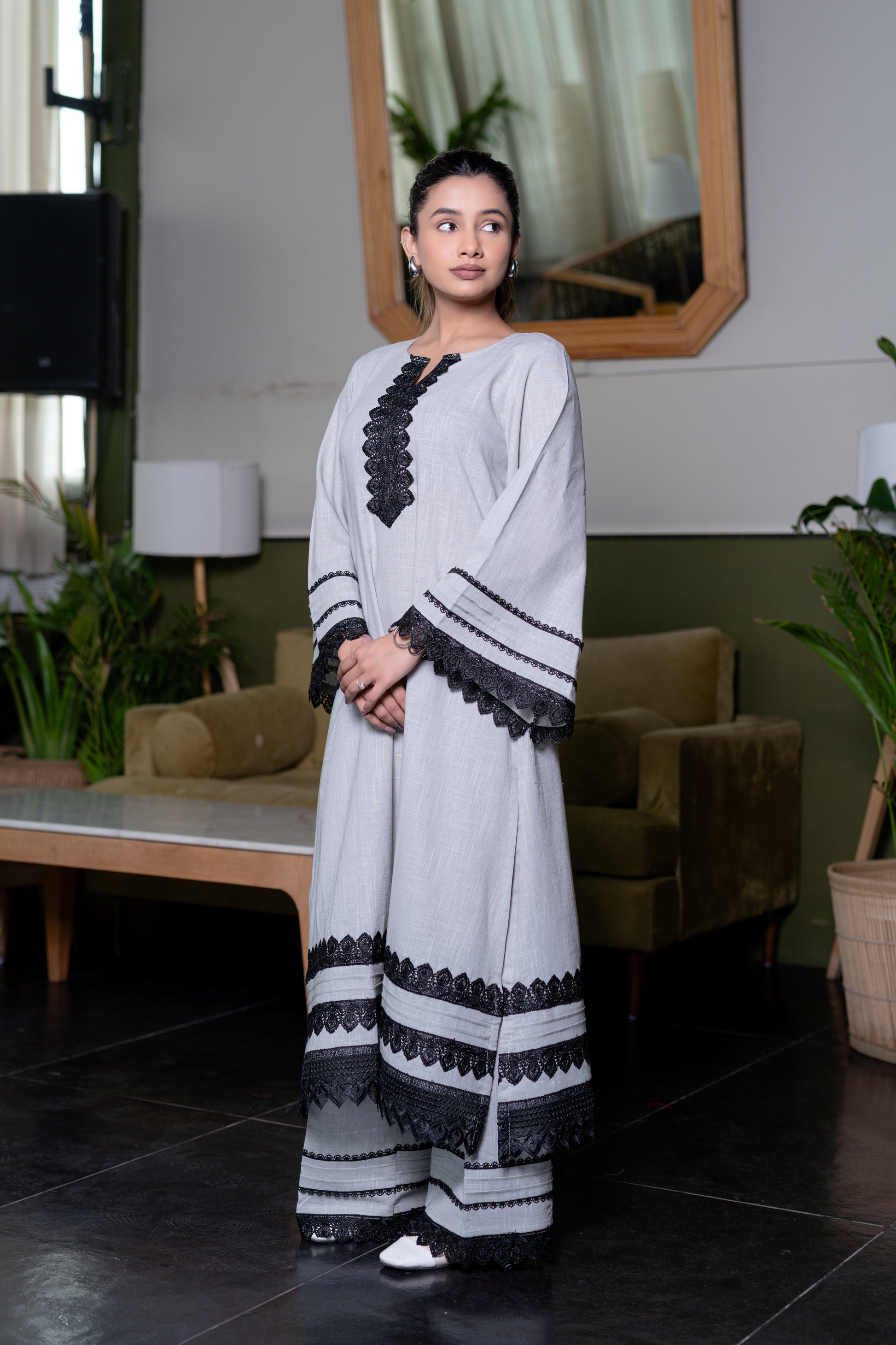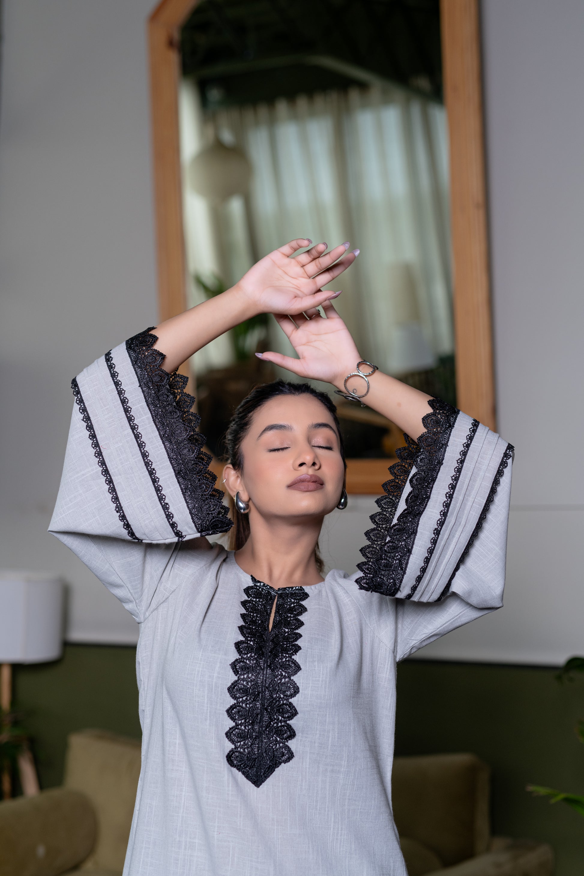 The subtle light grey hue paired with delicate black lace makes this set a versatile choice for casual outings, festive gatherings, and everyday elegance. Experience timeless style with a modern twist in this effortlessly chic outfit.