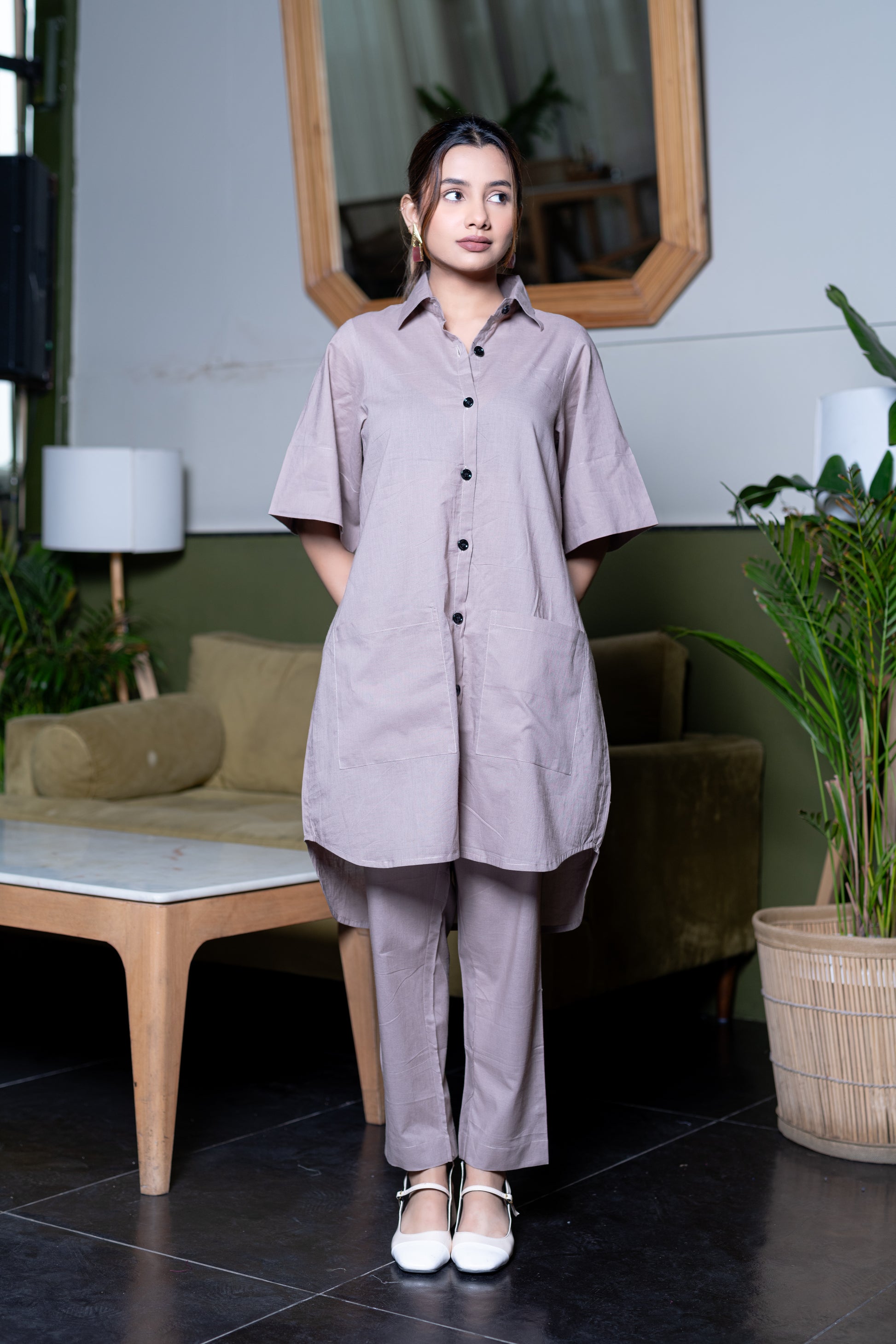 Introducing the Grey Cotton Co-Ord Set from the Moksha Collection by Savina by Imroz House. This chic set is made from soft, breathable cotton, offering ultimate comfort without compromising on style. The kurta features button details on the front, adding a touch of elegance to its minimalist design, along with two functional front pockets for added practicality and a modern twist.