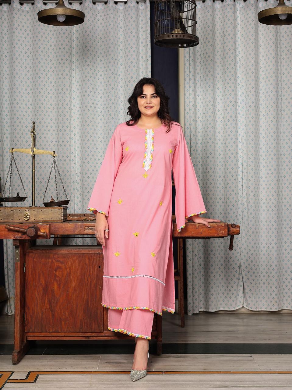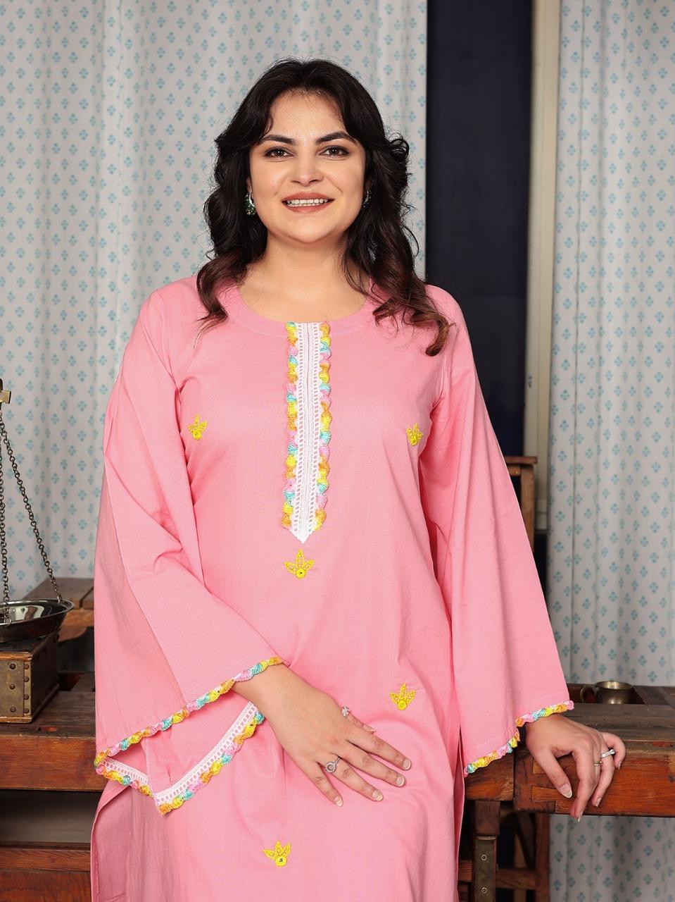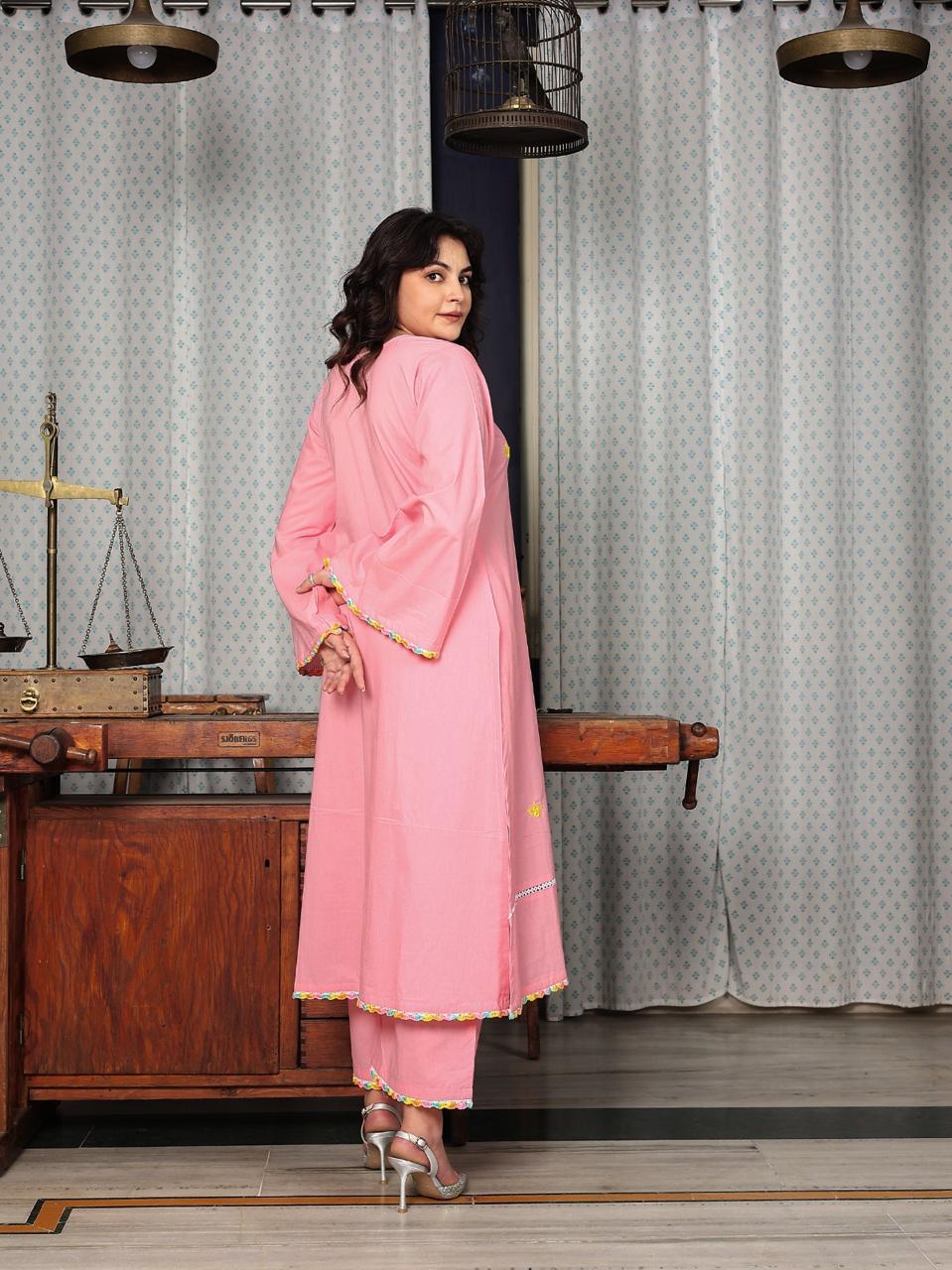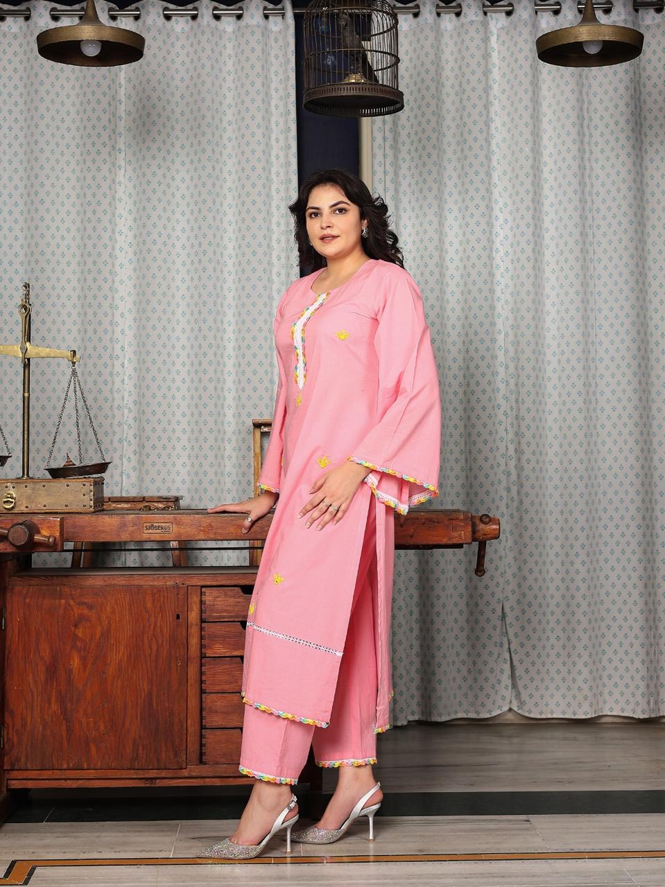 "Soft like a summer sigh. Hand-embroidered with mirror work ,love, stitched in stories — this light pink dream is where comfort meets craft."