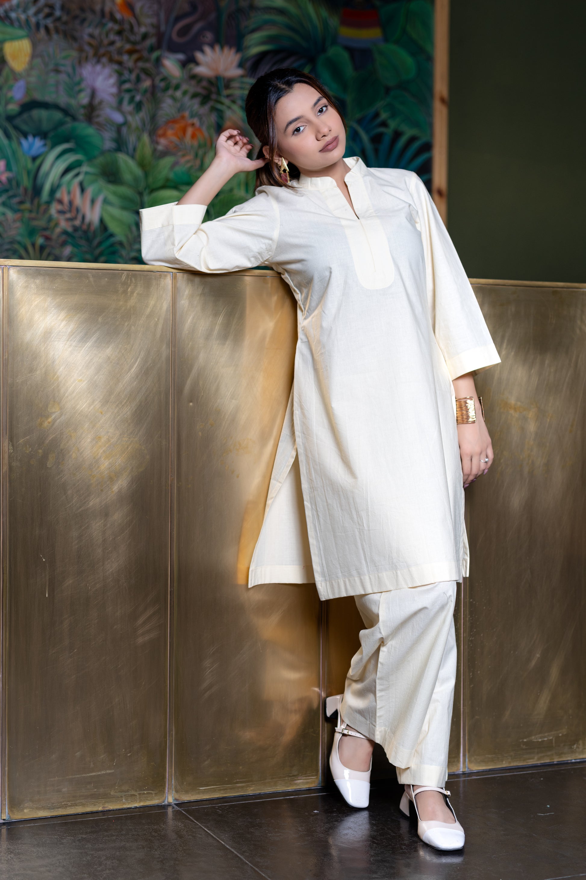 Introducing the Yellow Poplin Collar Neck 3/4th Sleeves Co-Ord Kurta Set from the Moksha Collection by Savina by Imroz House. This delightful ensemble is crafted from soft and breathable poplin fabric, ensuring comfort and style for all-day wear. The kurta features a classic collar neck and elegant 3/4th sleeves, adding a sophisticated touch to the relaxed silhouette.