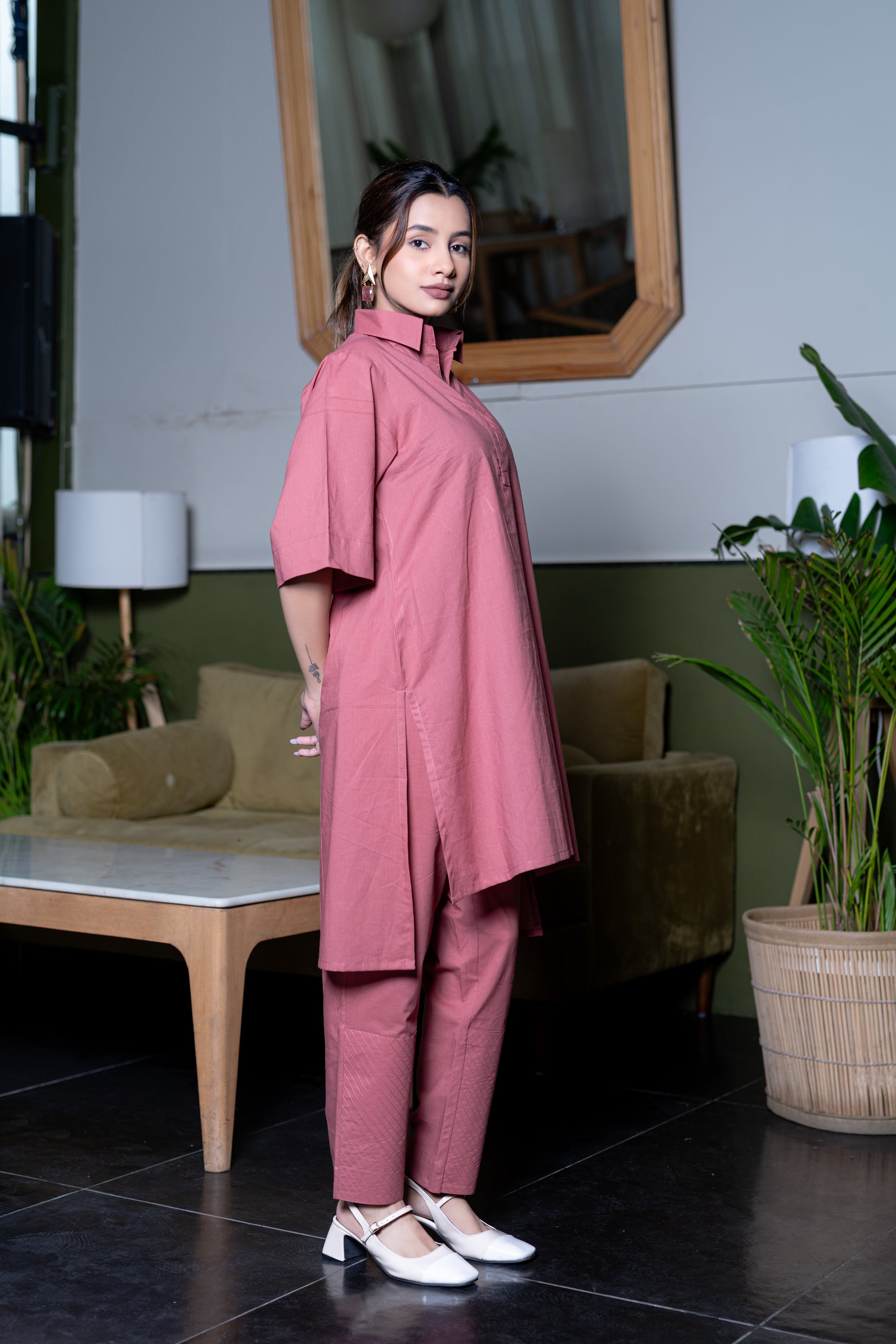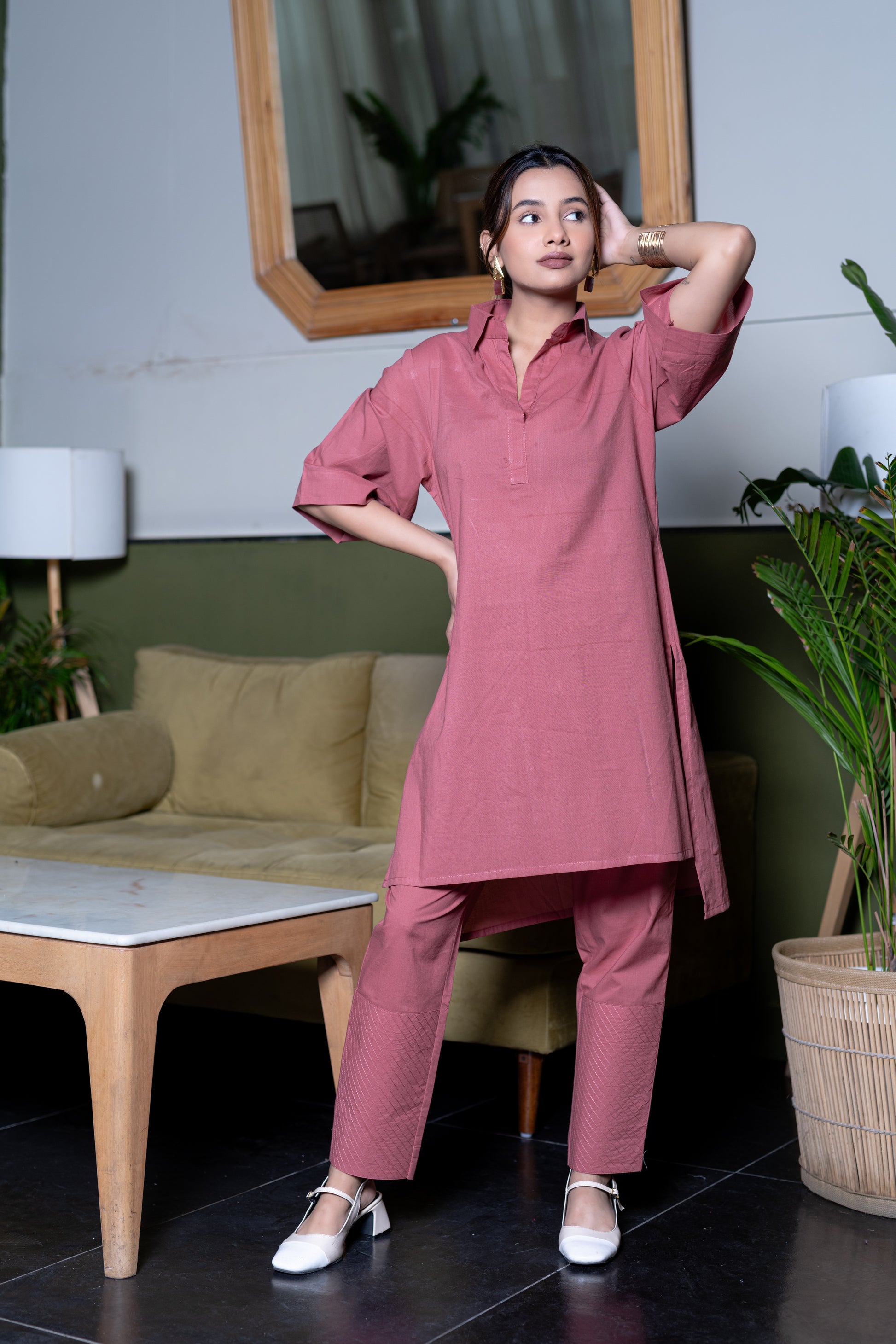 Introducing the Rust Cotton Co-Ord Set from the Moksha Collection by Savina by Imroz House. This stylish ensemble is crafted from soft, breathable cotton, making it perfect for warm-weather wear. The kurta features a classic collar neck and half sleeves, combining comfort with a touch of sophistication for a polished look.