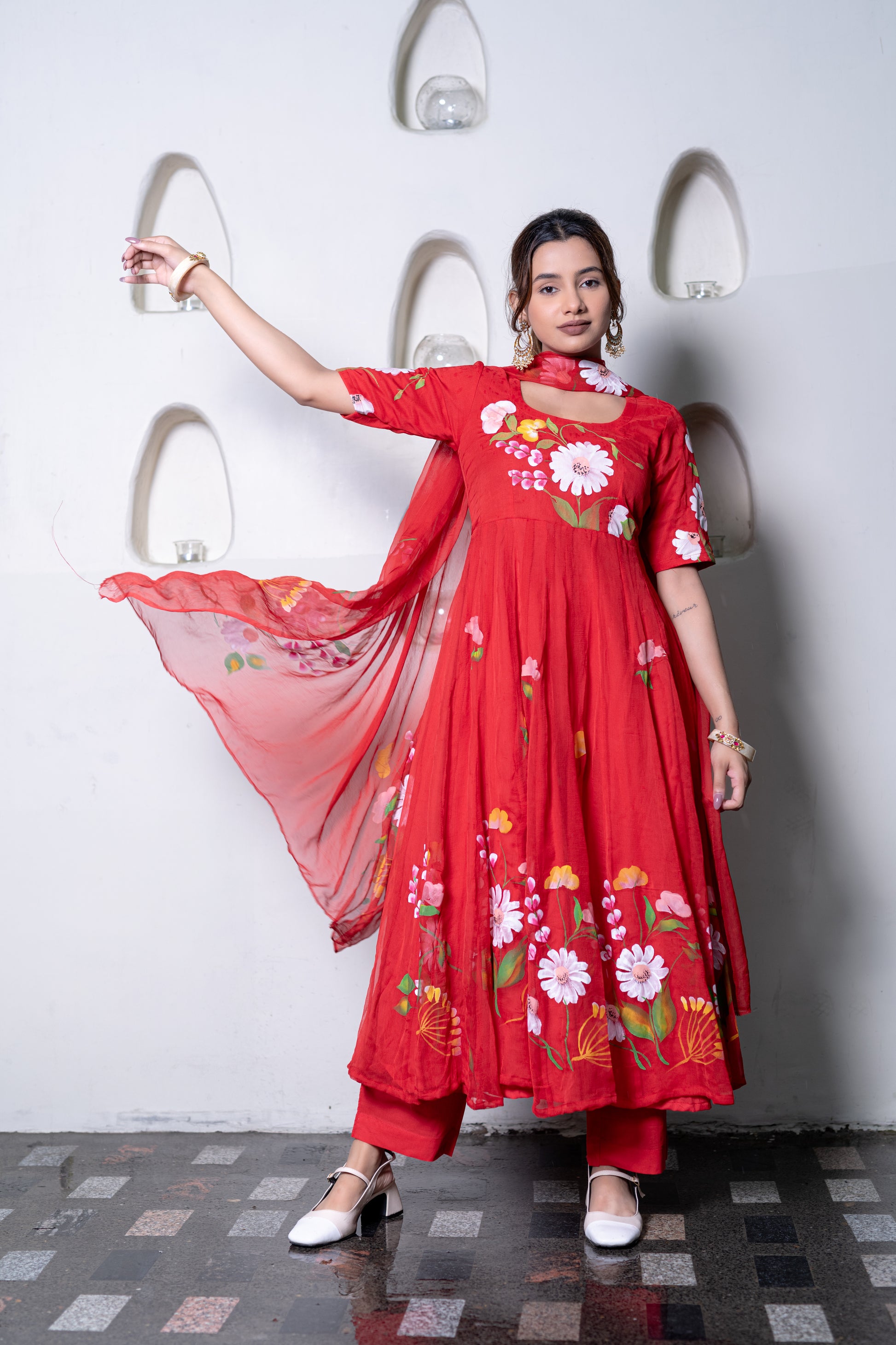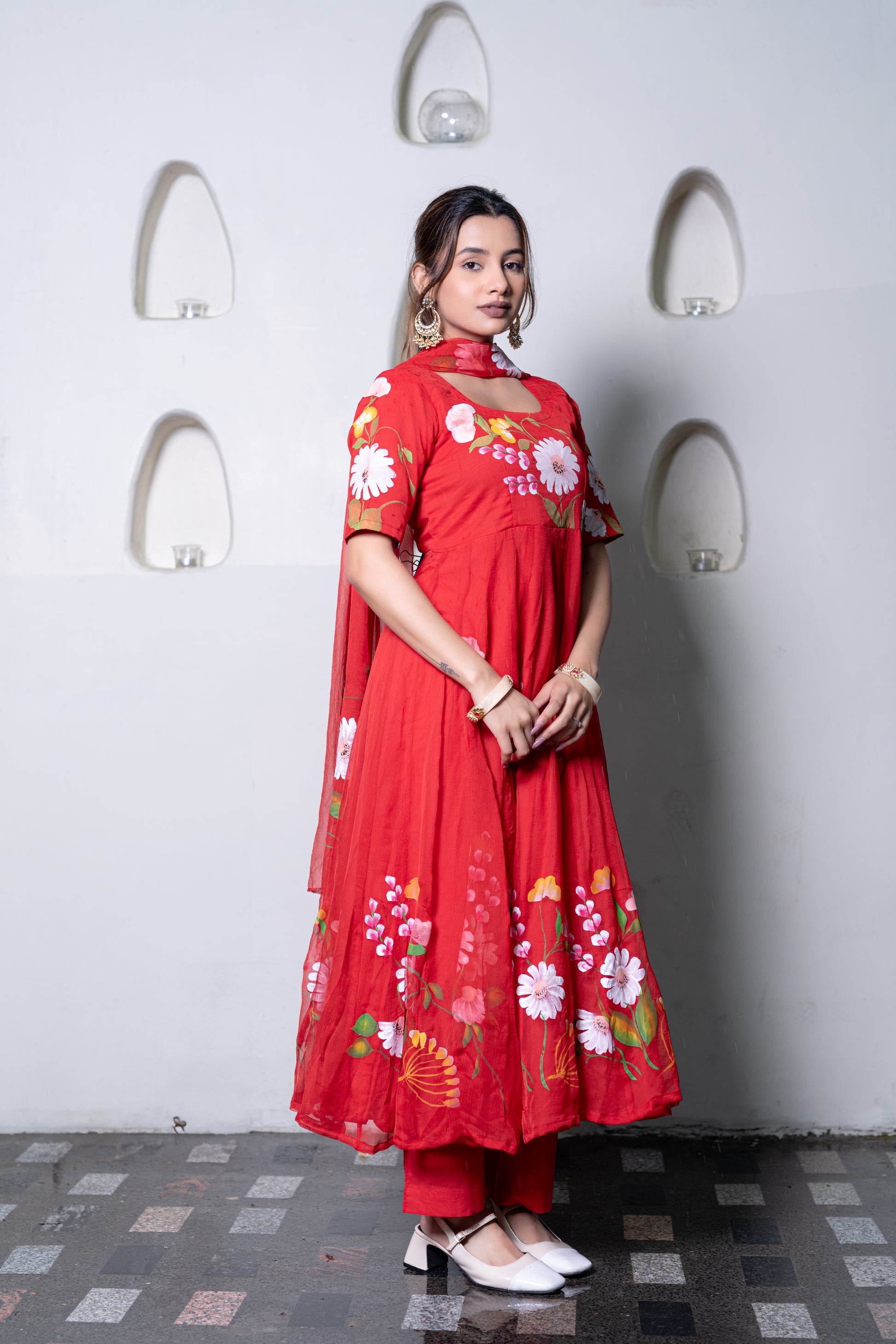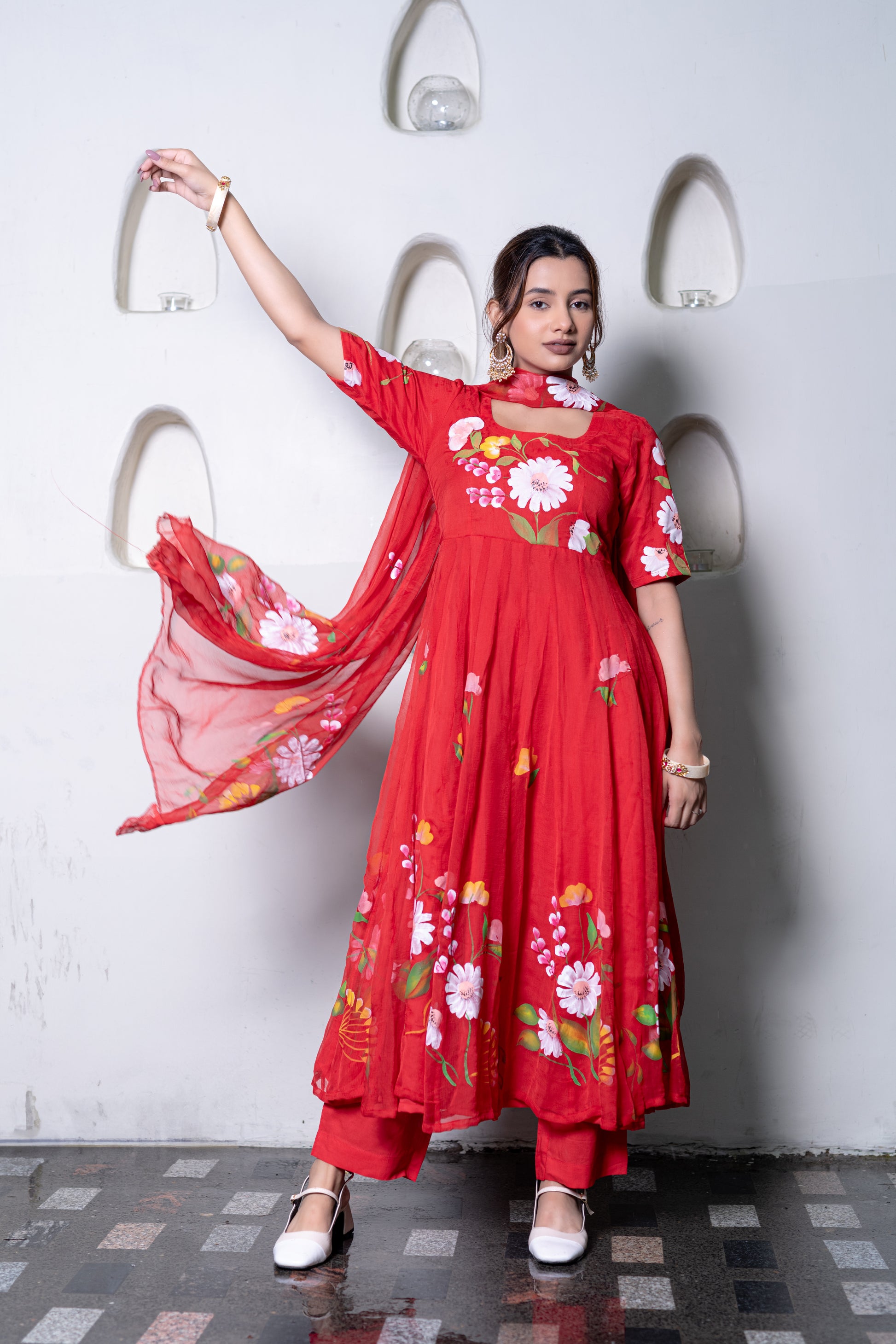 Red Chiffon Handpainted Anarkali Set – Timeless Elegance