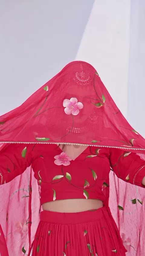 Red Chiffon Handpainted Lehenga Set – Saadgi Collection