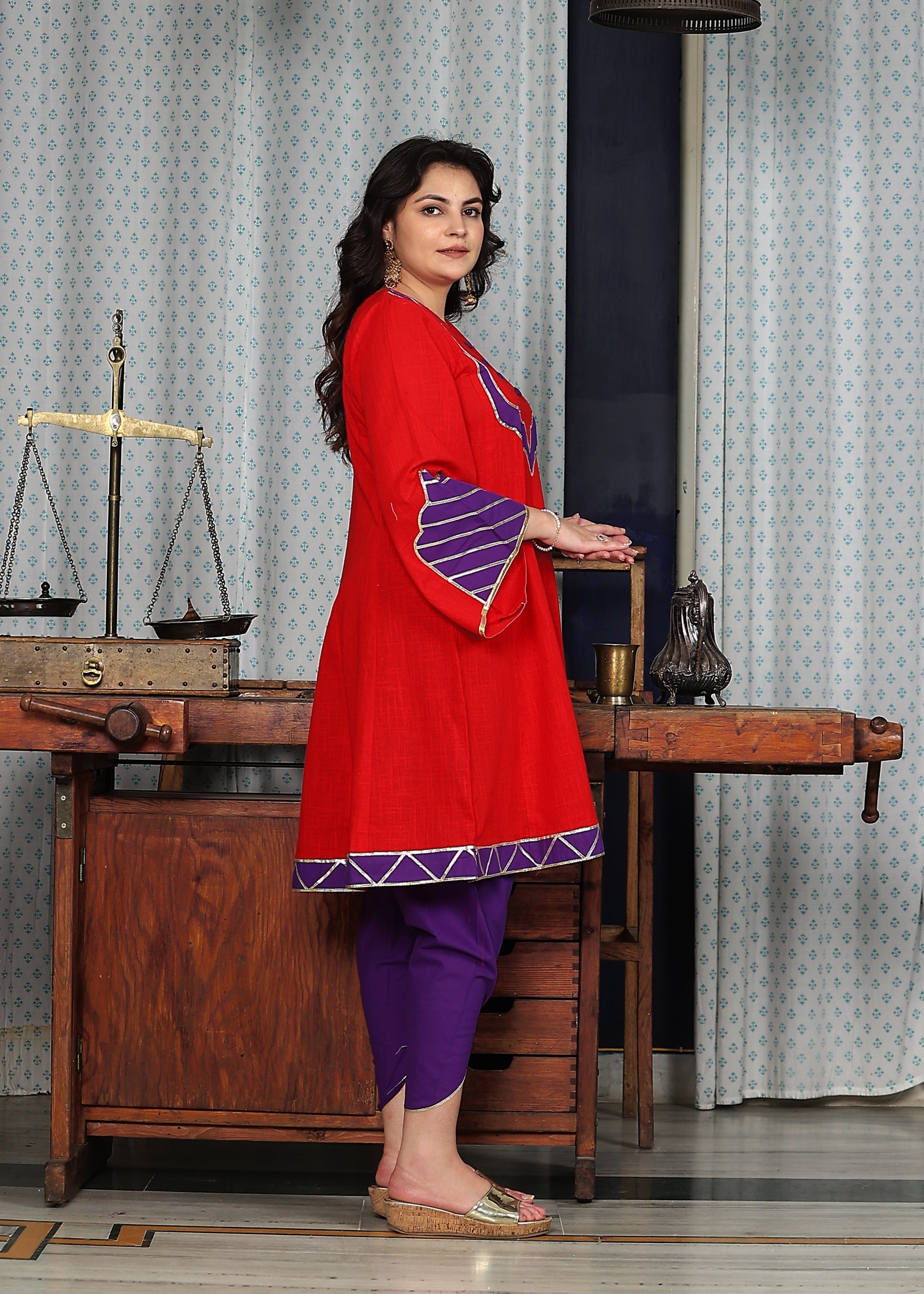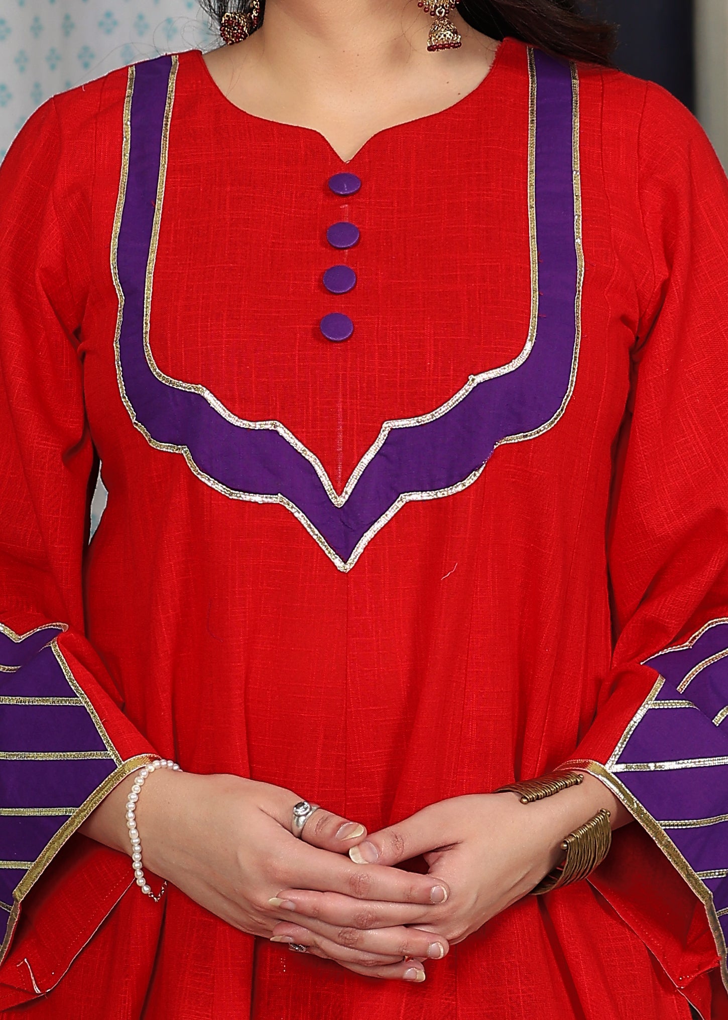 Elevate your traditional wardrobe with this red kurta paired with dhoti pants, featuring intricate gota detailing. Crafted to blend classic elegance with contemporary comfort, this ensemble offers a refined silhouette perfect for festive occasions and cultural celebrations. The gota work adds a subtle yet sophisticated shimmer, enhancing the rich red fabric. Designed for ease of movement and style, this set ensures you stand out with grace and confidence.
