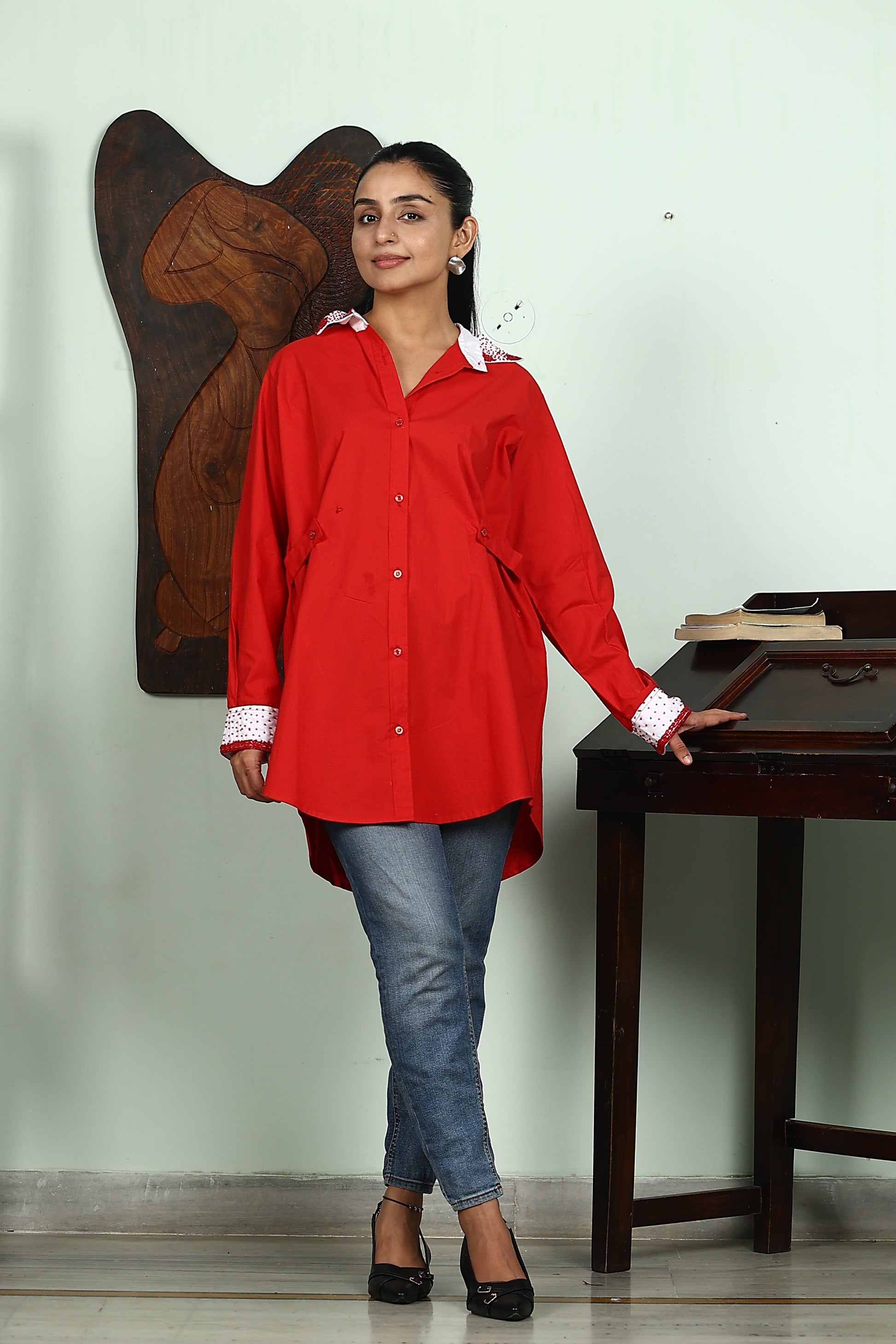 This red shirt features intricate embellishments on the collar and cuffs, adding a refined touch to its classic design. Crafted to enhance your wardrobe, it combines vibrant color with subtle detailing, making it suitable for both formal and semi-formal occasions. The embellishments provide a sophisticated accent without overwhelming the overall look, ensuring a polished and elegant appearance.