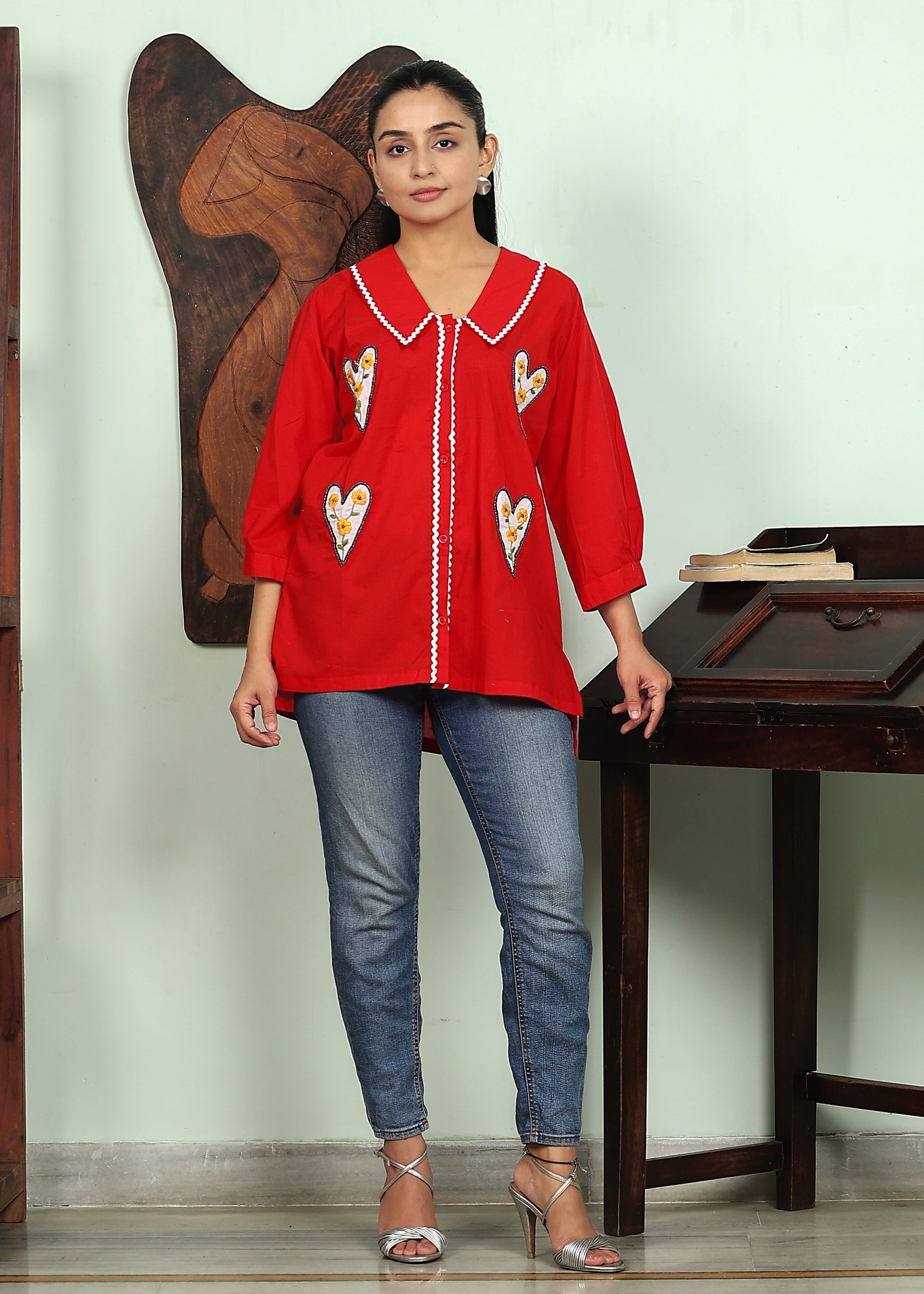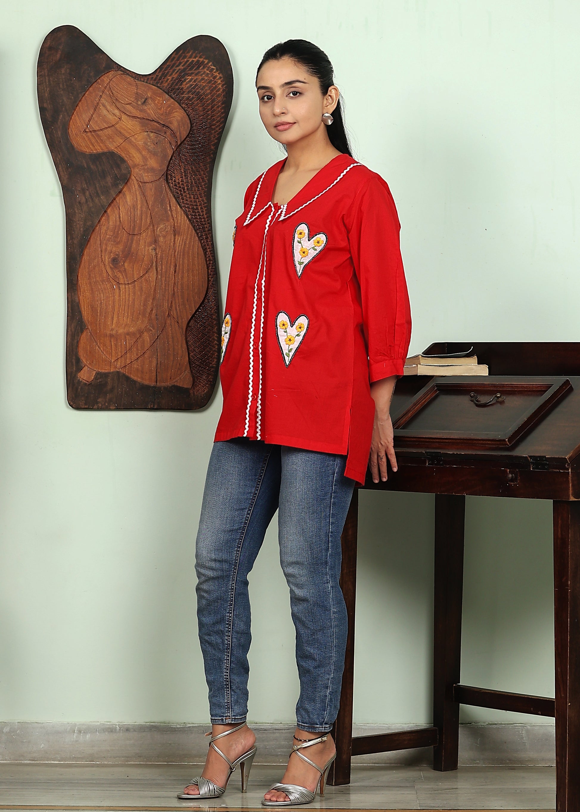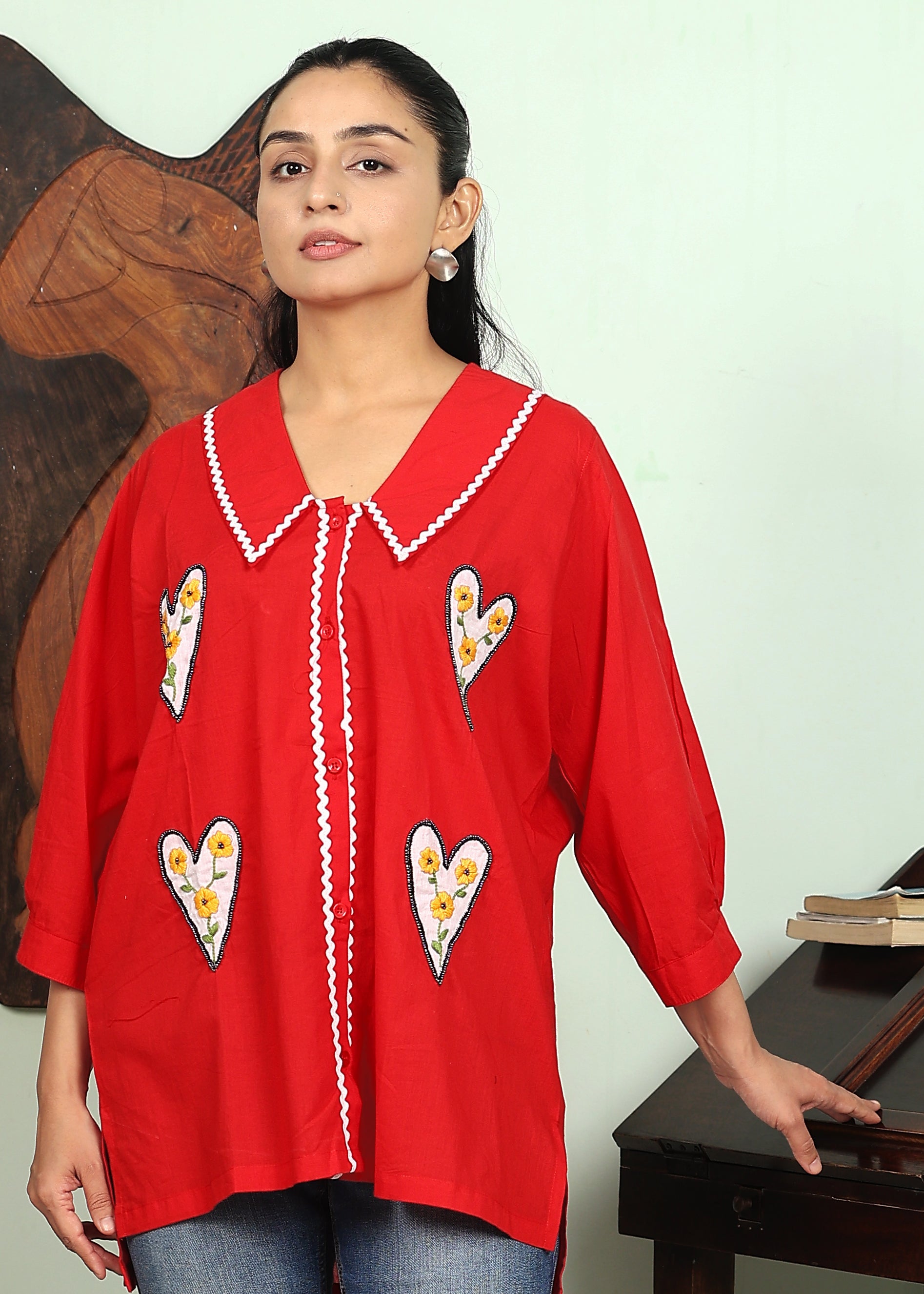 This red shirt features intricate hand embroidery combined with charming hearts patchwork, showcasing expert craftsmanship. Its detailed design adds a unique, artisanal touch, making it a standout piece for those who appreciate fine textile artistry and distinctive style.