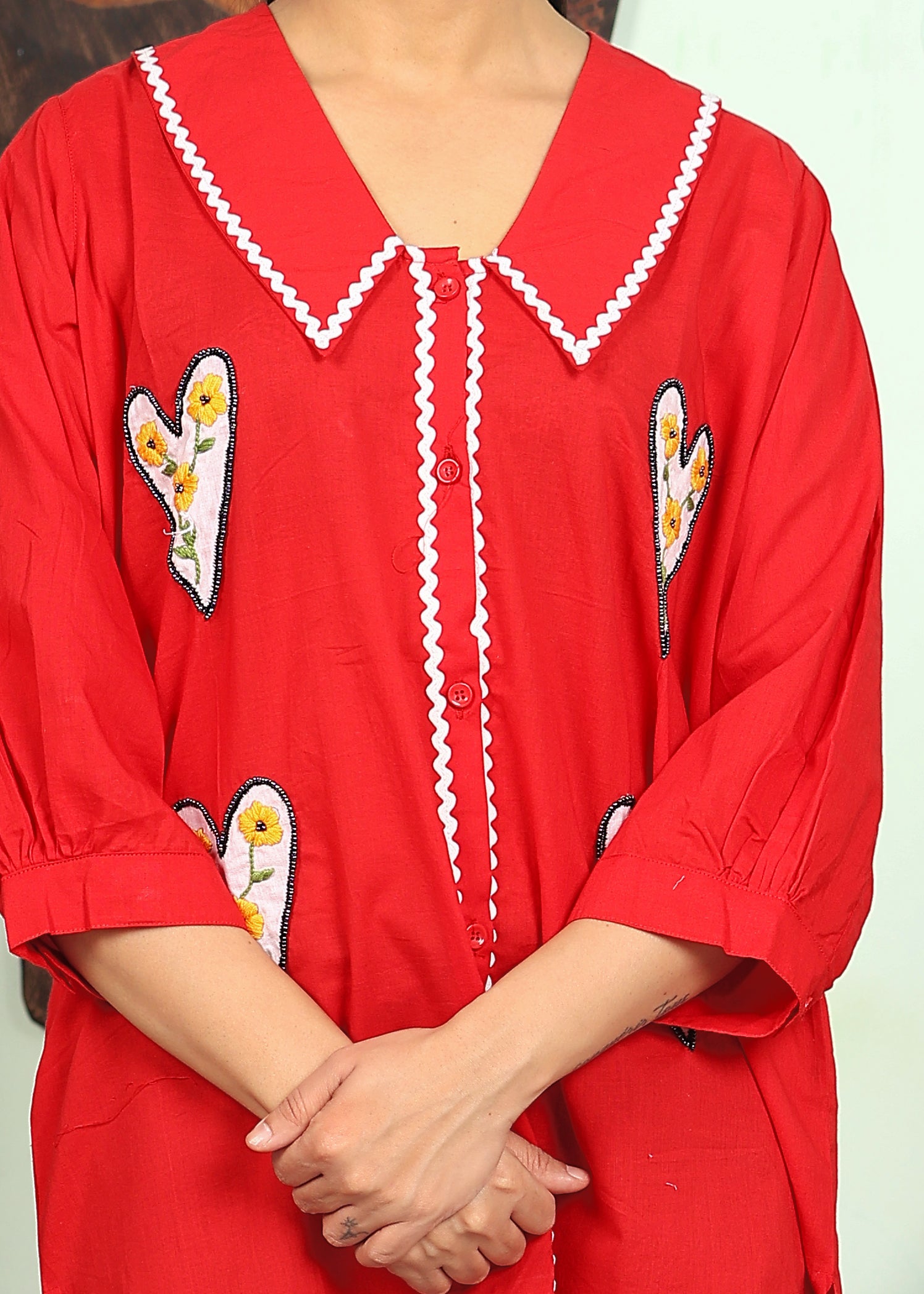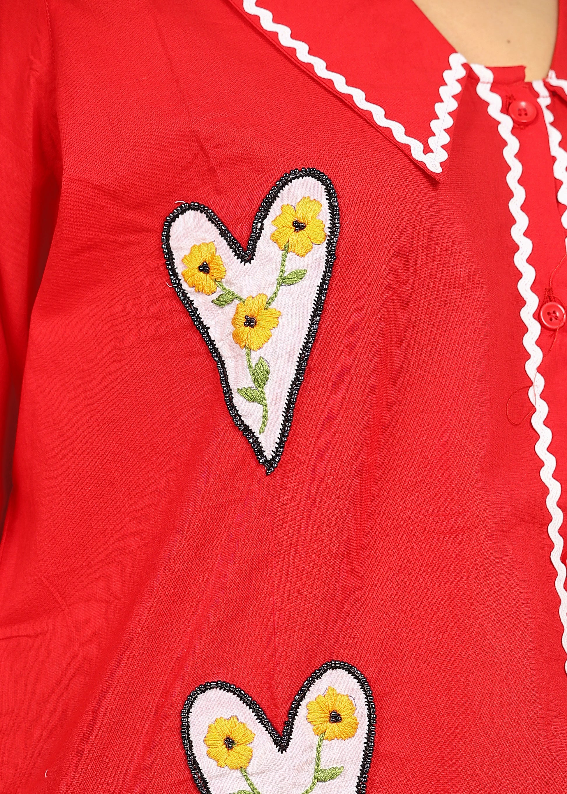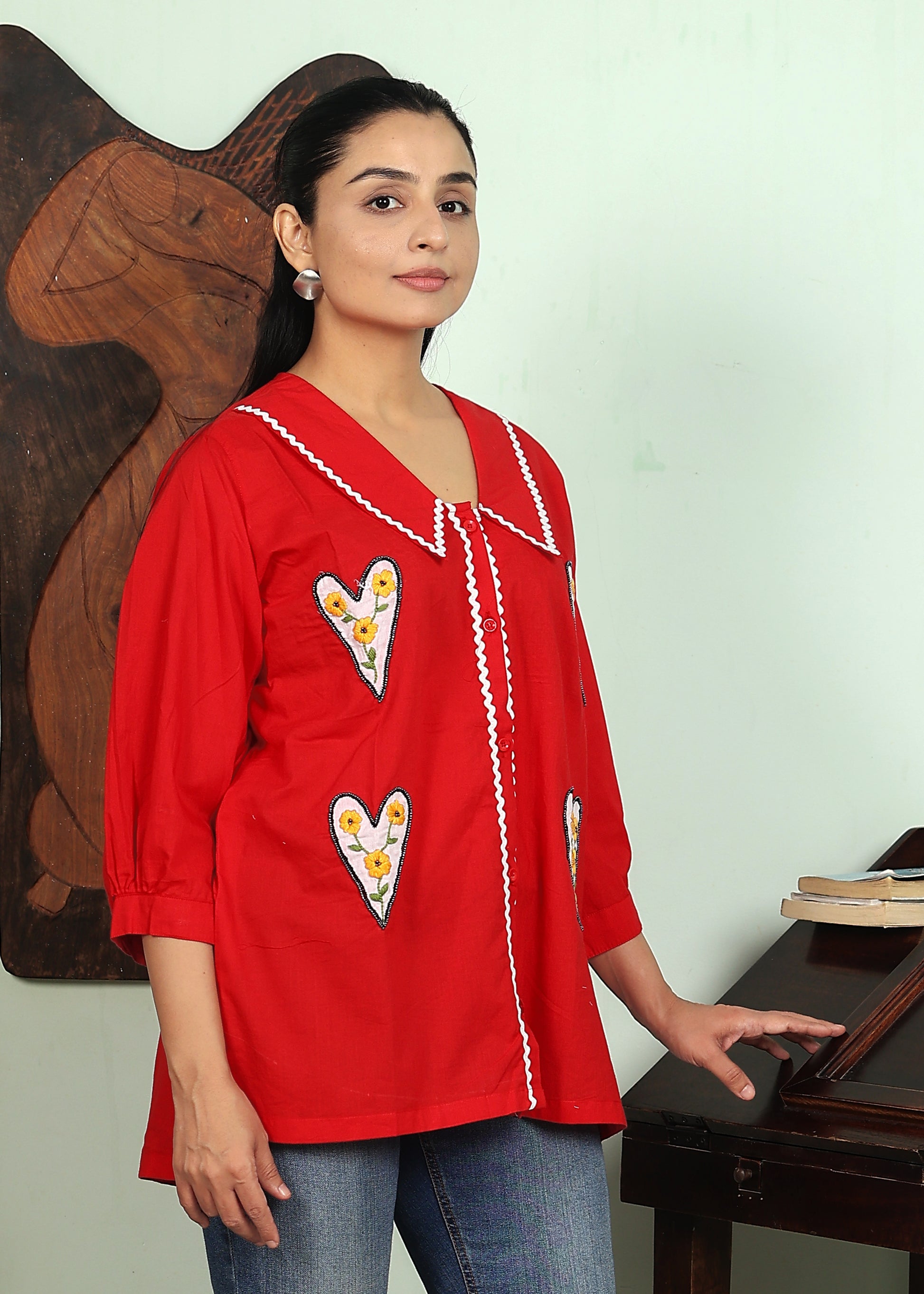 This red shirt features intricate hand embroidery combined with charming hearts patchwork, showcasing expert craftsmanship. Its detailed design adds a unique, artisanal touch, making it a standout piece for those who appreciate fine textile artistry and distinctive style.