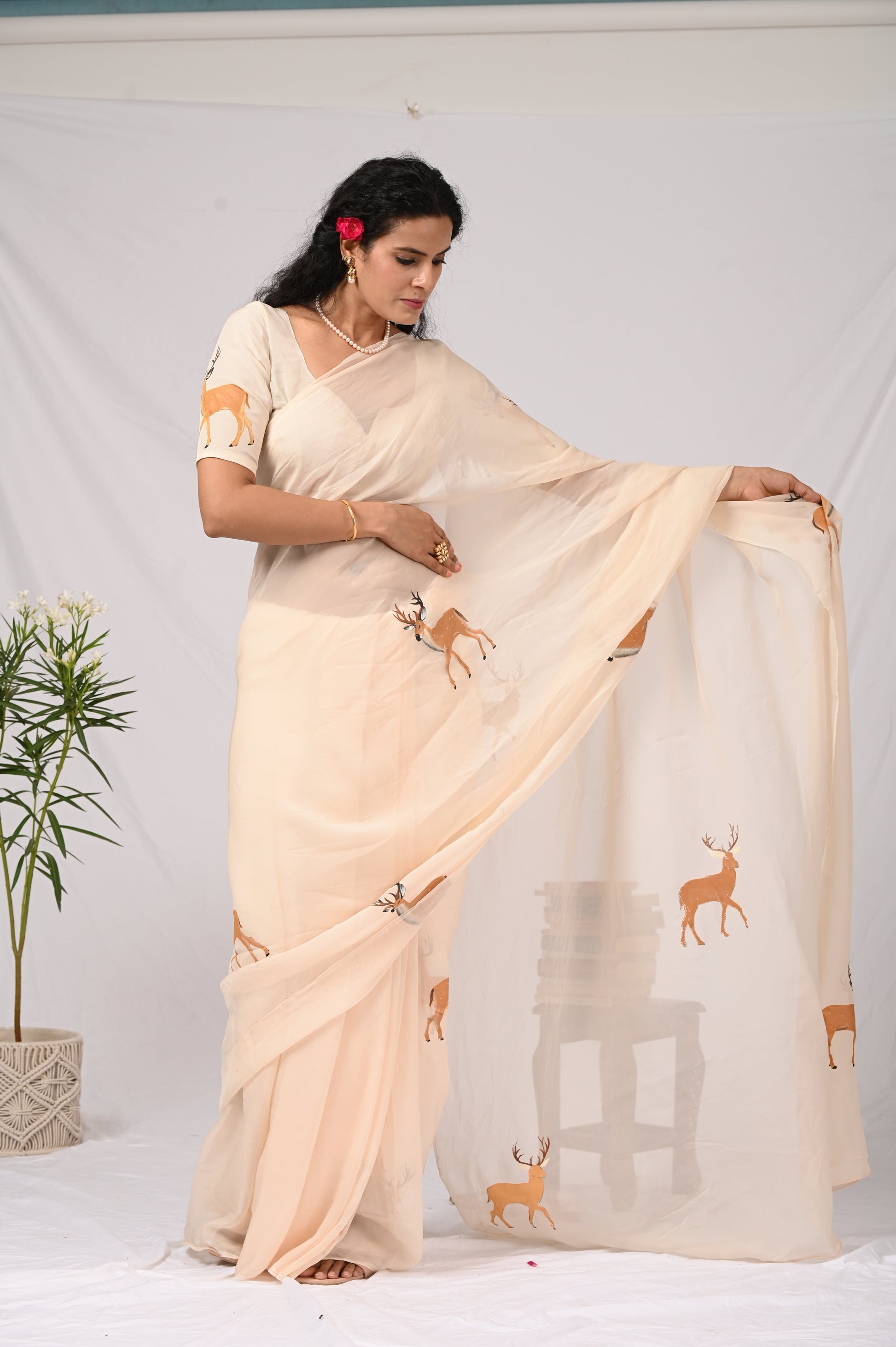 reindeer handpainted organza saree
