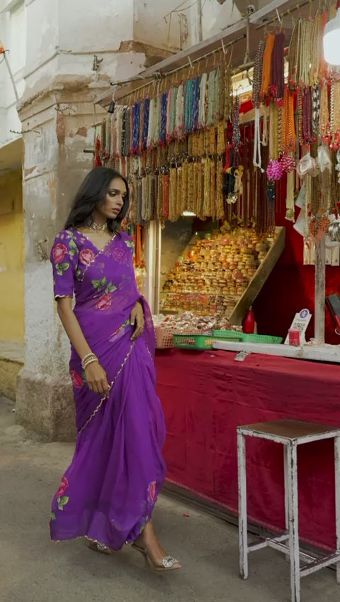 Savina Purple Handpainted & Hand-Embellished Chiffon Saree – Nirvana Collection