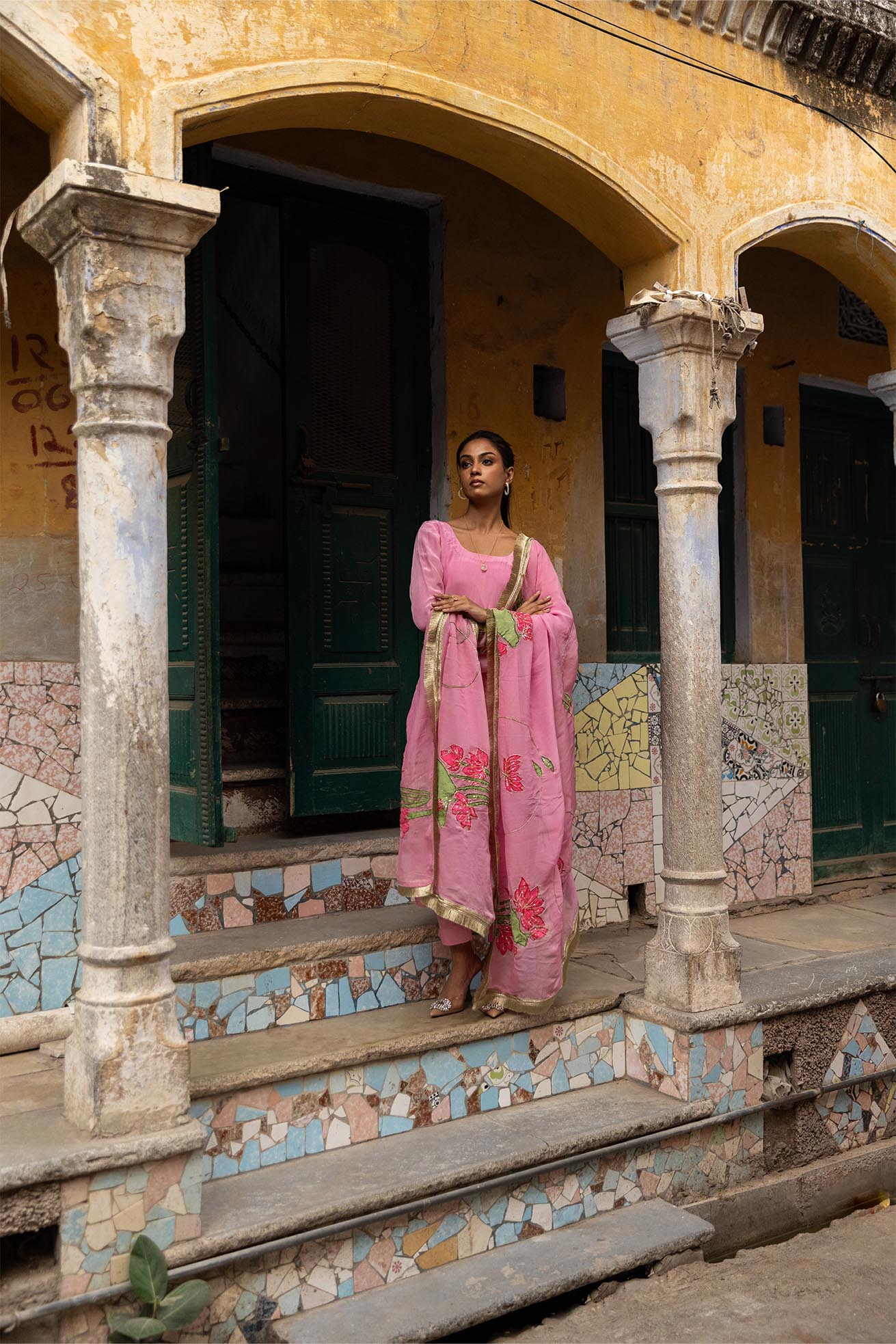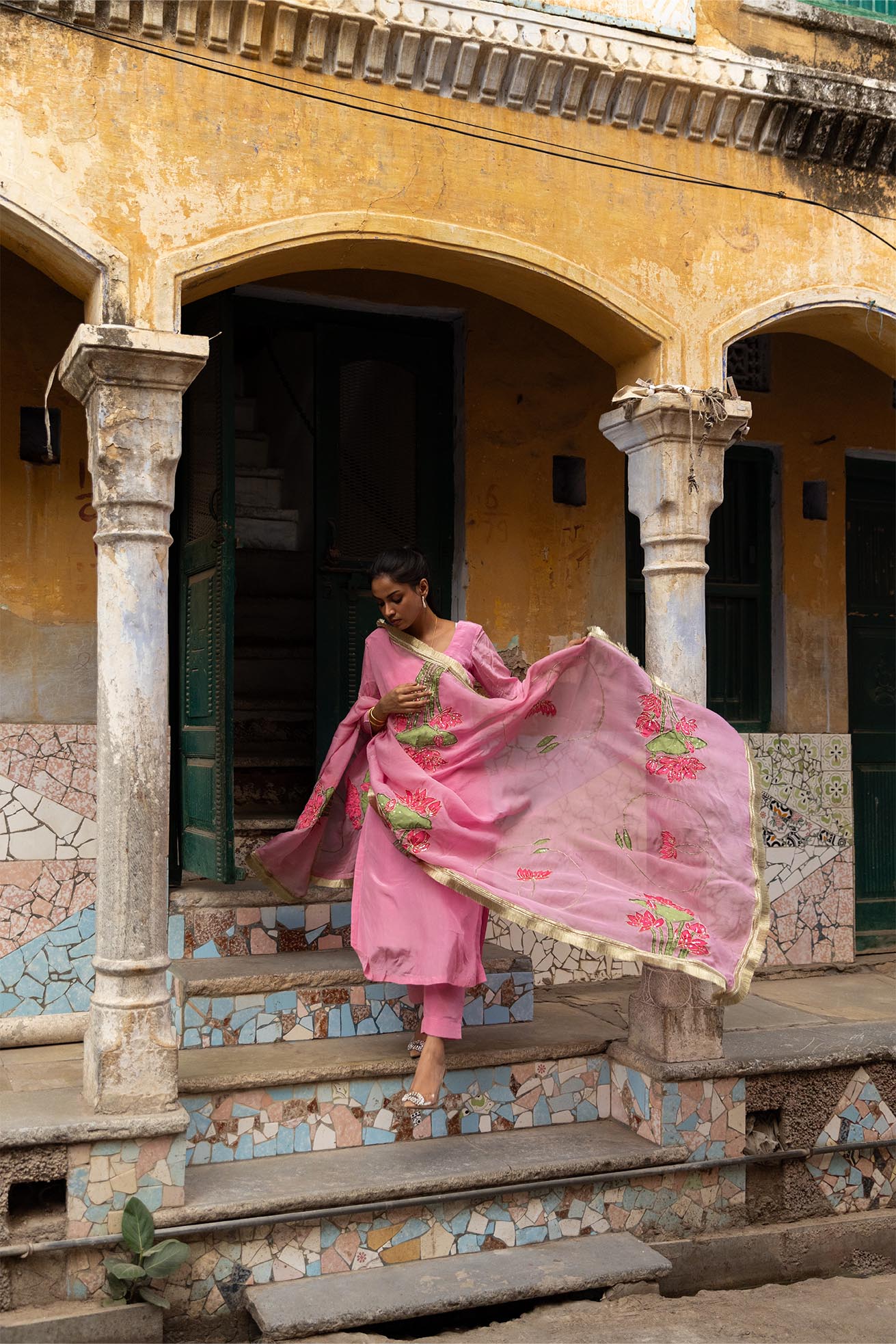 Tamara Pink Crepe & Organza Handpainted & Embellished Kurta Set