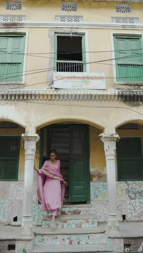 The soft pink hue enhances its timeless appeal, making it perfect for festive gatherings, intimate celebrations, and elegant soirées. A seamless blend of artisanal craftsmanship and contemporary design, this kurta set is a must-have for those who love understated luxury.
