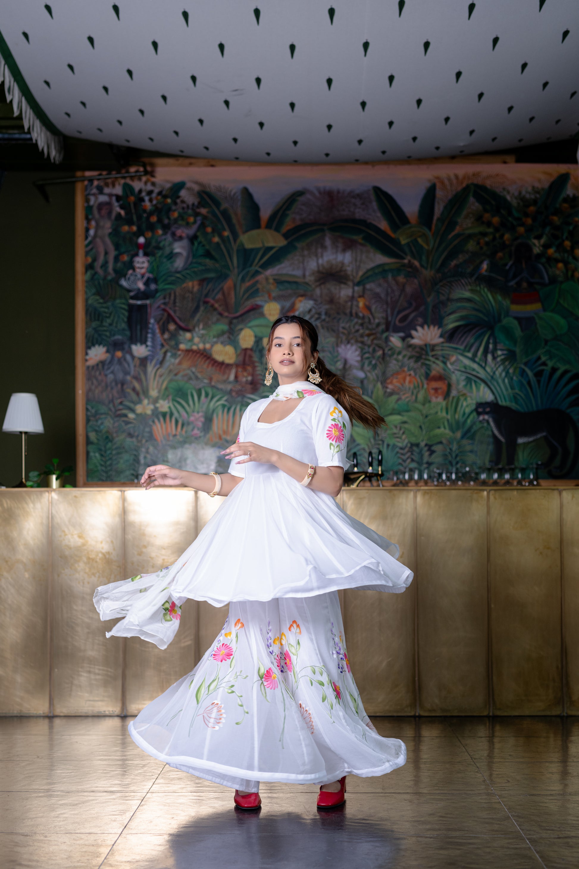 The pristine white canvas paired with delicate handpainted designs makes this set perfect for festive occasions, intimate celebrations, and refined daywear. A seamless blend of artisanal craftsmanship and contemporary elegance, this ensemble is a timeless treasure.