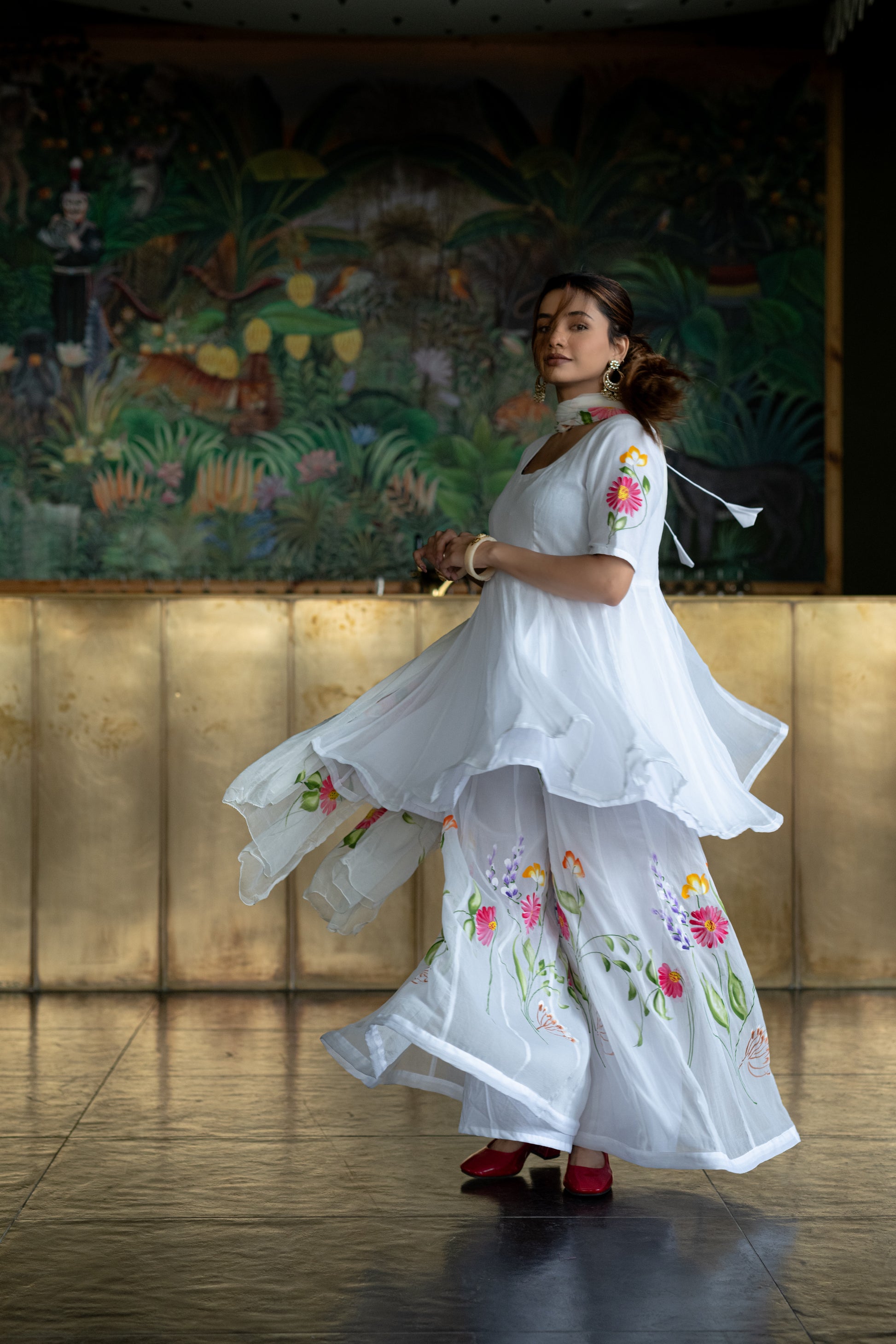 Handpainted White Chiffon Kurta with Palazzo & Dupatta – A Timeless Masterpiece