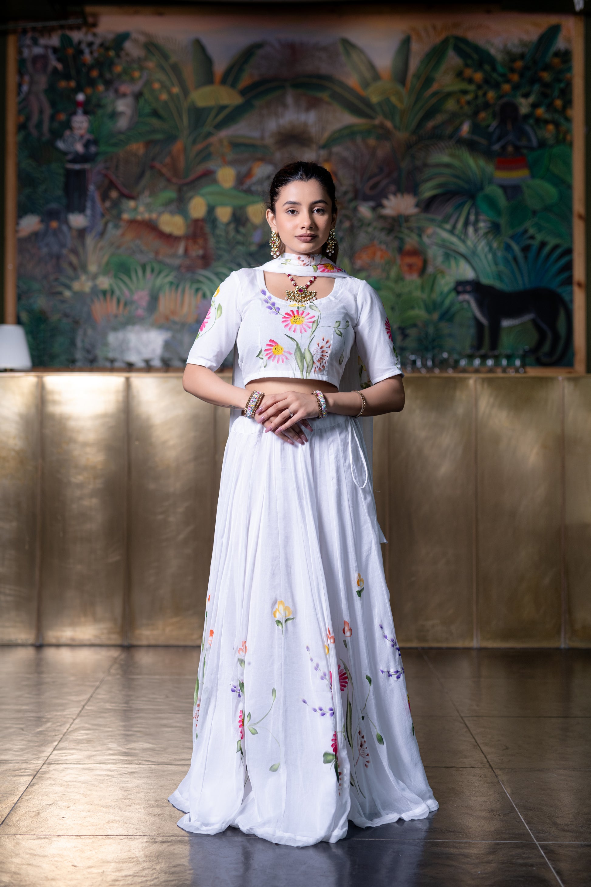 Step into a world of ethereal elegance with our White Chiffon Hand-Painted Lehenga Set, a breathtaking masterpiece from the Moksha Collection. Designed for those who appreciate artistry and craftsmanship, this lehenga is a true celebration of tradition and grace.