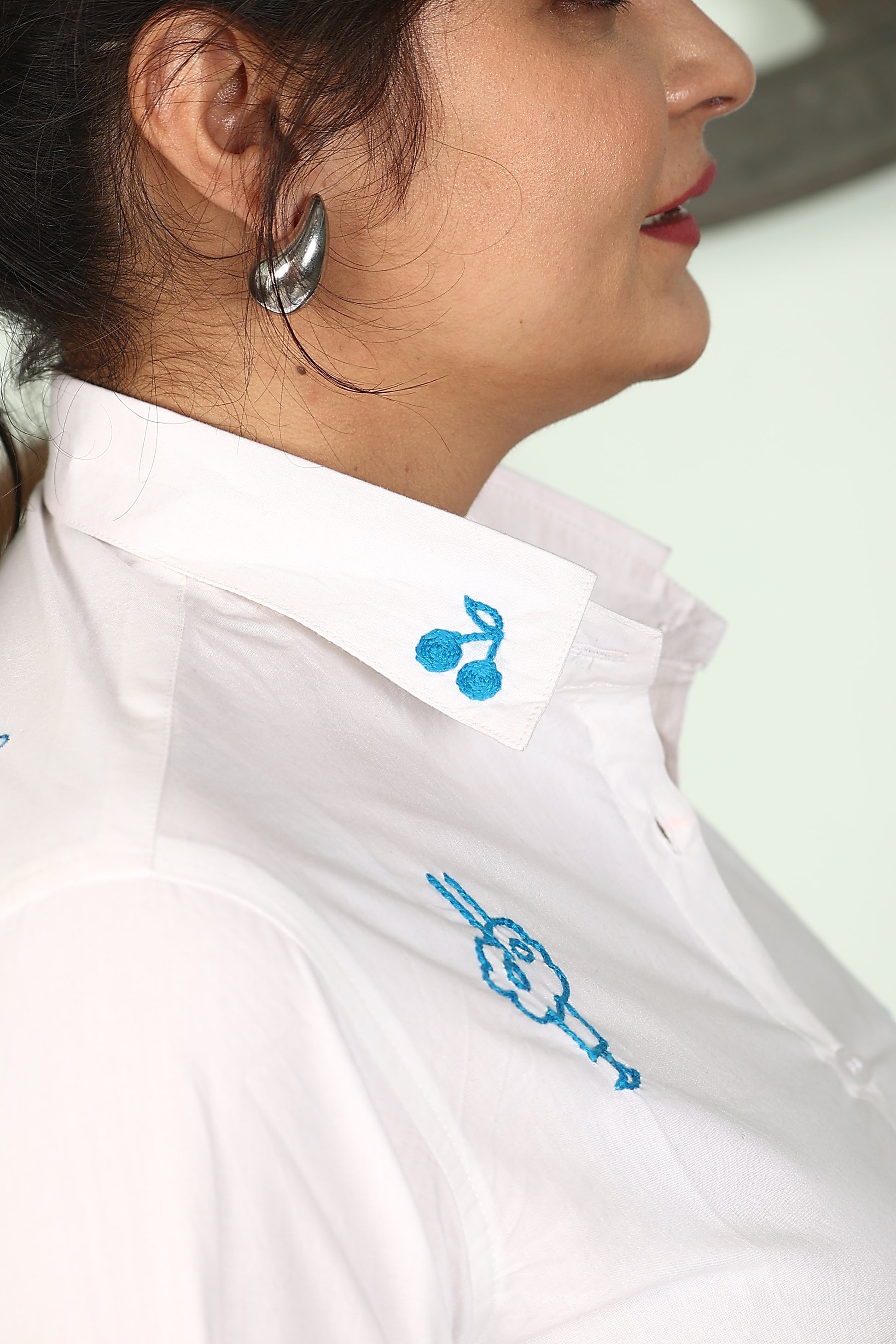 This white shirt features exquisite blue hand embroidery, showcasing skilled craftsmanship and attention to detail. Made from breathable fabric, it offers comfort and elegance, making it ideal for both casual and formal occasions. The intricate embroidery adds a unique touch, elevating your wardrobe with timeless style.