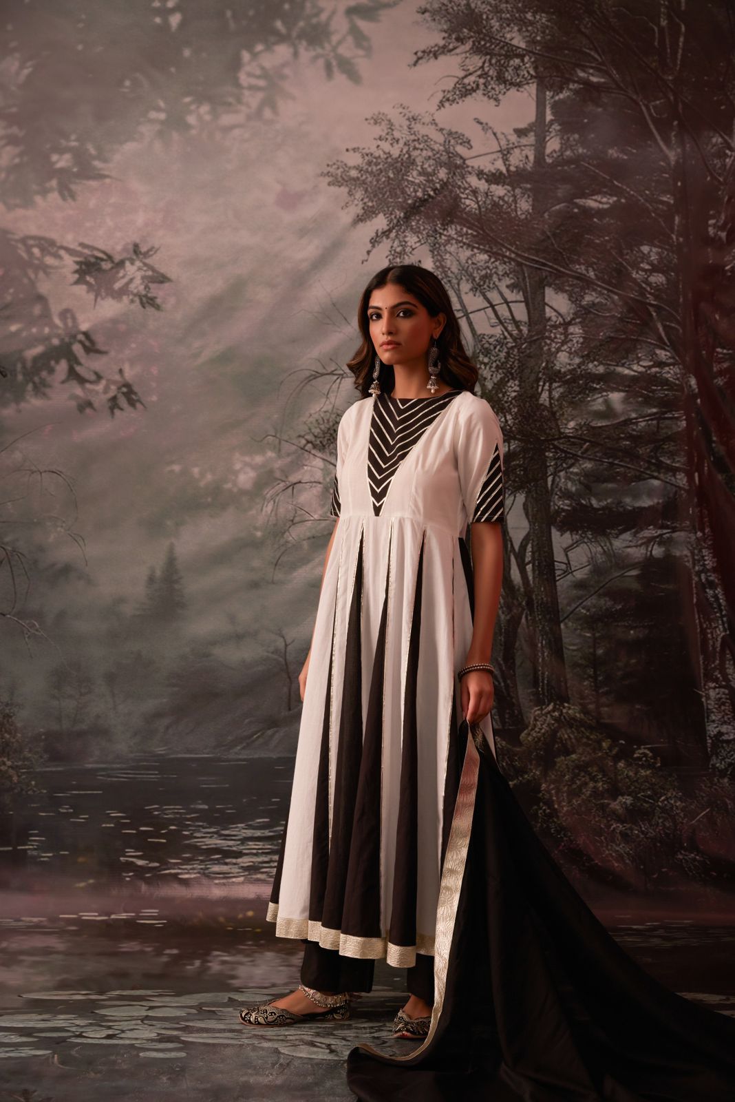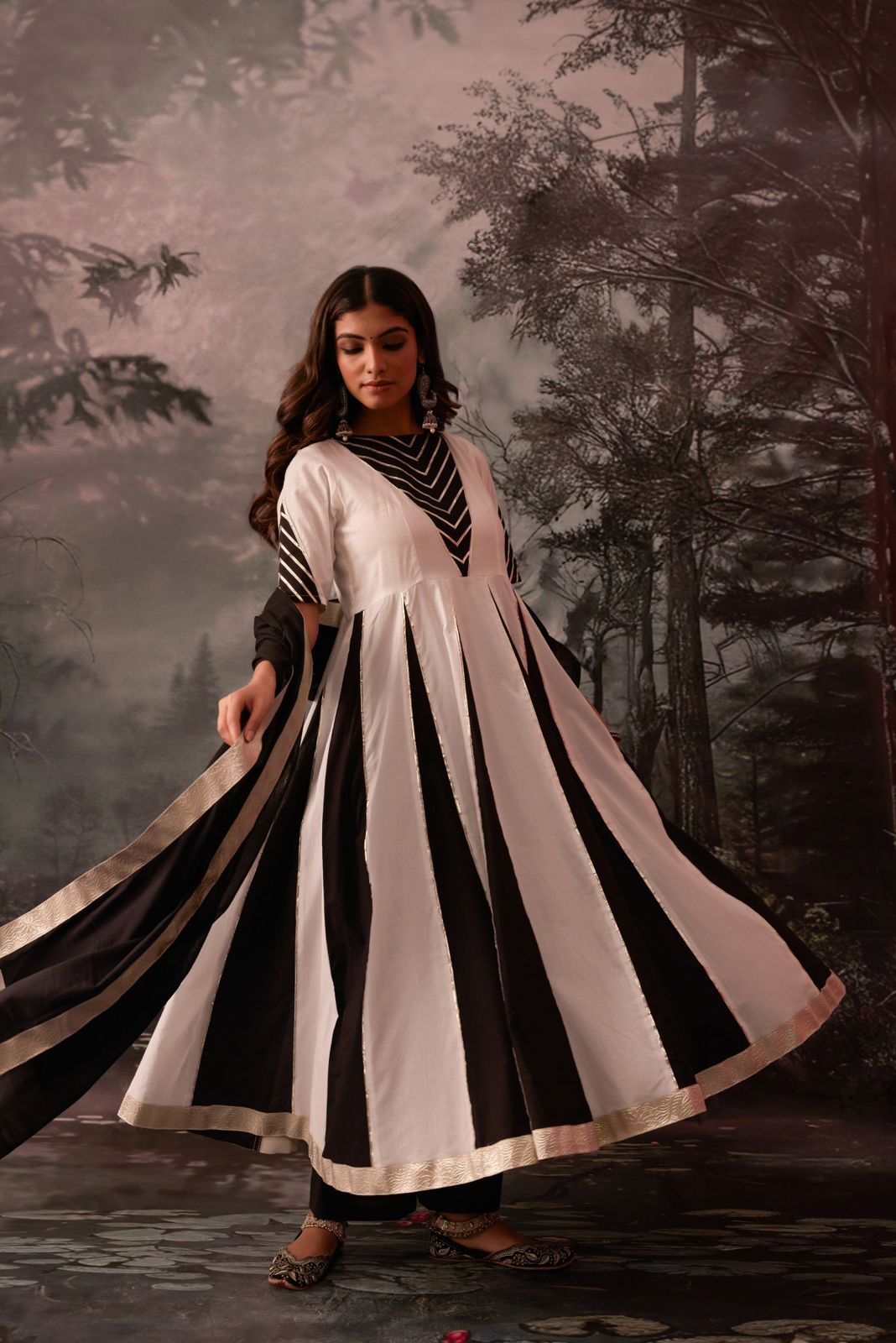 Yamika White & Black Cotton Kali Anarkali Set – Timeless Elegance