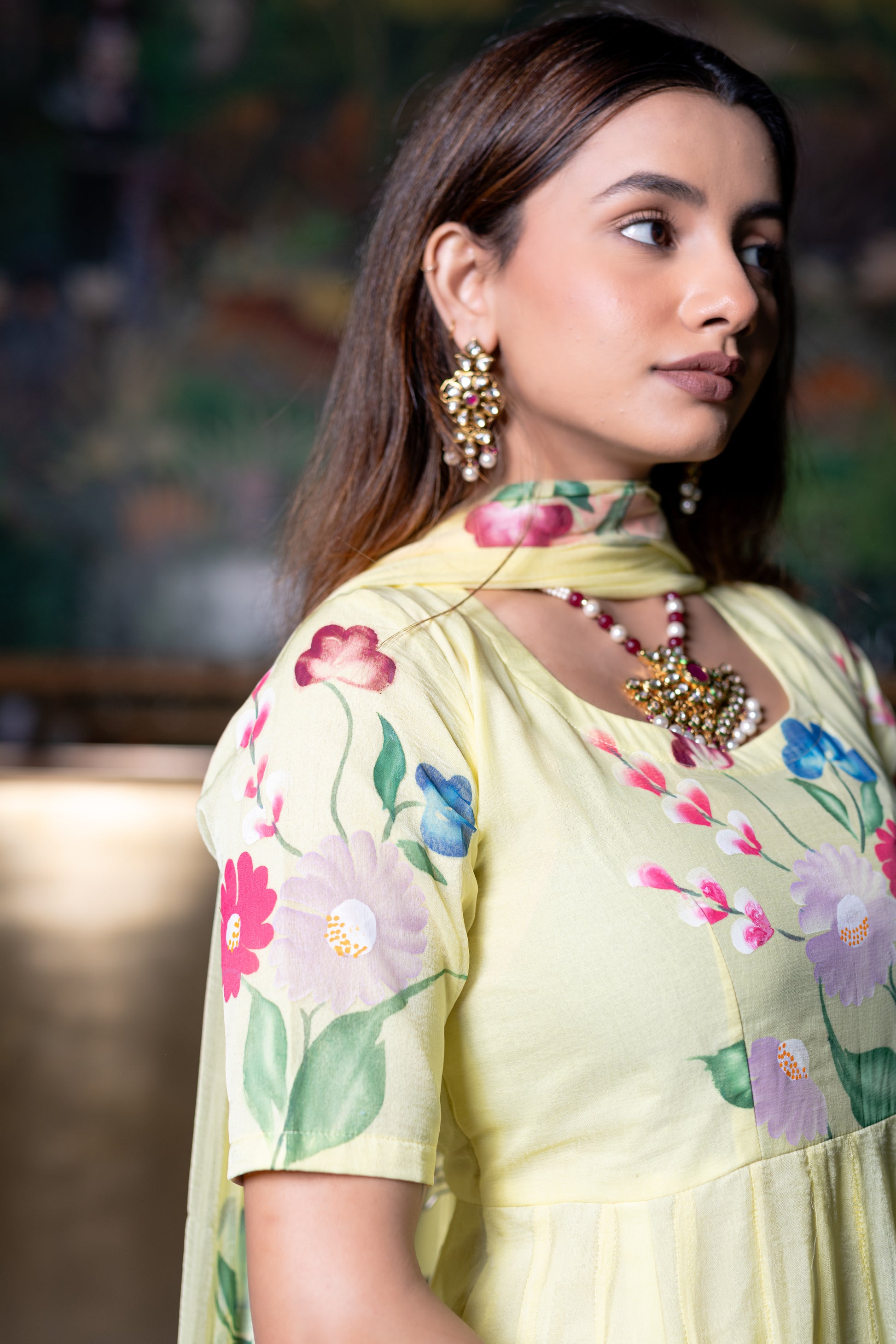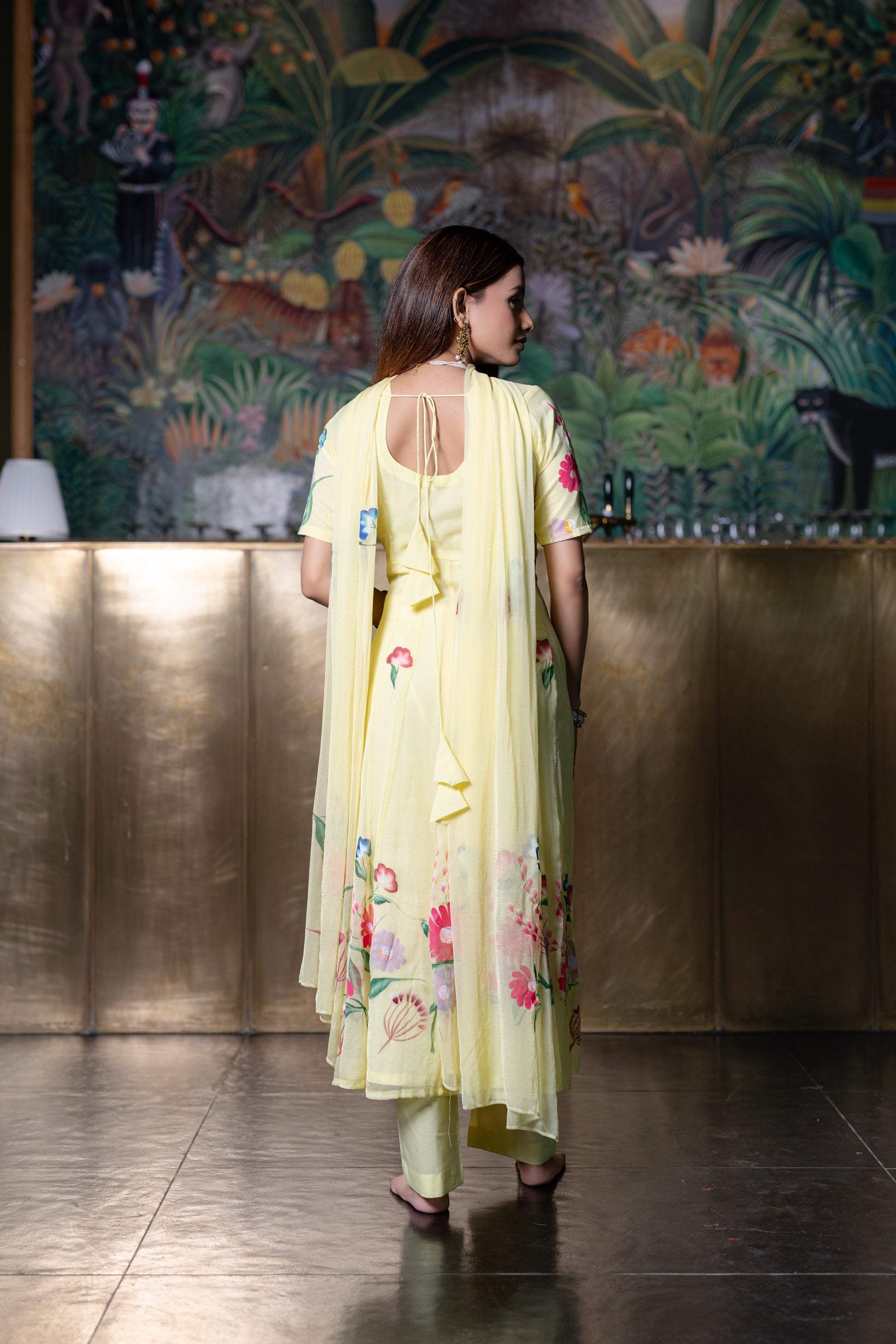 Yellow Chiffon Handpainted Anarkali Set – Radiant Elegance